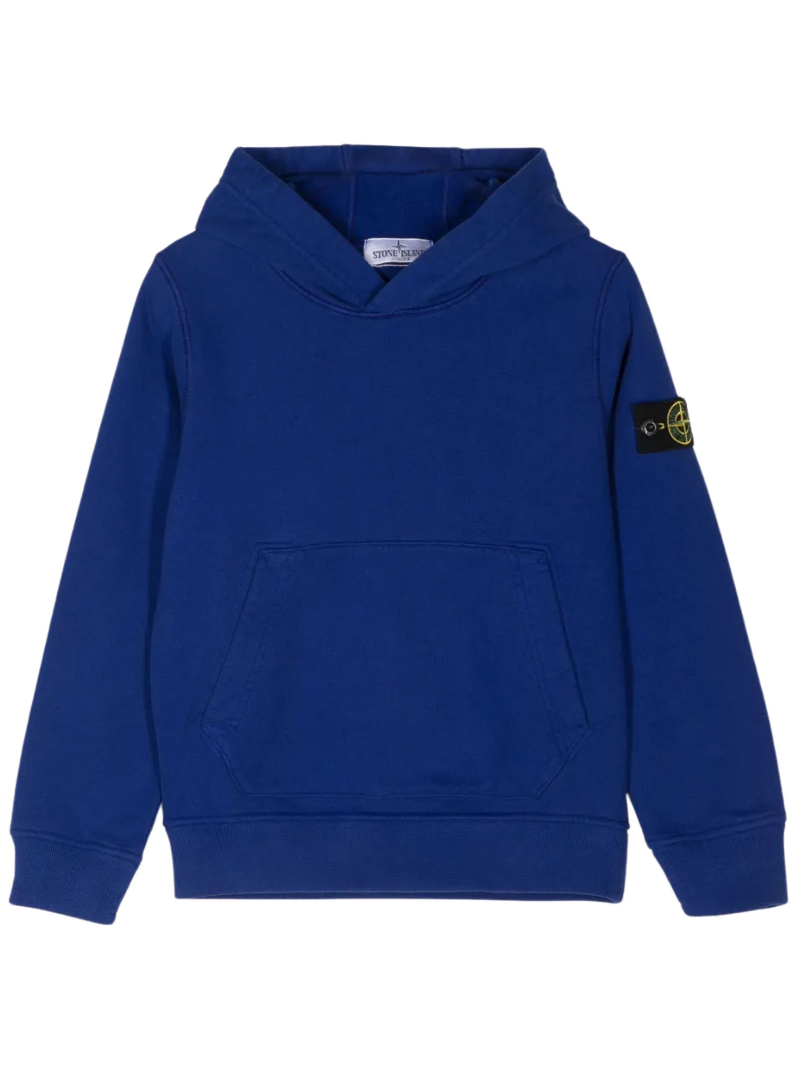 STONE ISLAND Junior blue hooded sweatshirt with long sleeves, logo applique on the arm, two kangaroo pockets, regular fit. Composition: 100% cotton.