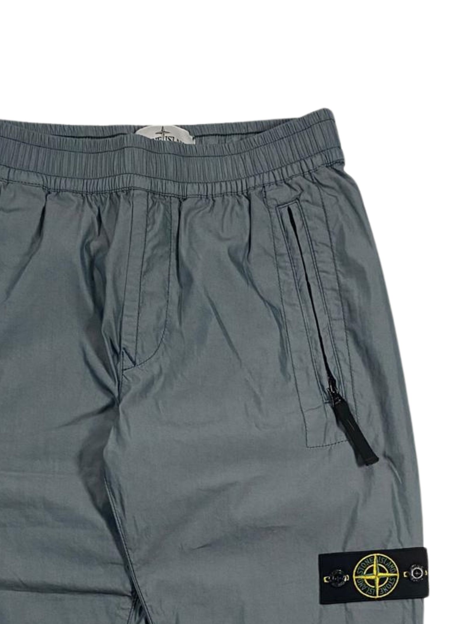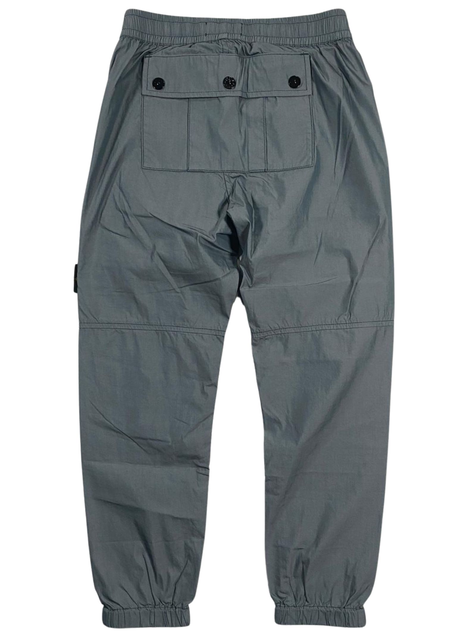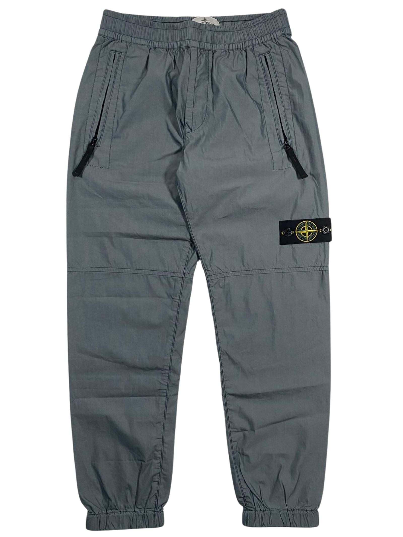 Stone Island Kids light gray cotton and nylon trousers with an elastic waistband and internal drawstring, two side zip pockets, a large central back pocket with snaps, elastic cuffs, and a regular fit. Composition: 74% cotton, 26% polyester. Made in Italy.