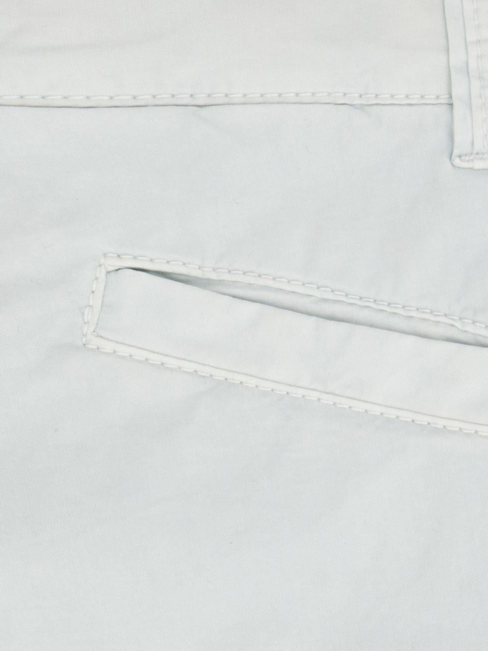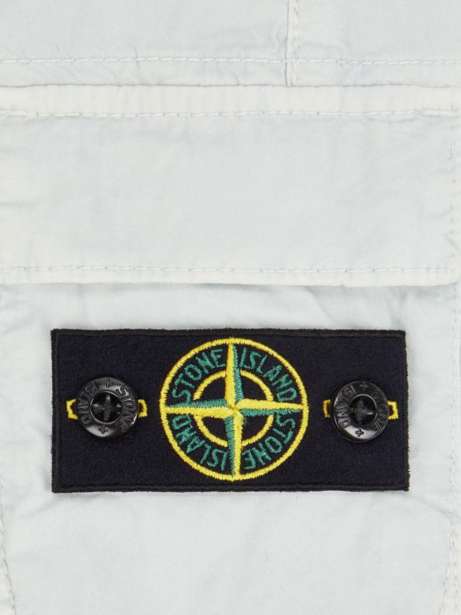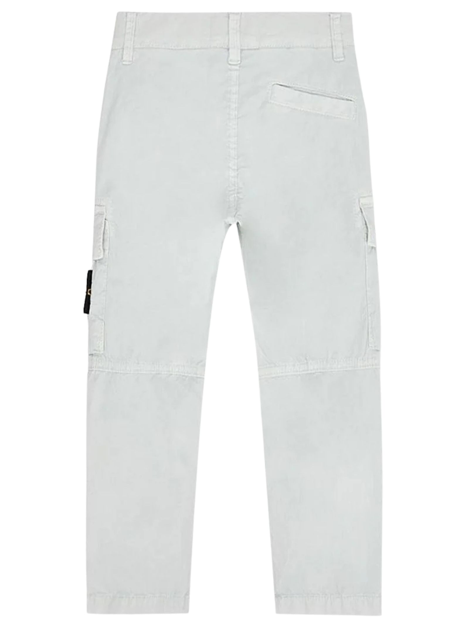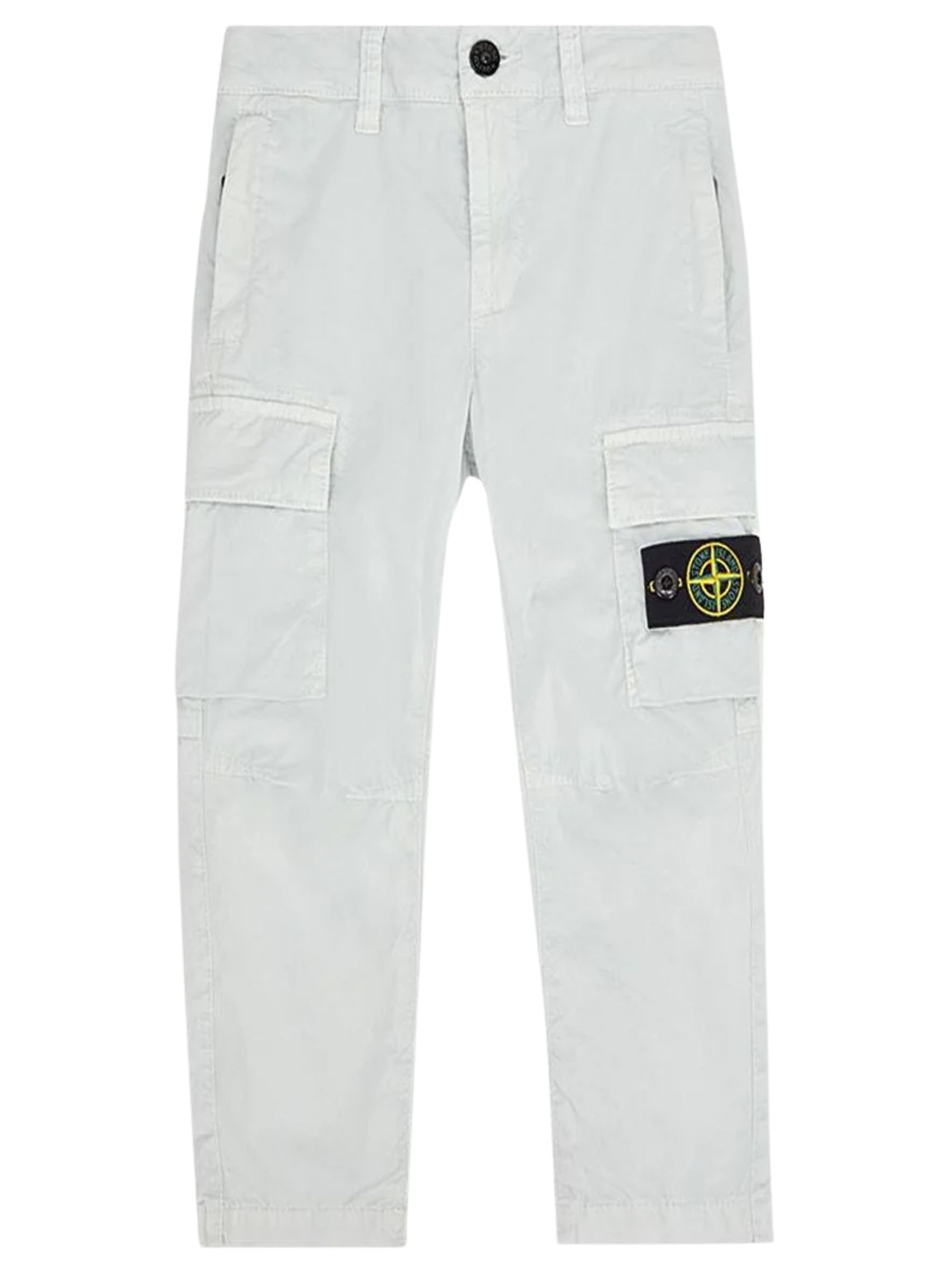 Stone Island Kids pearl grey trousers with two side zip pockets, a back slit pocket, two side cargo pockets, a logo patch, and belt loops. Composition: 97% cotton, 3% elastane.