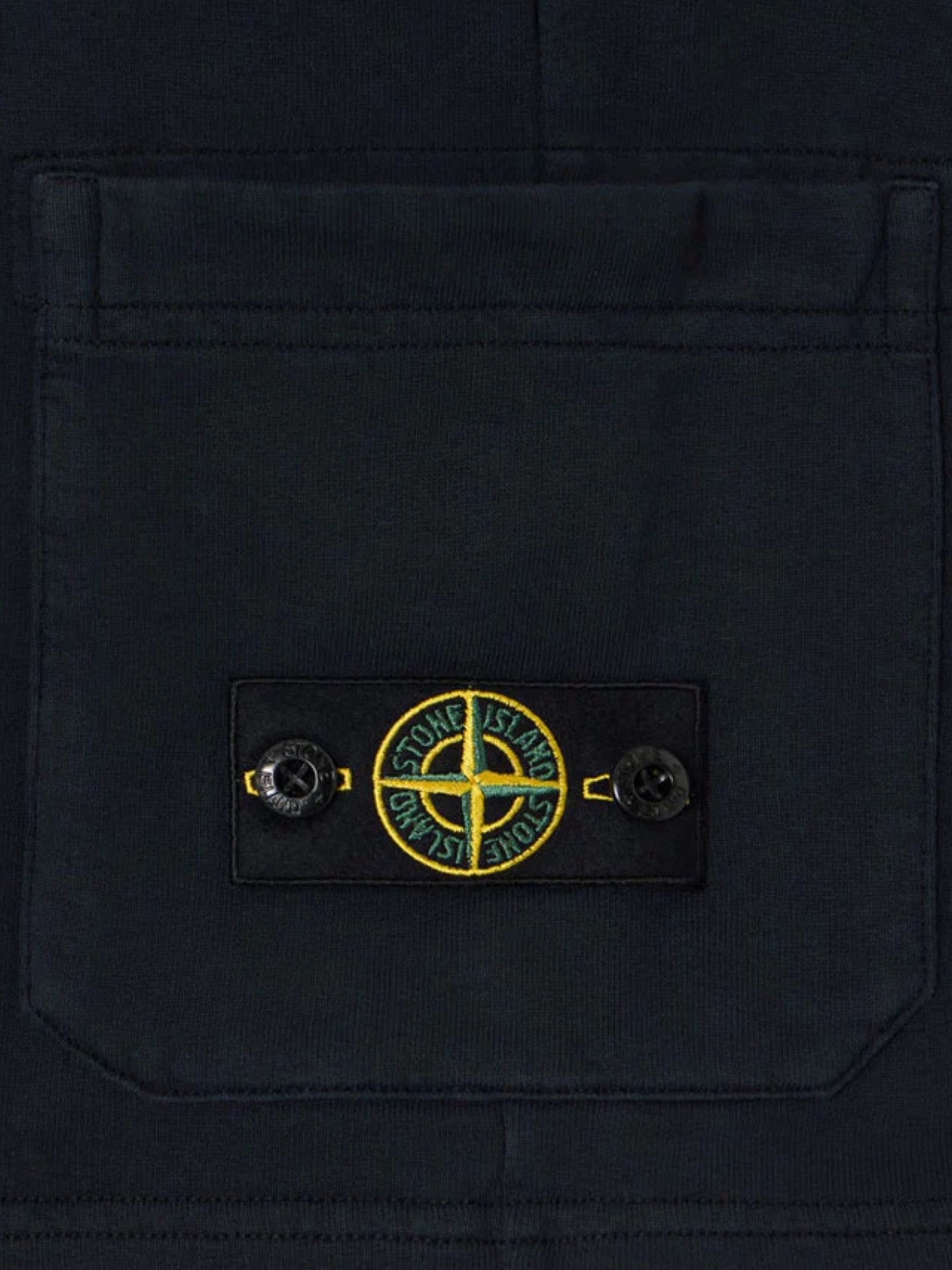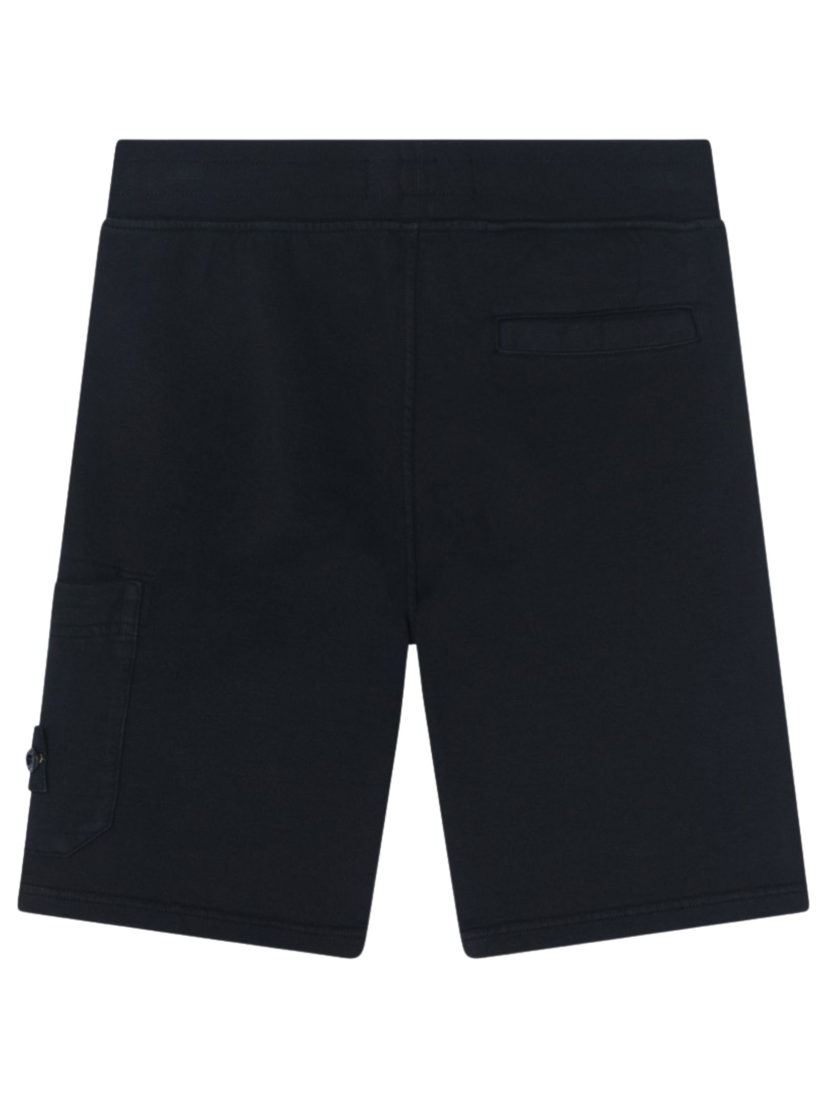 Stone Island Kids black Bermuda shorts with an elastic waistband, internal drawstring, two side pockets, a back slit pocket, and a side patch pocket with an applied logo. Composition: 100% cotton.