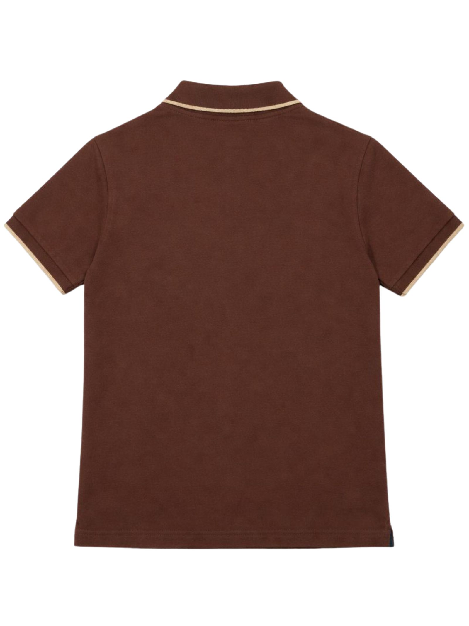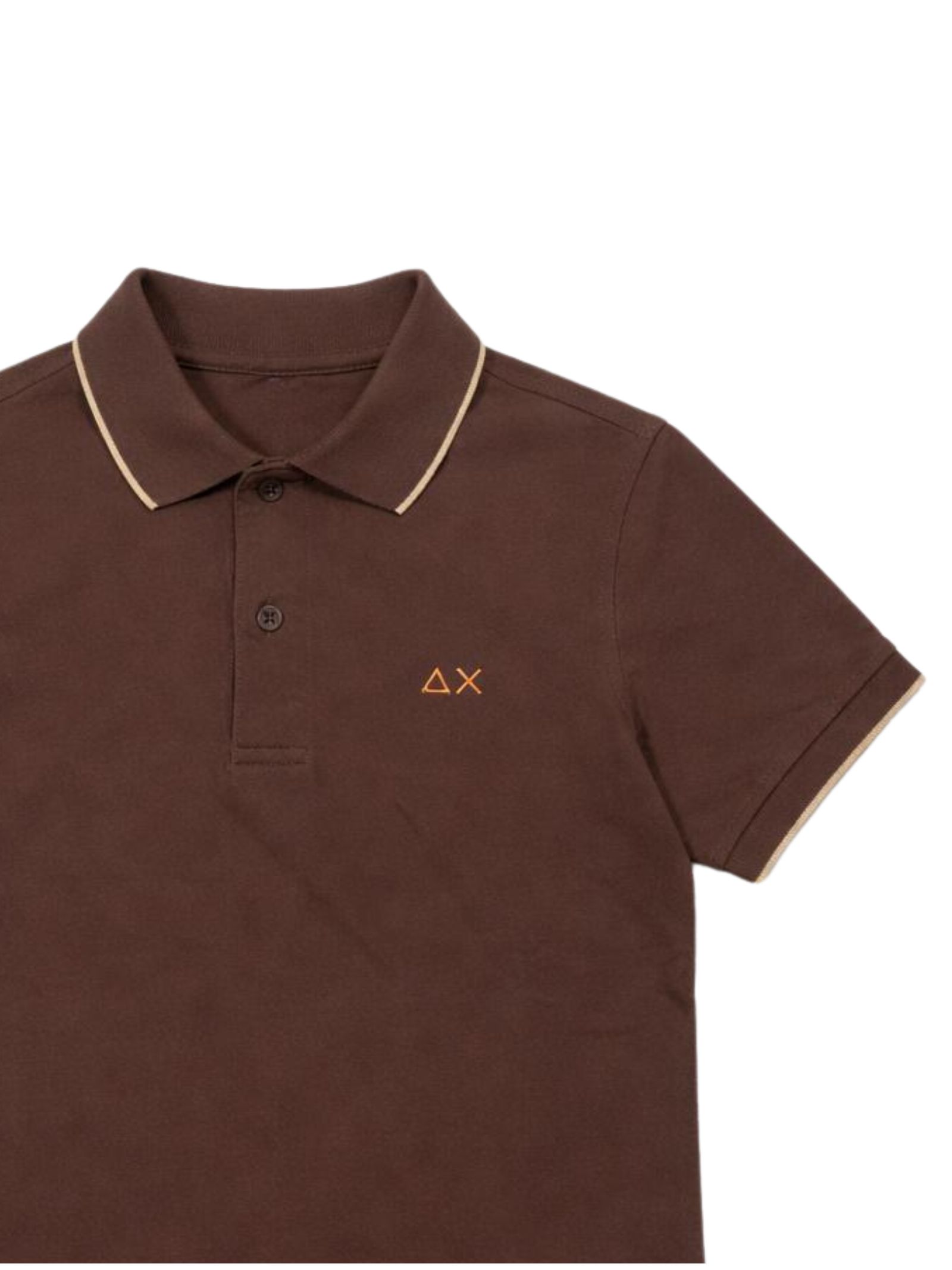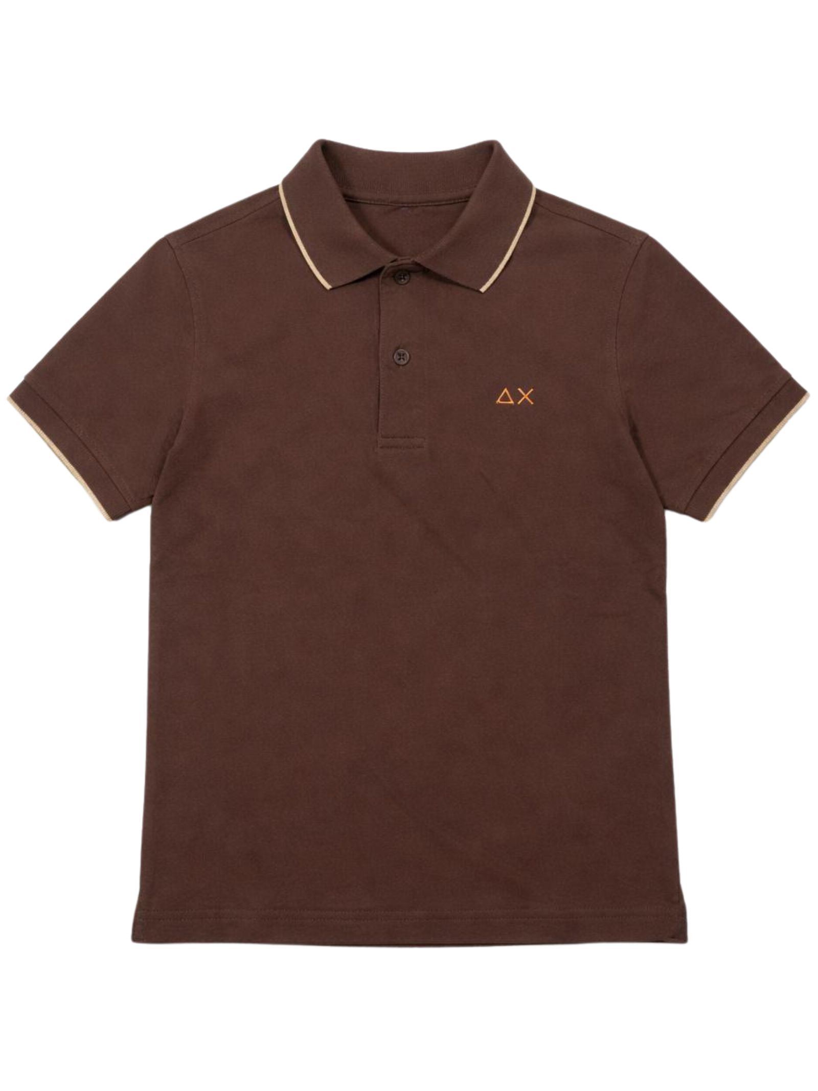 Sun68 Kids cocoa-colored polo shirt, made of pique cotton, with contrasting details, short sleeves, embroidered logo on the chest, straight hem, regular fit. Composition: 95% cotton 5% elastane
