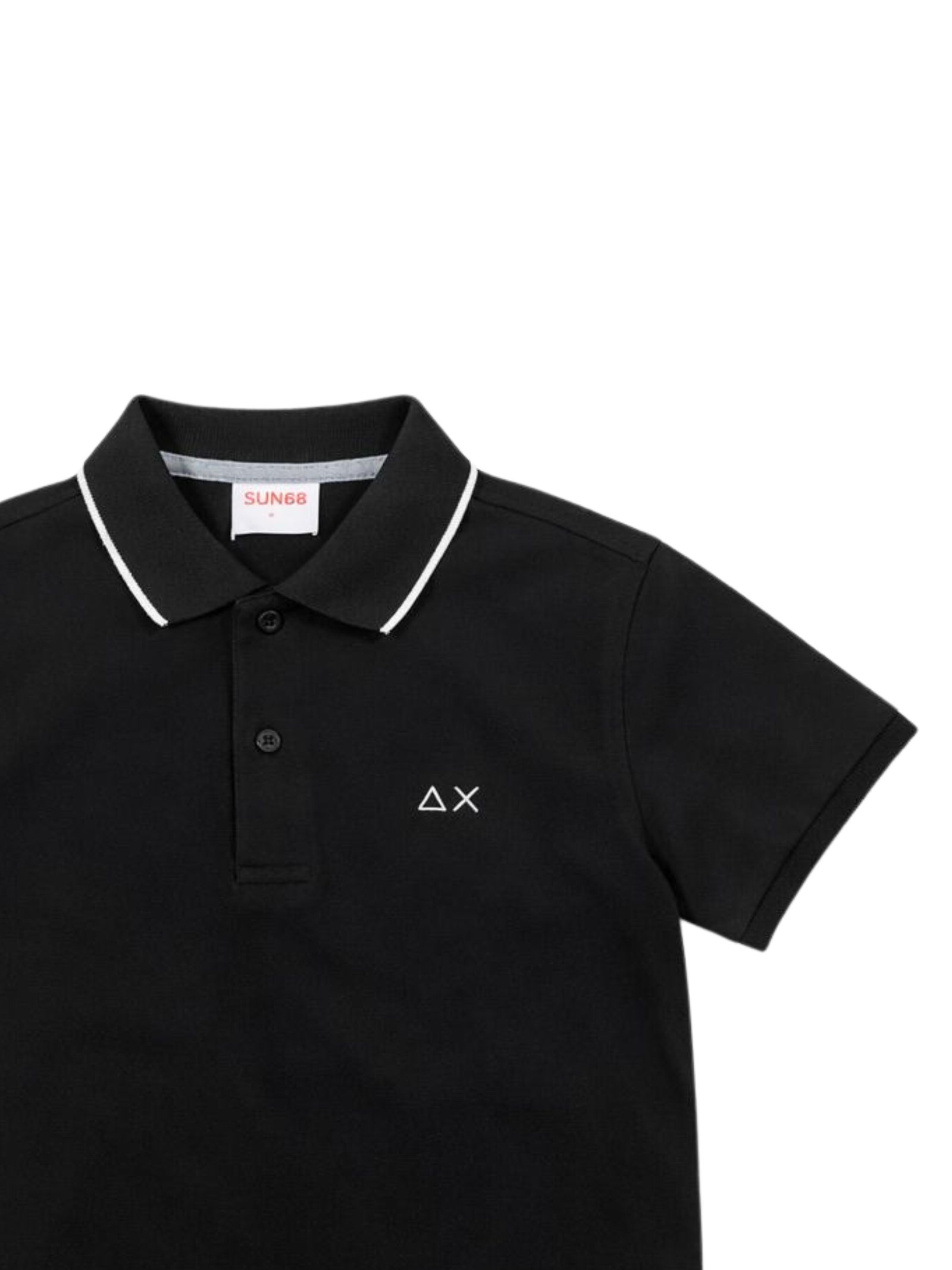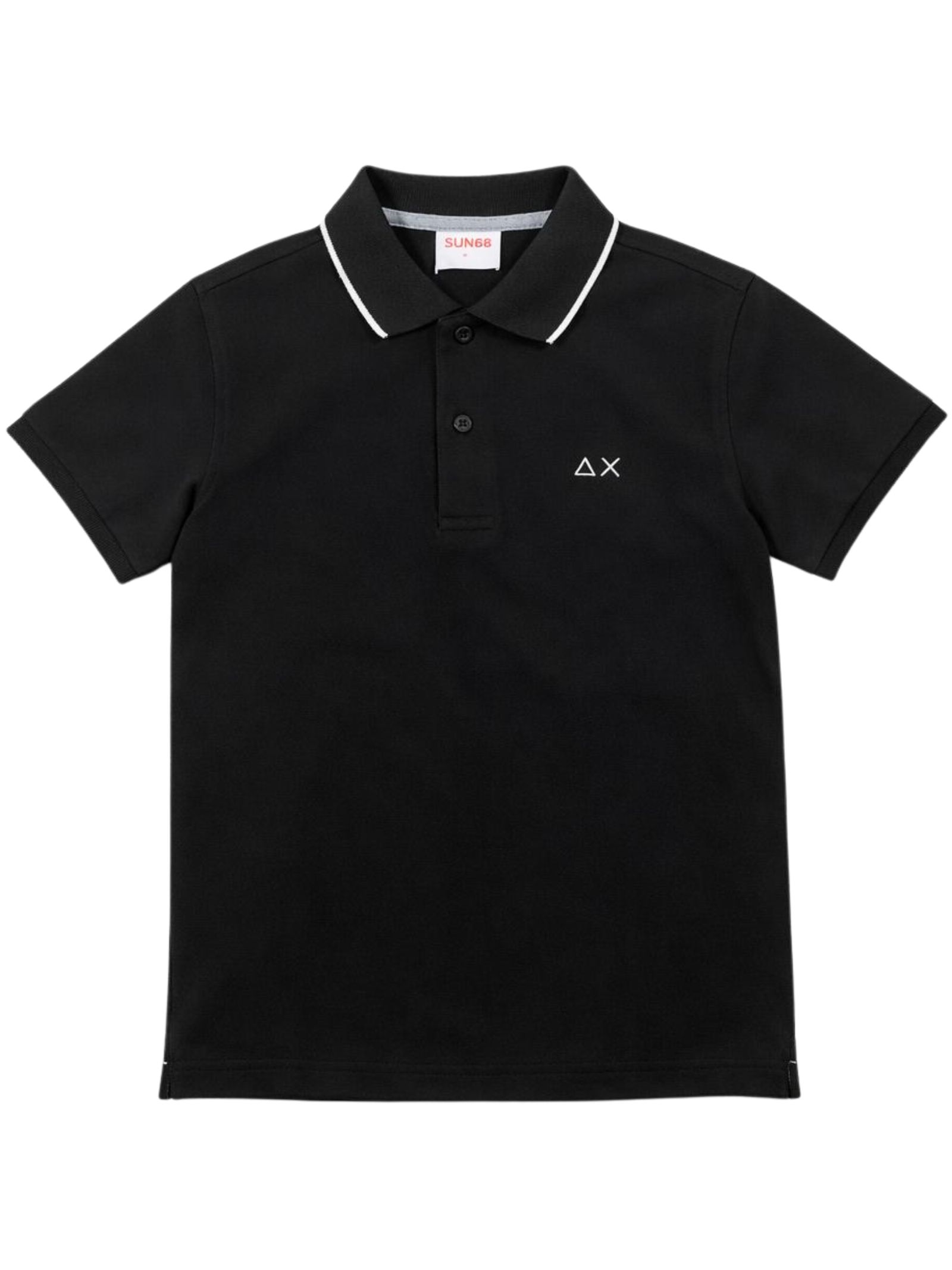 Sun68 Kids black polo shirt, made of pique cotton, with contrasting details, short sleeves, embroidered logo on the chest, straight hem, regular fit. Composition: 95% cotton 5% elastane