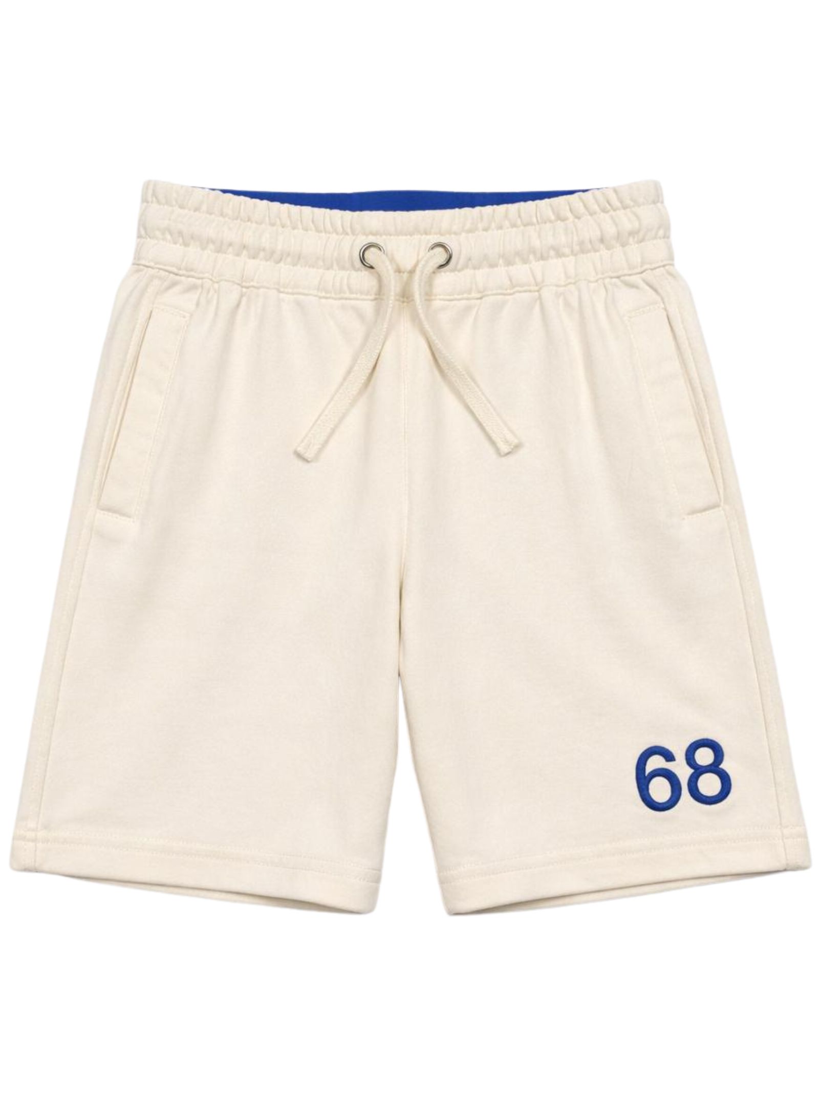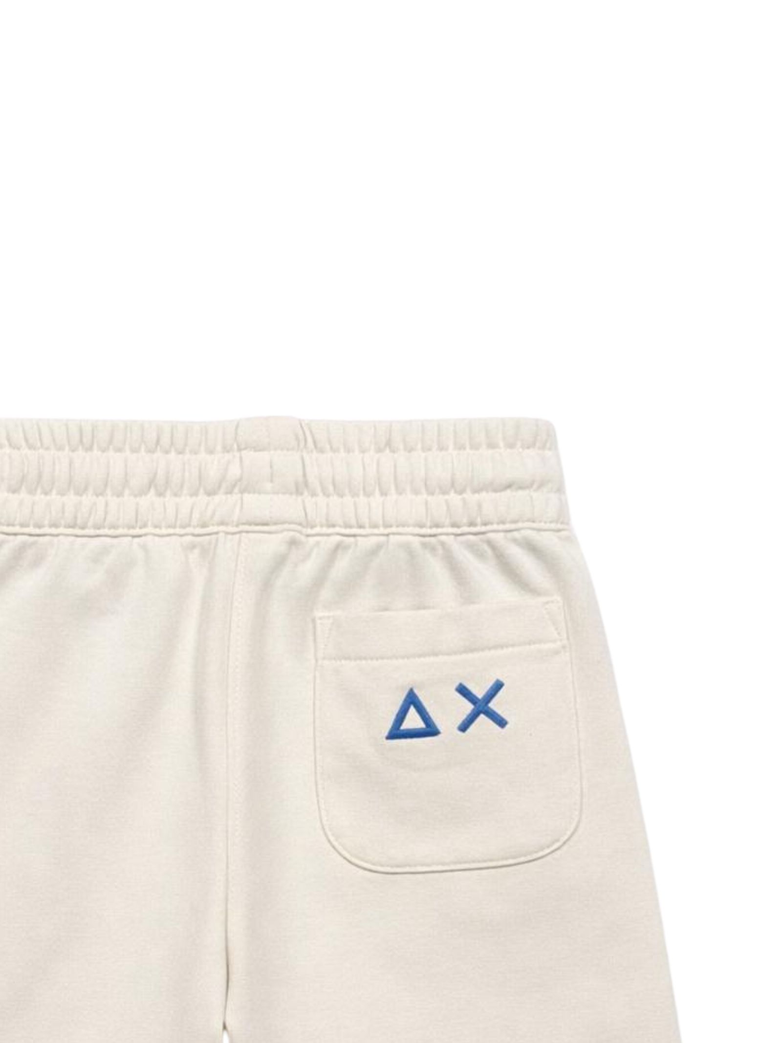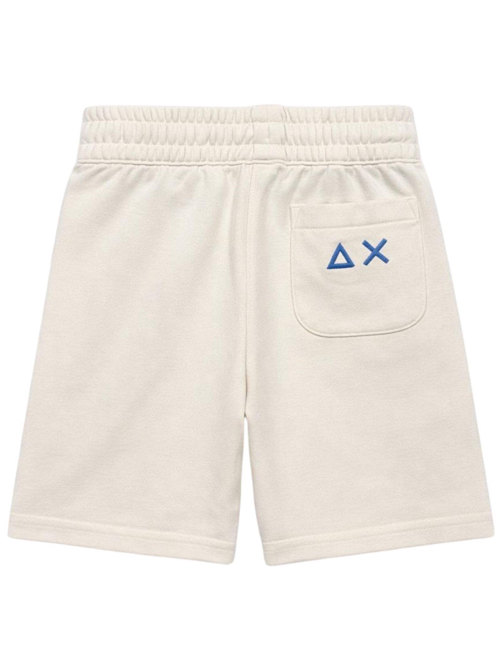 Sun68 Kids cream-colored Bermuda shorts with contrasting blue details, elastic waistband with drawstring, two side pockets, one back pocket, logo embroidery, regular fit. Composition: 100% cotton.