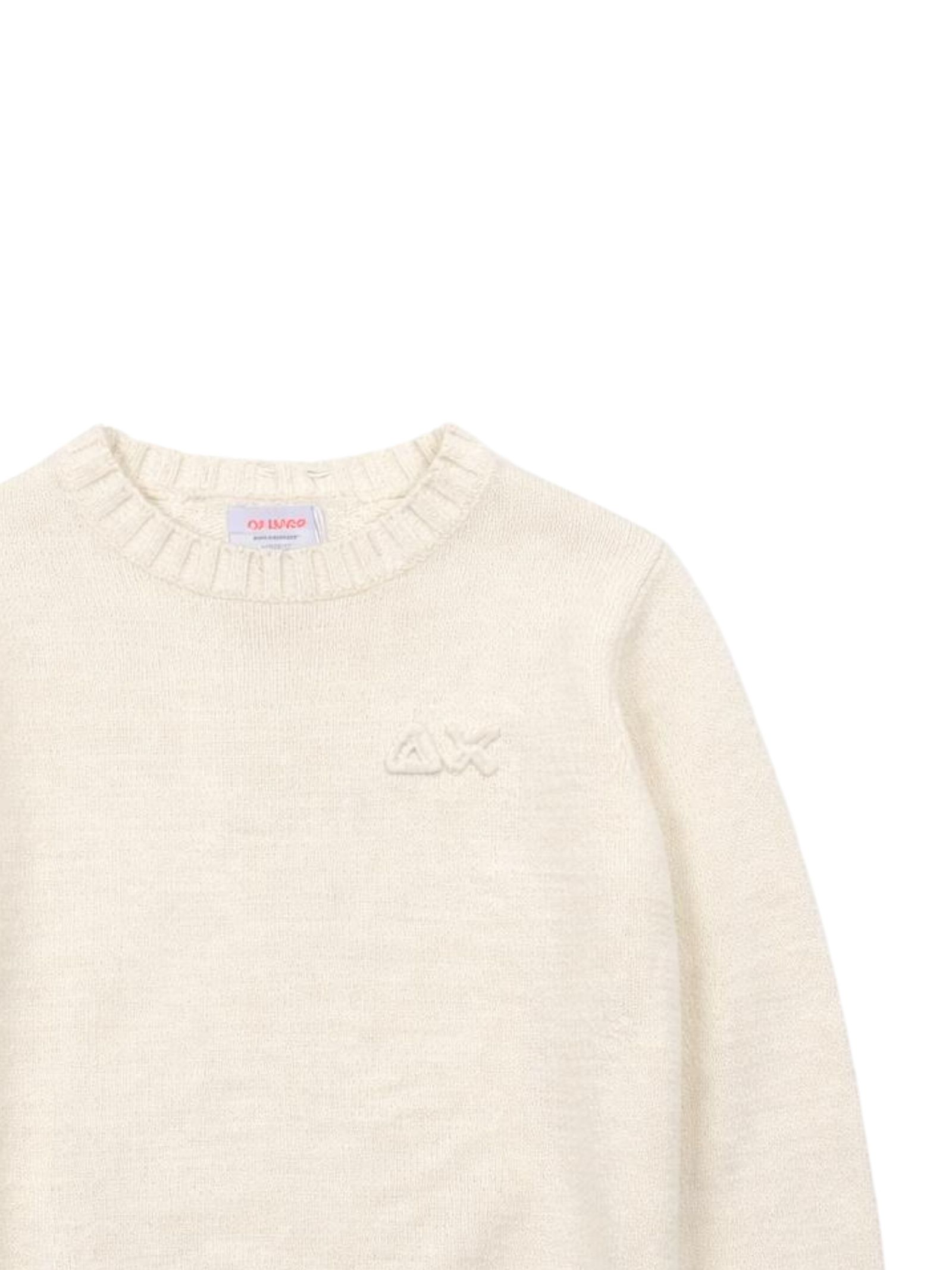 Sun68 Kids cream-colored sweater, made of soft cotton blend knit, crew neck, long sleeves, rips, contrasting logo embroidery on the chest, ribbed cuffs, regular fit. Composition: 85% cotton 15% polyamide