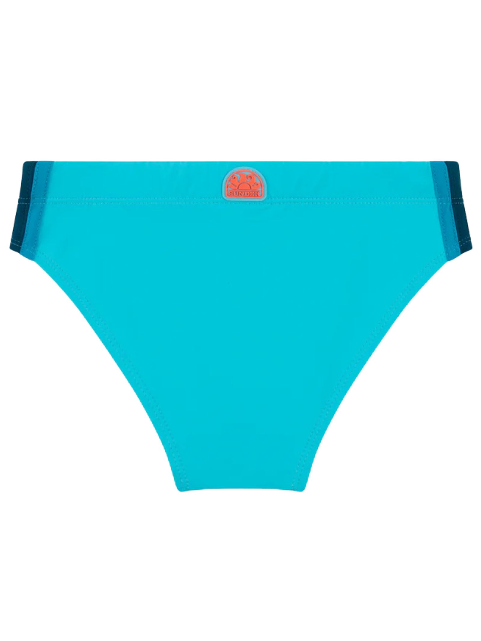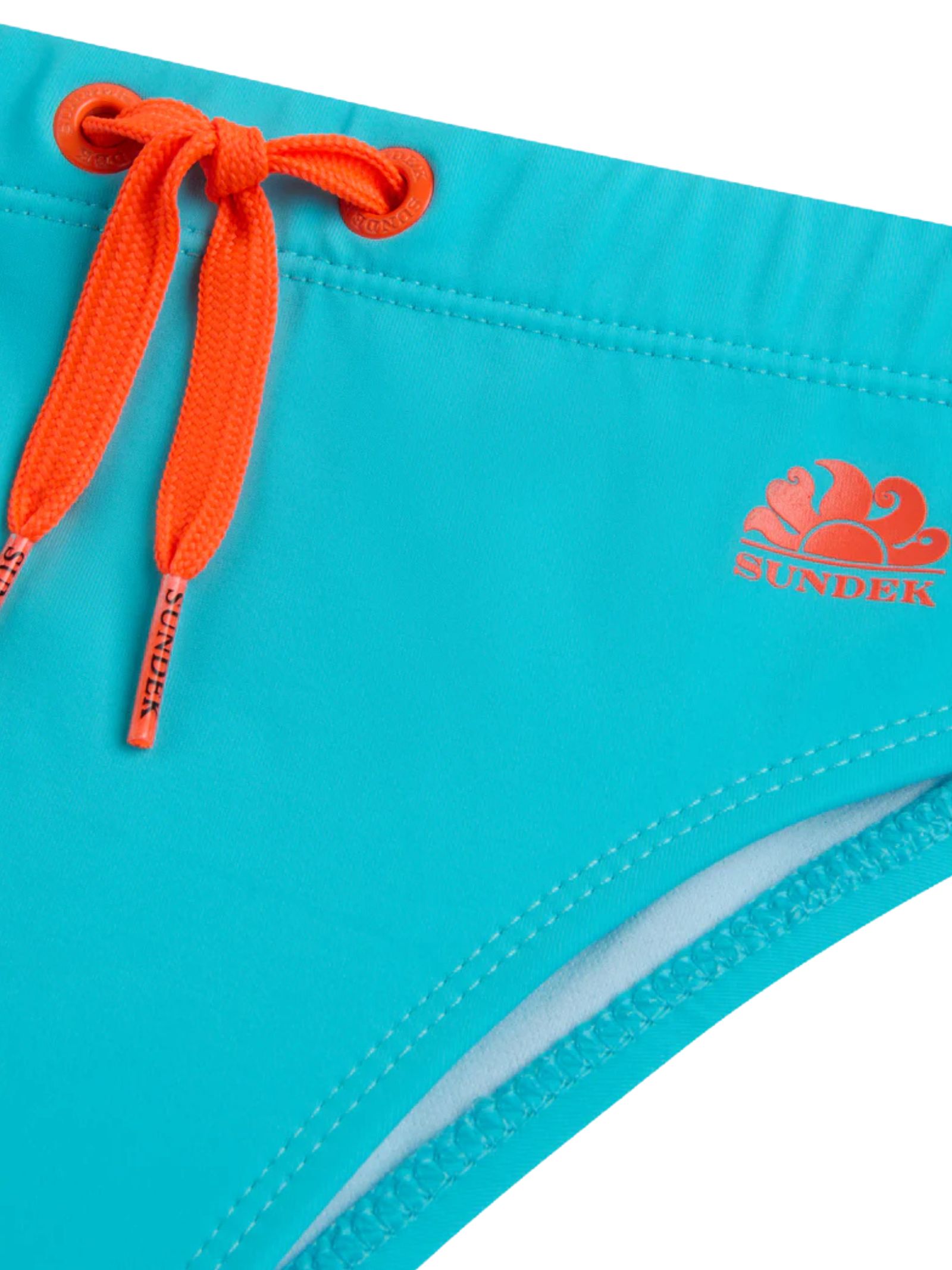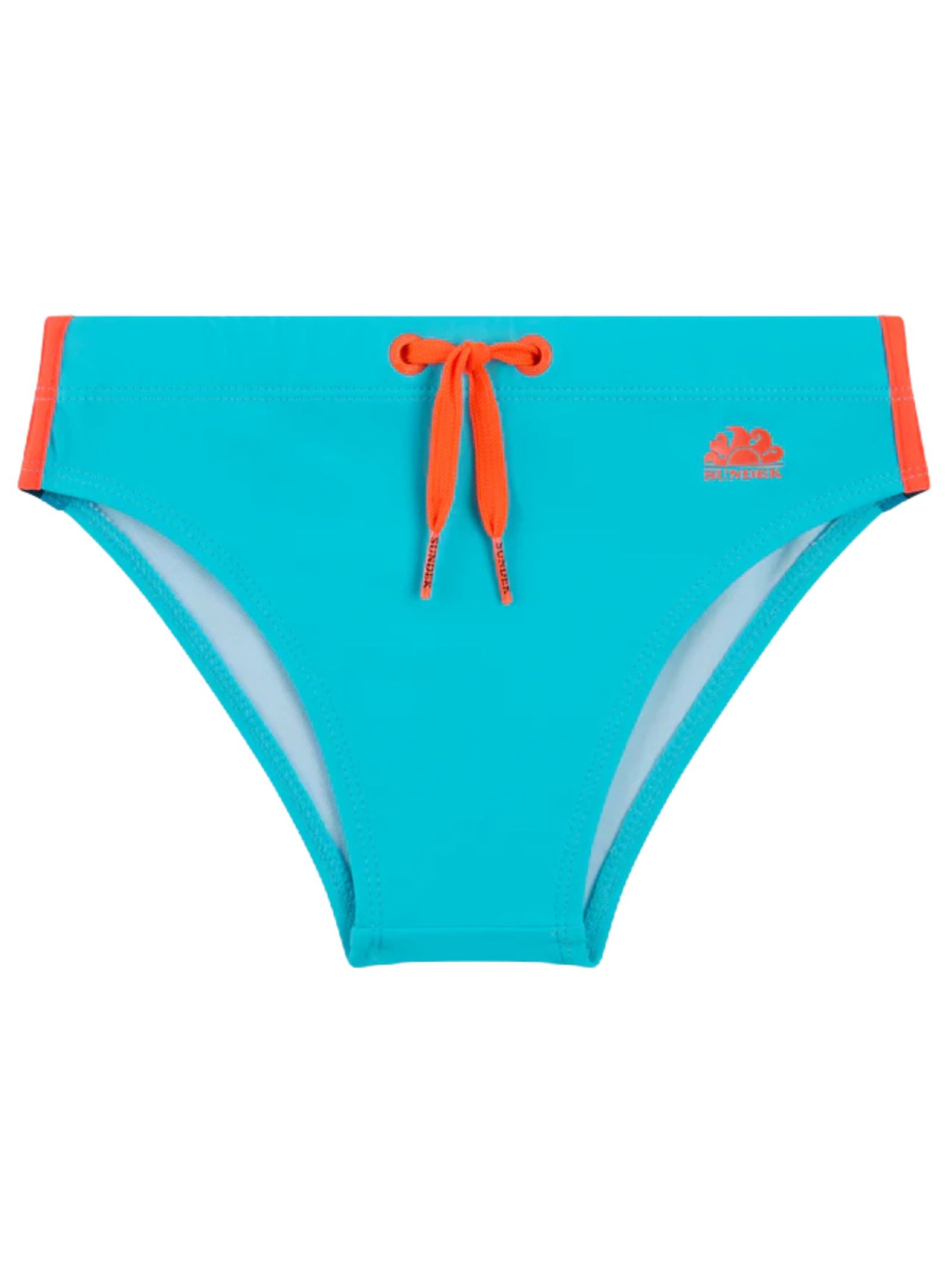 Sundek Kids light blue swimsuit with logo print, made of regenerated Econyl nylon, elastic waistband with drawstring, logo applique on the back. Composition: 78% polyamide 22% elastane