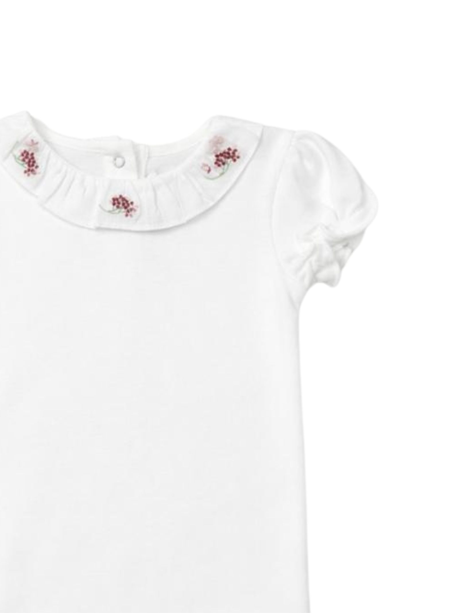Tartine et Chocolat Kids' white cotton bodysuit, featuring a crew neck with ruffles and contrasting embroidered flowers, short puff sleeves, and a button opening at the back and crotch. Composition: 100% cotton.
