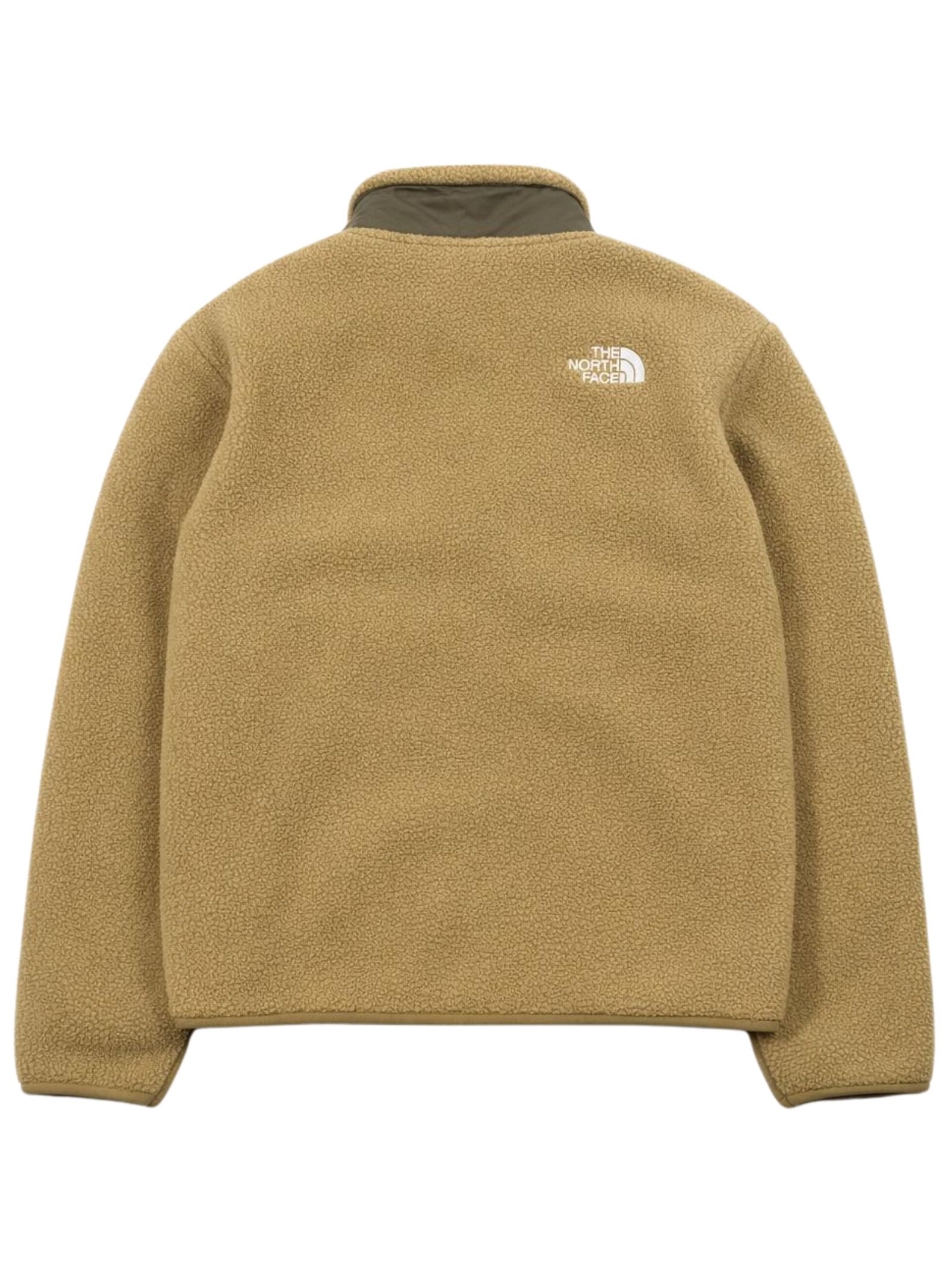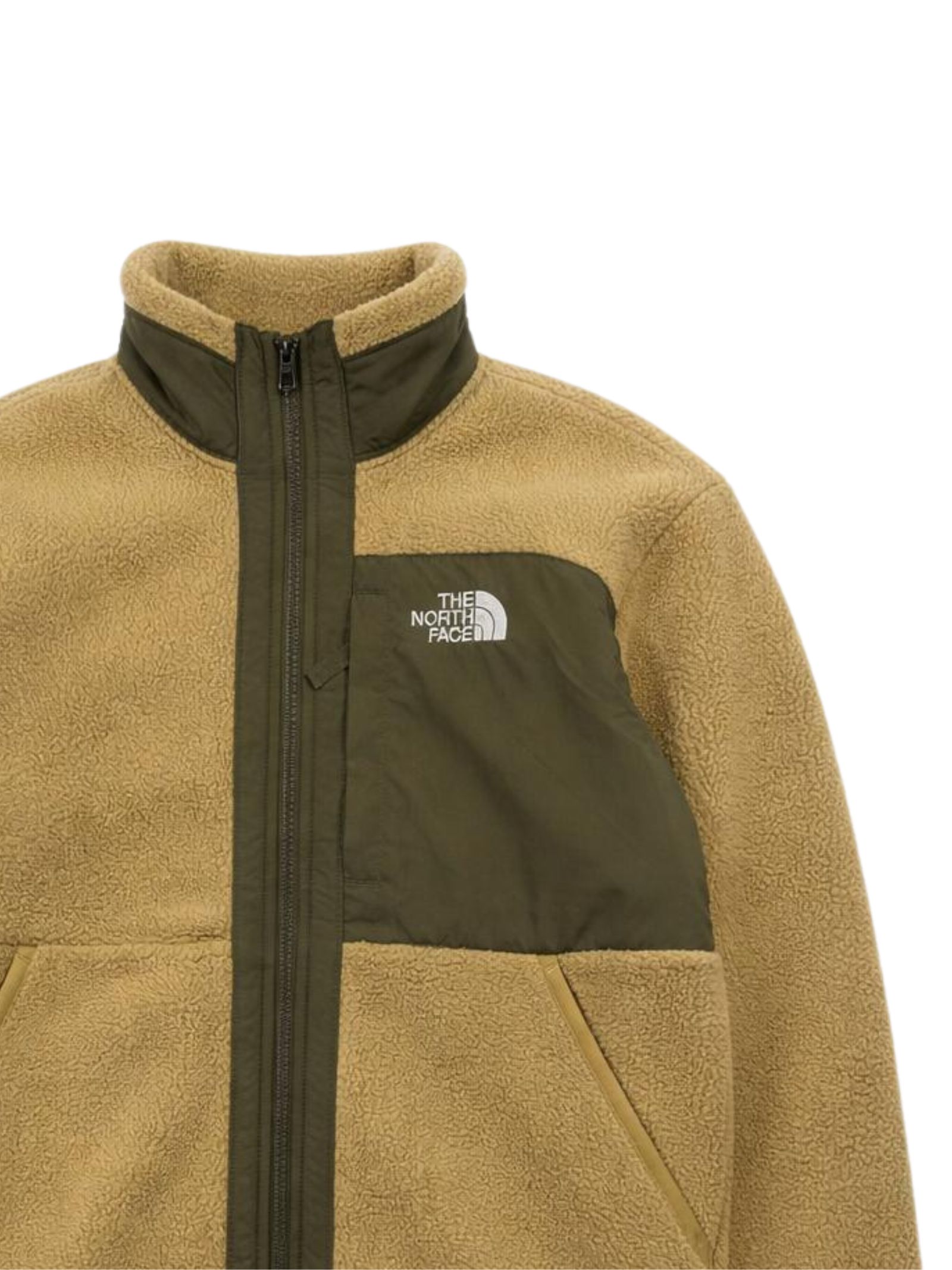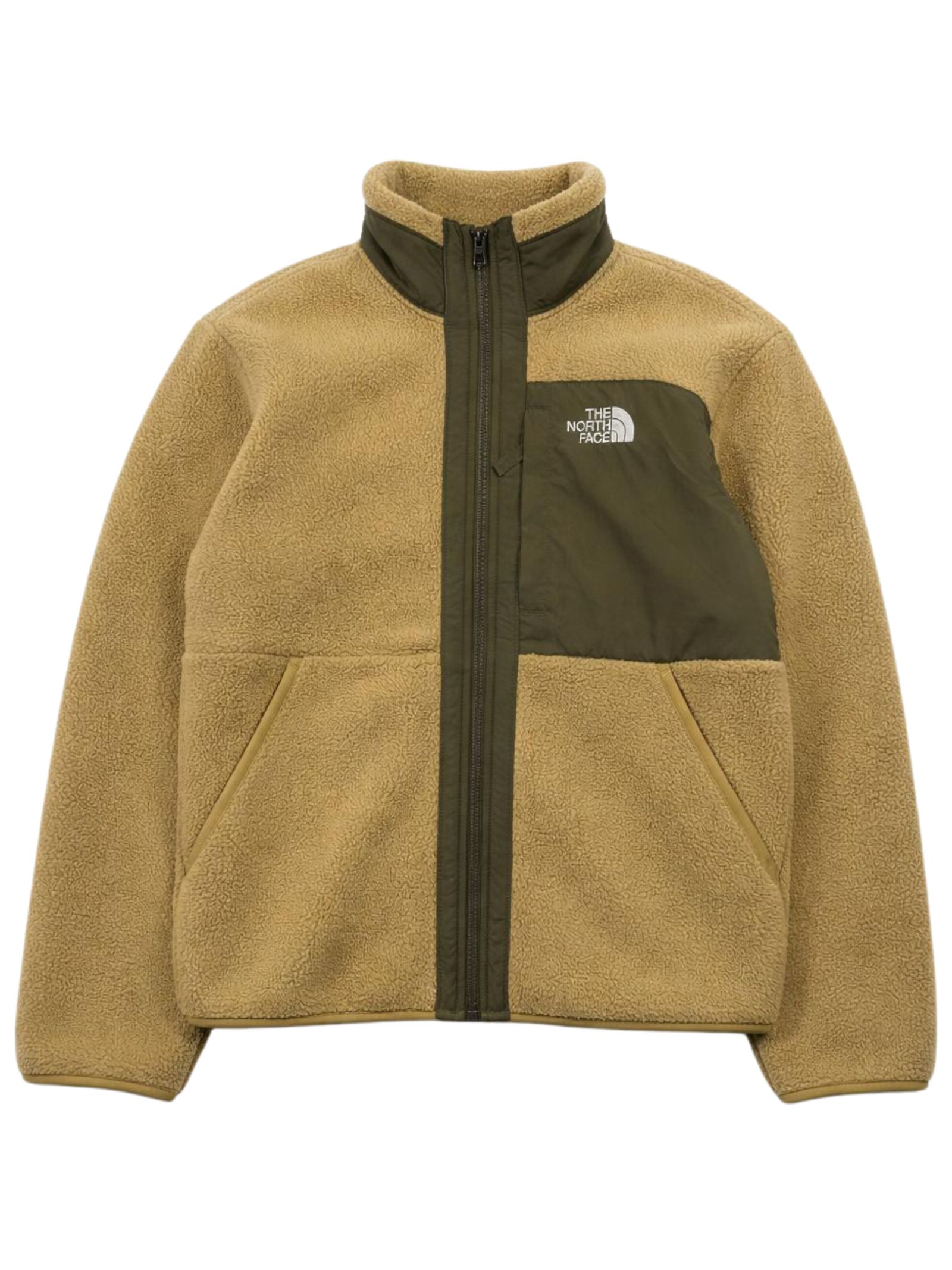 The North Face Kids green jacket with contrasting military green details, made of sherpa, nylon inserts, model with a stand-up collar, central zip, two side zip pockets, contrasting embroidered logo on the chest and back, chest zip pocket. Composition: 100% polyester