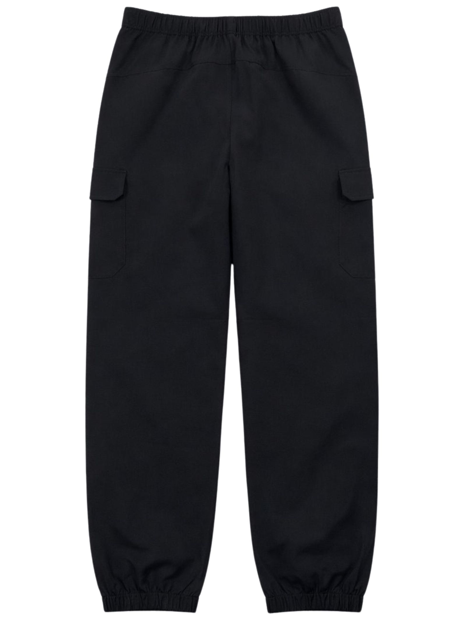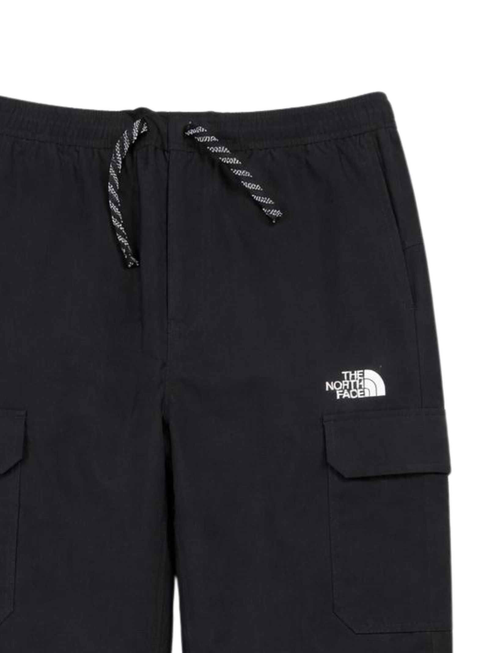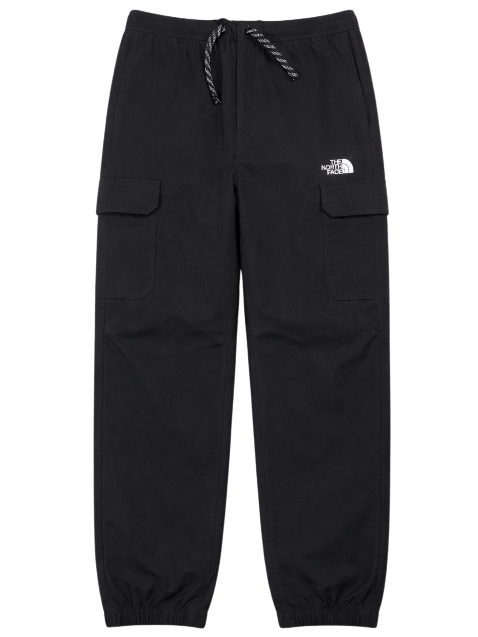 The North Face Kids black trousers with an elasticated drawstring waist, two side pockets, two flap pockets, a contrasting logo print, elastic ankles, and a regular fit. Composition: 85% nylon, 15% elastane.