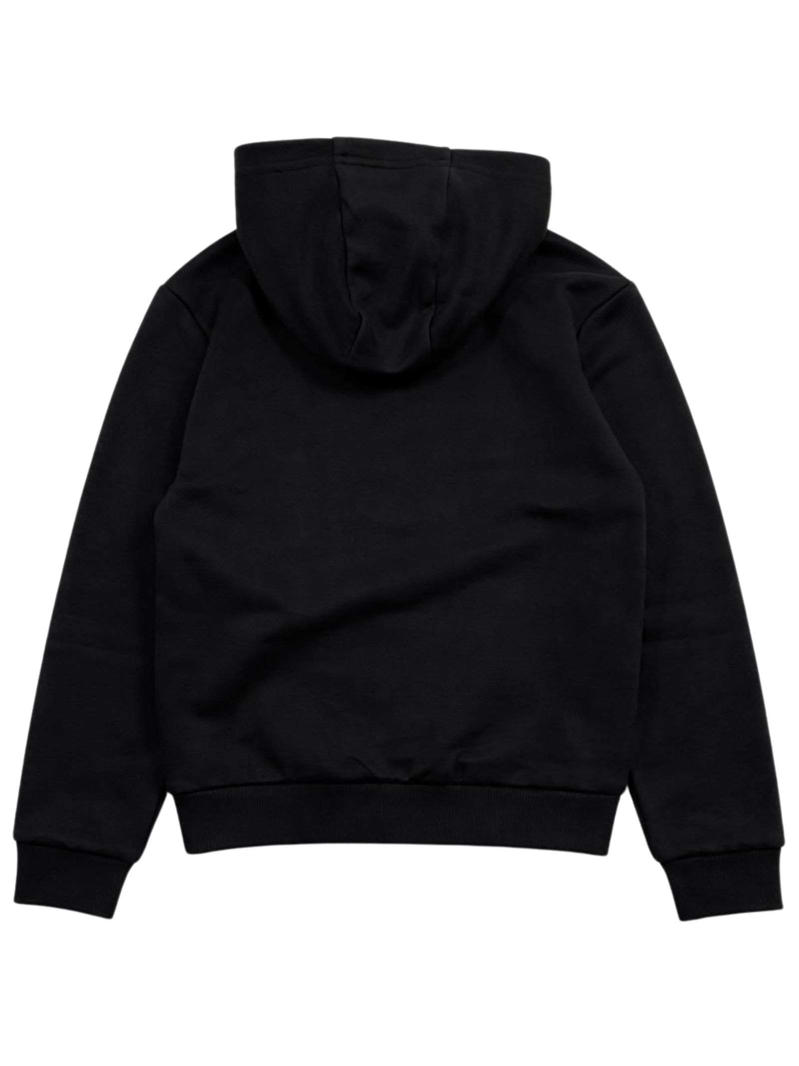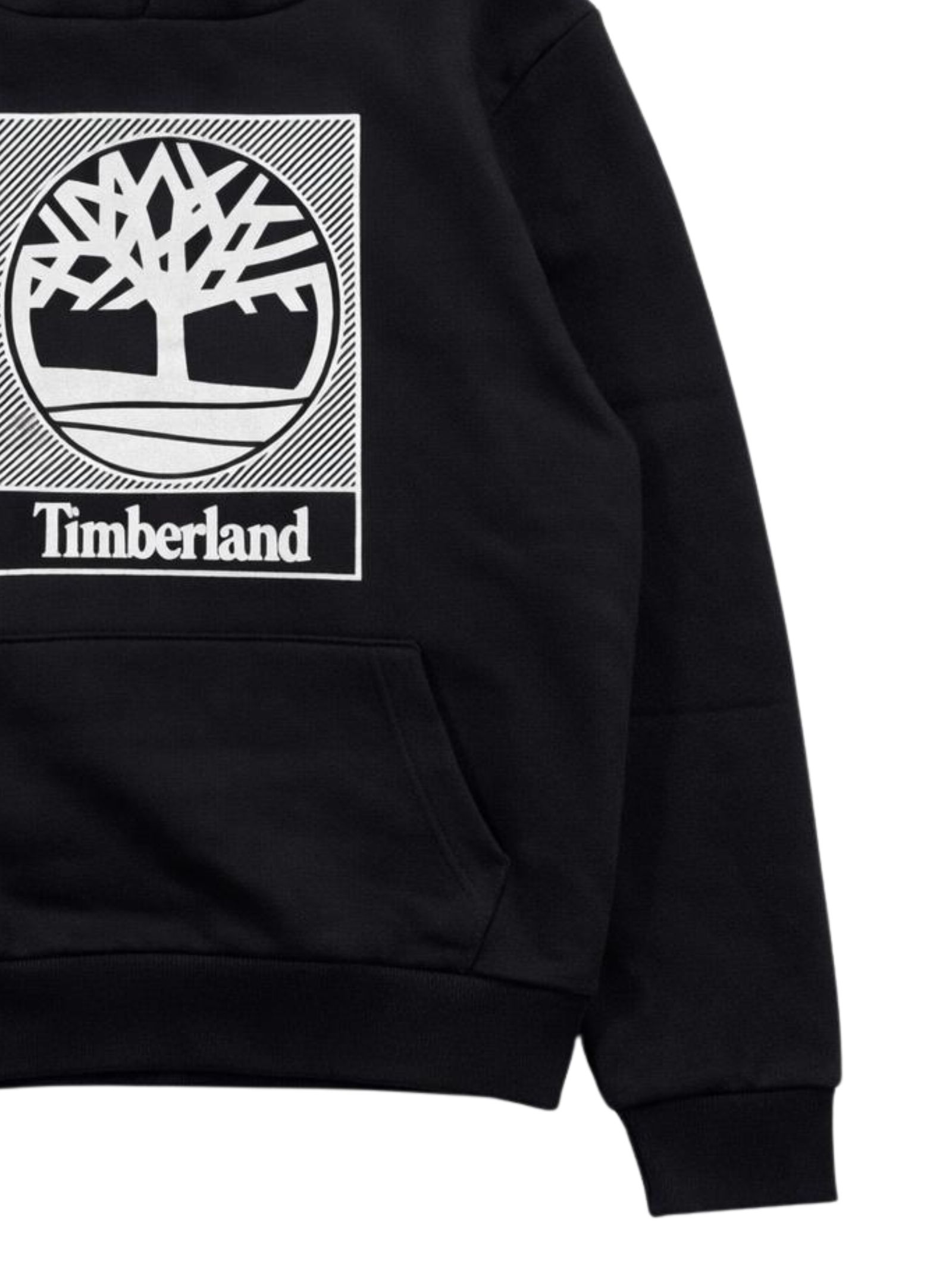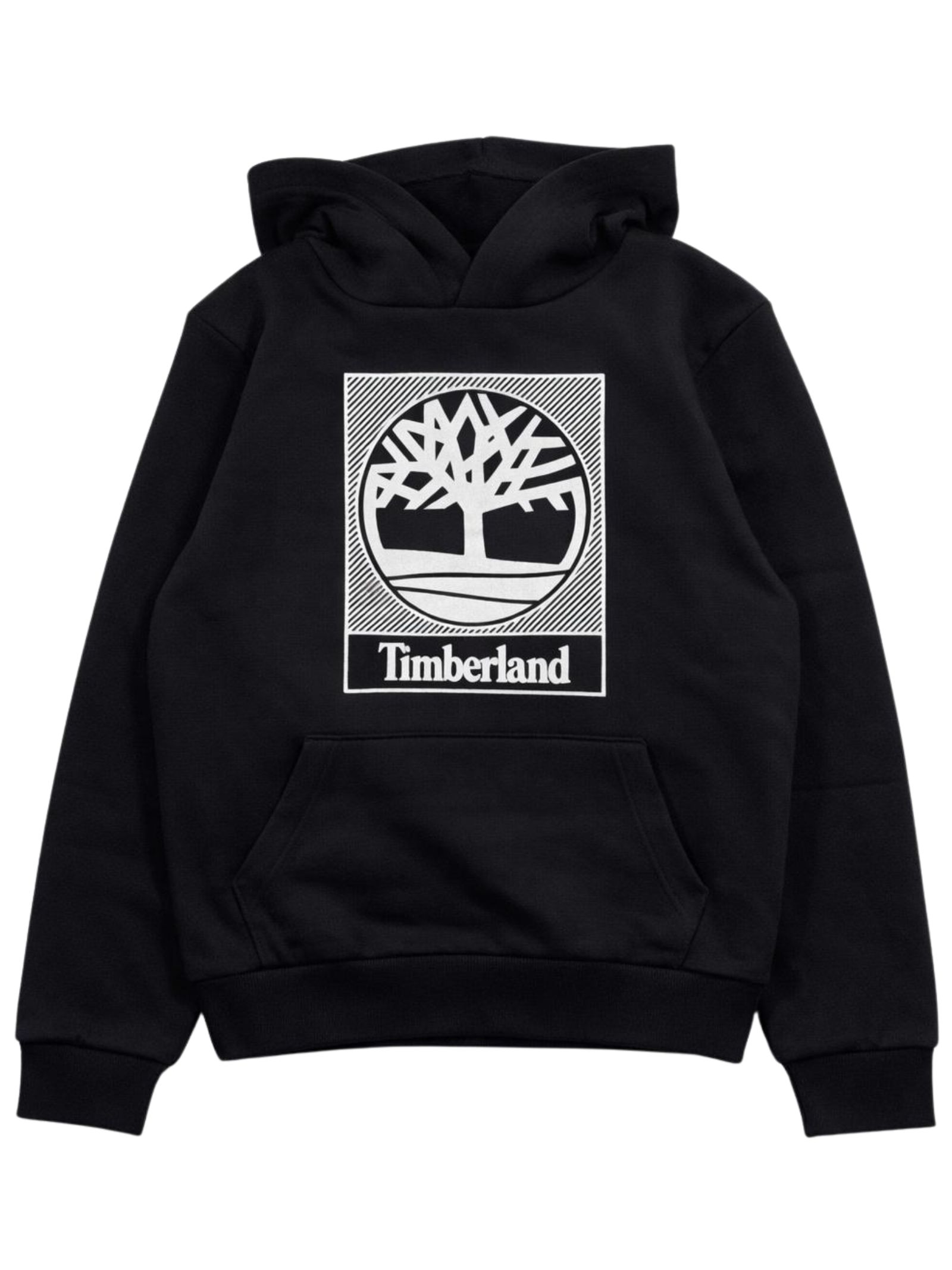 Timberland Kids black hoodie with contrasting logo print at the center, ribbed cuffs, regular fit. Composition: 80% cotton, 20% polyester.