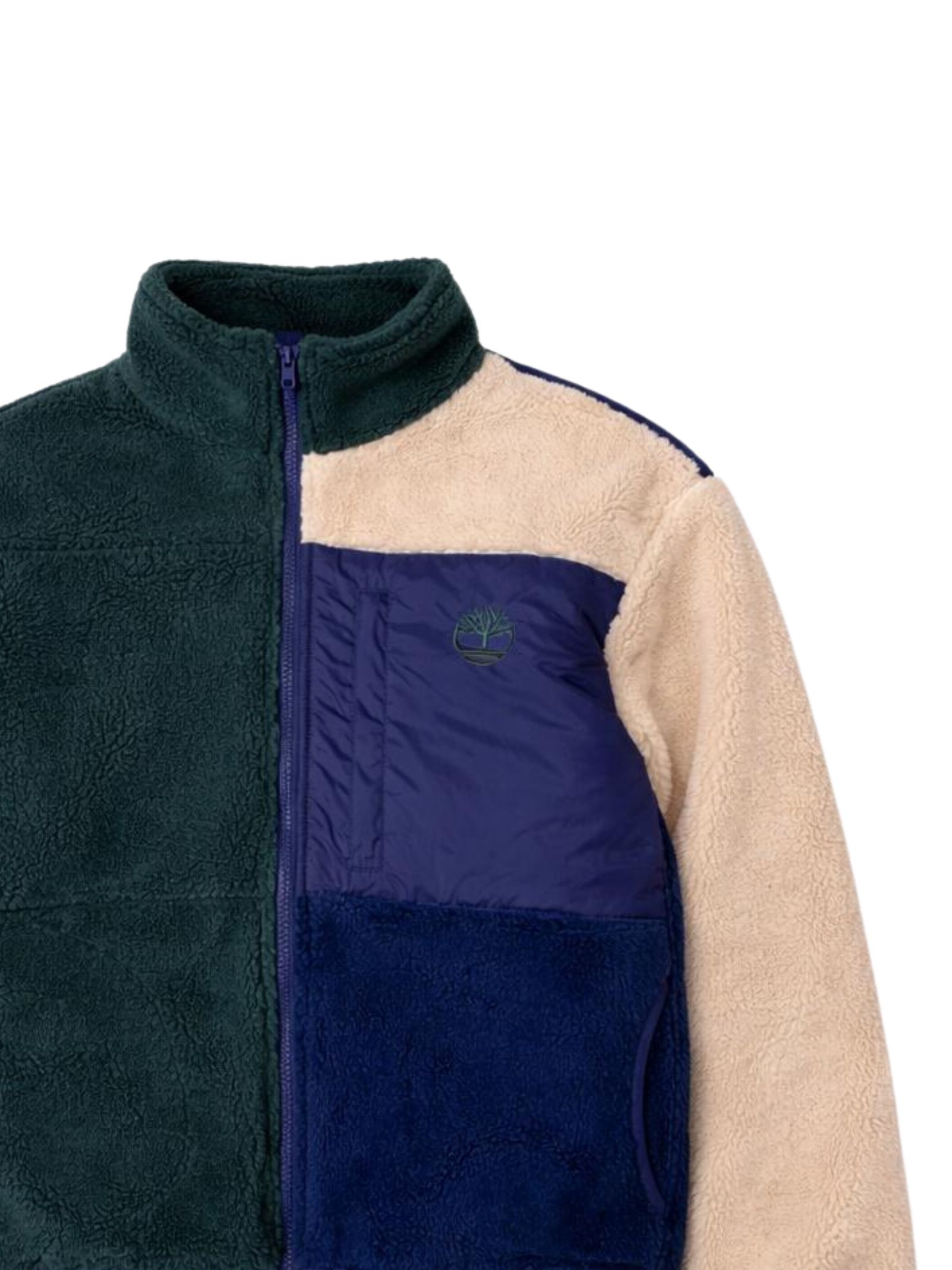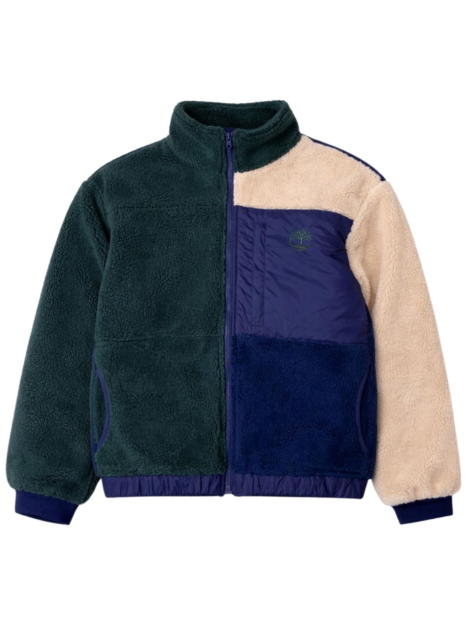 Timberland Kids jacket in multicolored blocks, made of soft sherpa fabric, nylon inserts, two side pockets, logo embroidery, central zip closure, regular fit. Composition: 100% polyester.