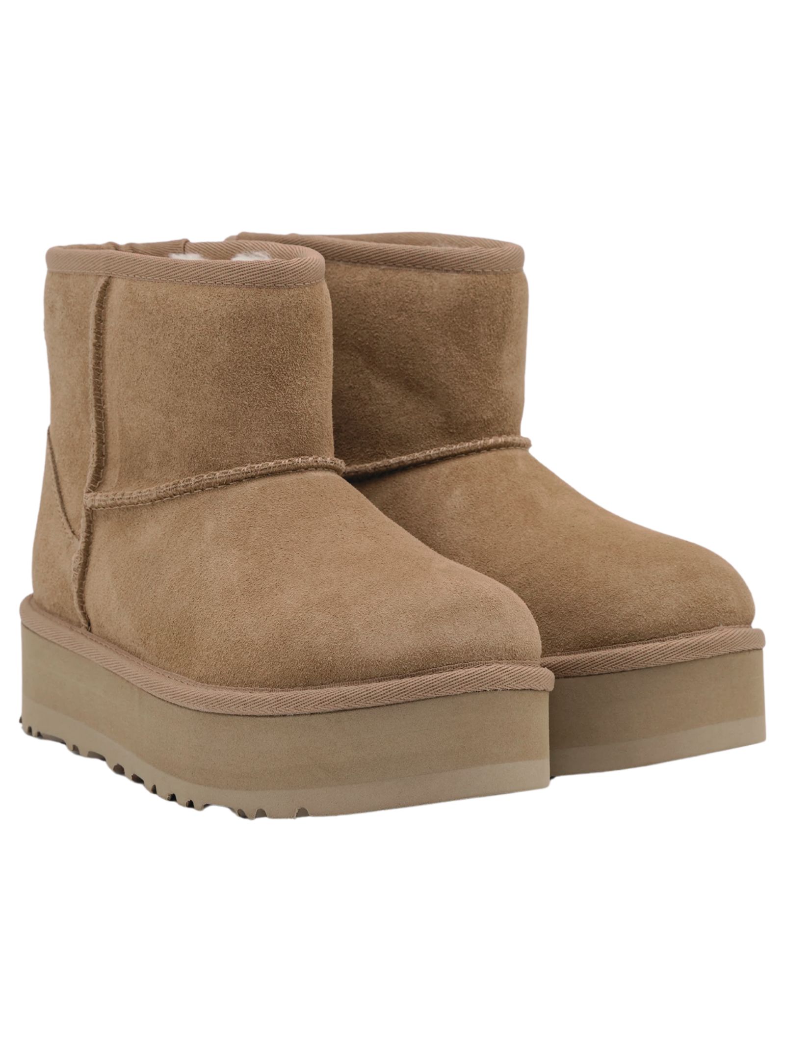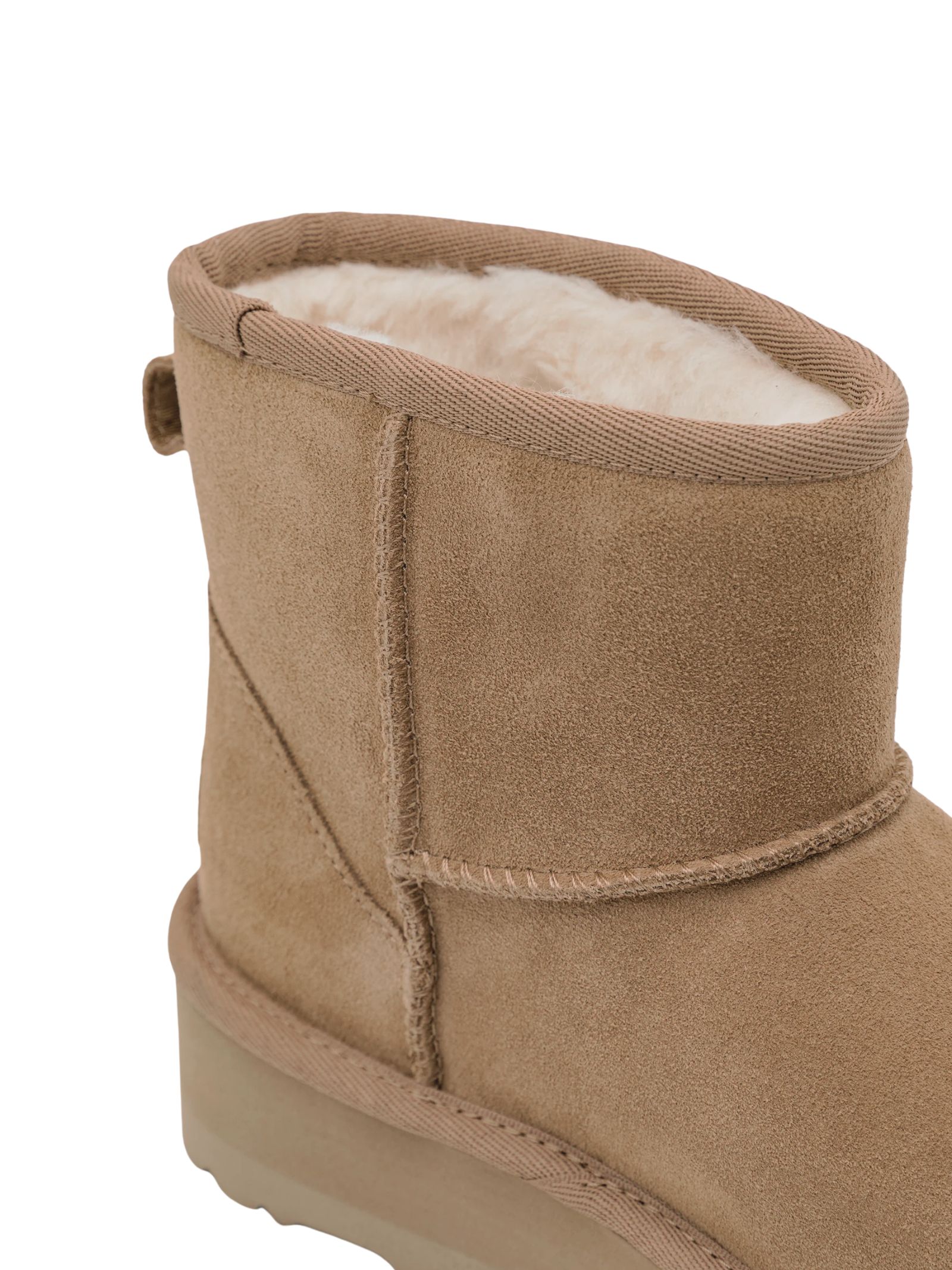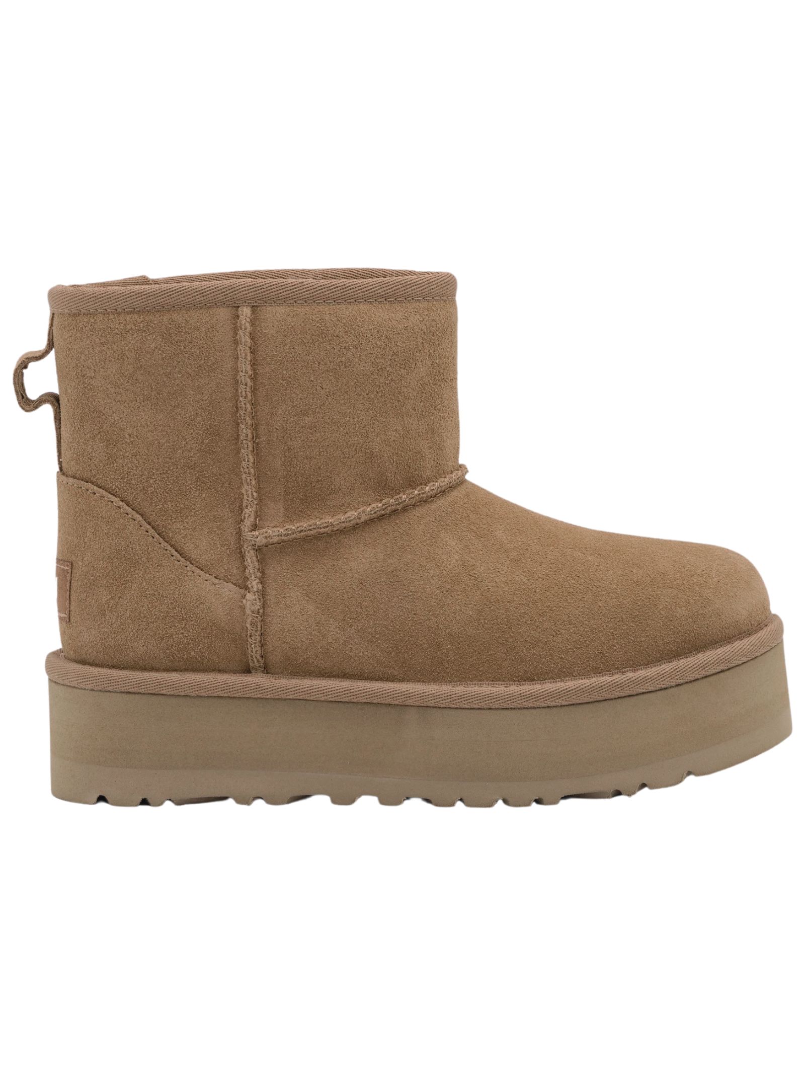 UGG Kids Classic Mini Platform shoes in brown suede, suede upper, overlock stitching, pull tab at the back, asymmetrical top hem, UGGplush? lining and insole, EVA midsole, comfortable Treadlite by UGG outsole, 100% recycled polyester stitching, leather heel tag with embossed UGG® logo. Composition: 80% recycled wool and 20% lyocell.