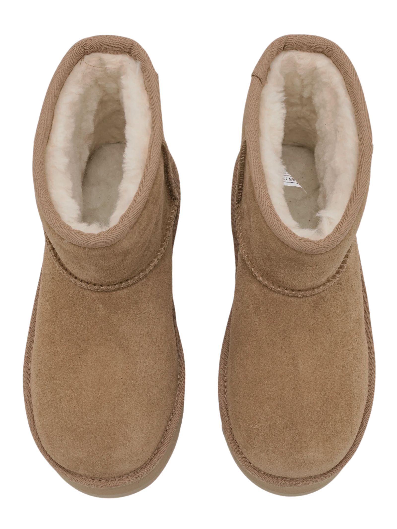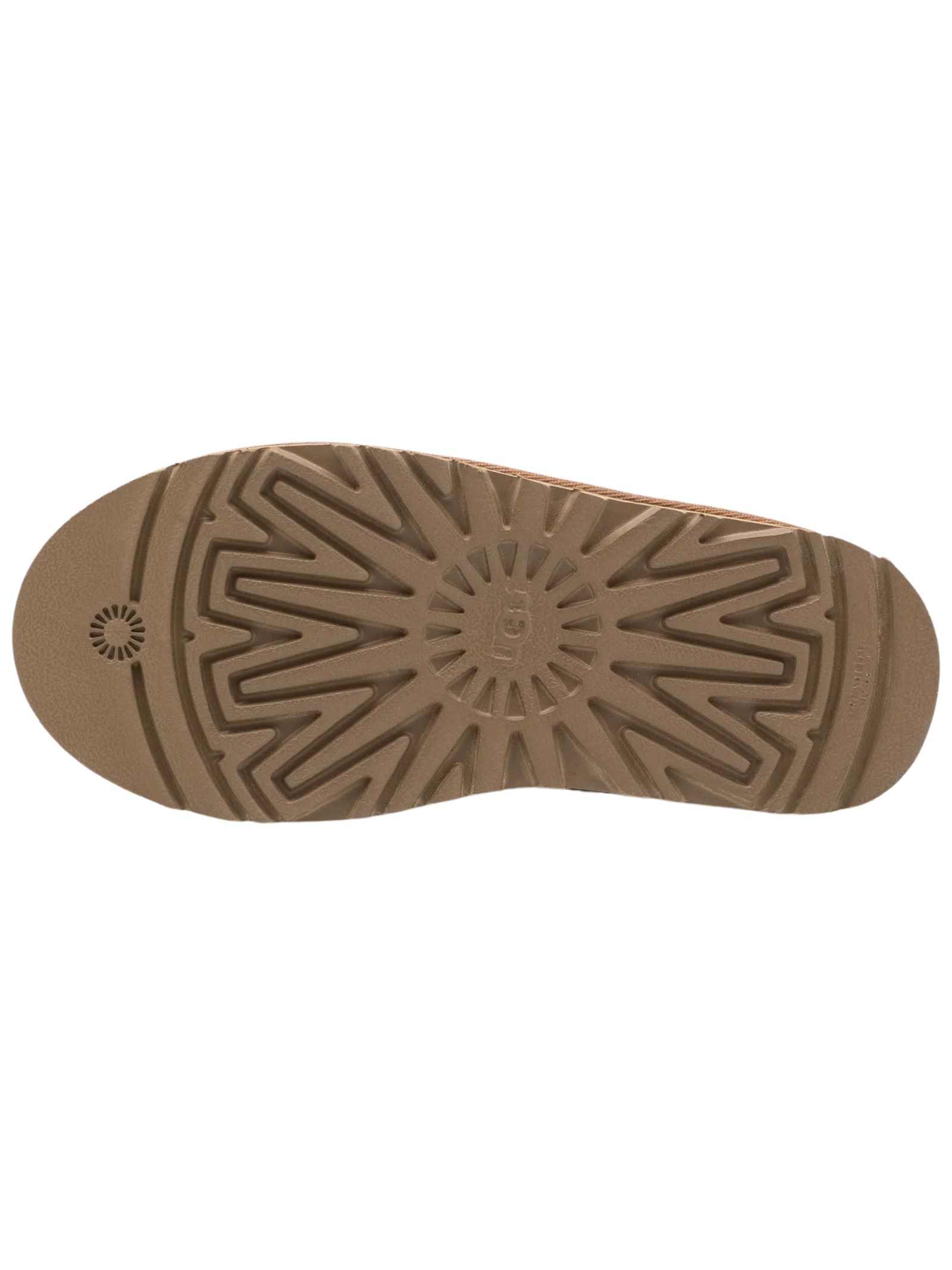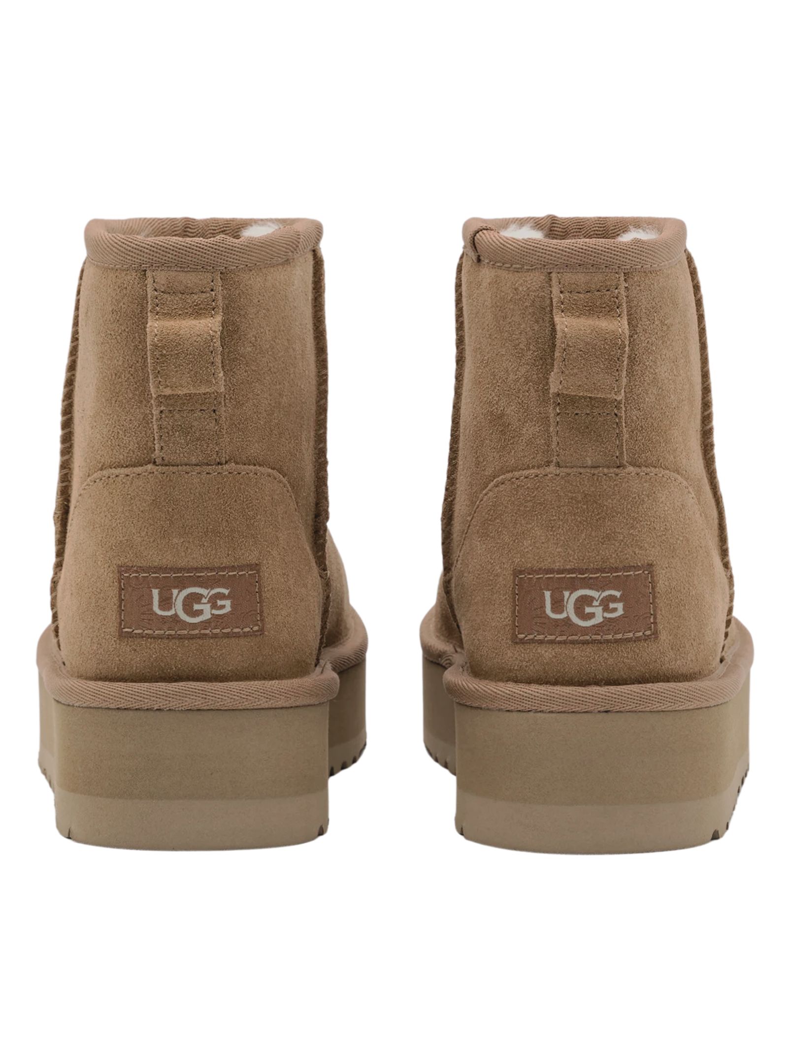 UGG Kids Classic Mini Platform shoes in brown suede, suede upper, overlock stitching, pull tab at the back, asymmetrical top hem, UGGplush? lining and insole, EVA midsole, comfortable Treadlite by UGG outsole, 100% recycled polyester stitching, leather heel tag with embossed UGG® logo. Composition: 80% recycled wool and 20% lyocell.