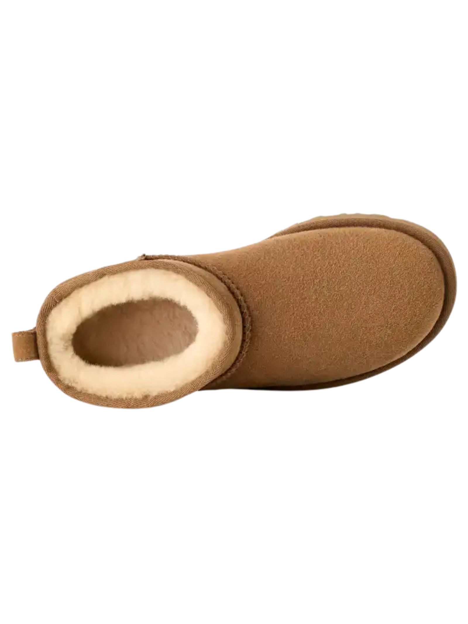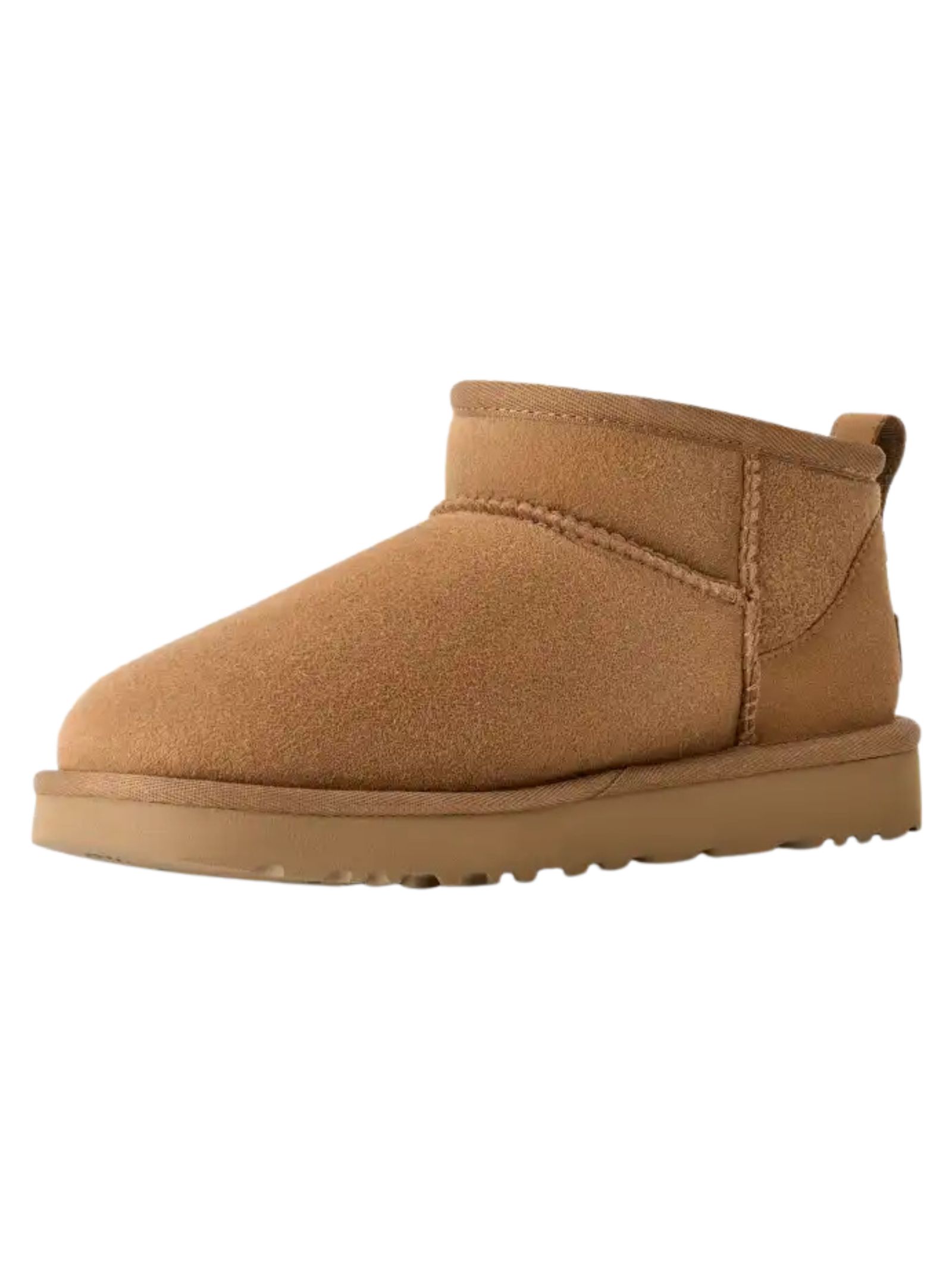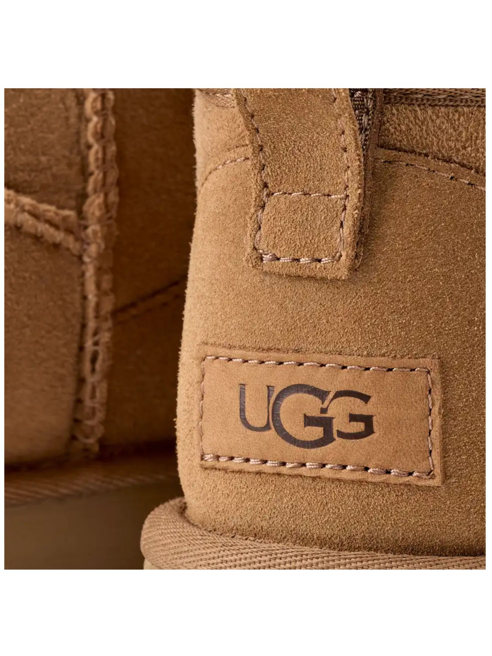 UGG Classic Ultra Mini Boots in camel (chestnut), featuring a new low-profile design, suede or suede with a topical application of water-repellent treatment or water-resistant suede upper, pull tab at the heel, sheepskin shaft lining (17 mm), sheepskin toe cap lining (17 mm), sheepskin footbed (17 mm), sugarcane EVA outsole, woven rand made with 100% recycled polyester fibers, 3.5" shaft height, woven UGG® logo label on the insole, embossed leather UGG® logo tag on the heel. This product is made with real sheep or lamb fur, fur sourced from Australia, Ireland, the United Kingdom, or the United States. Artificially treated and dyed.