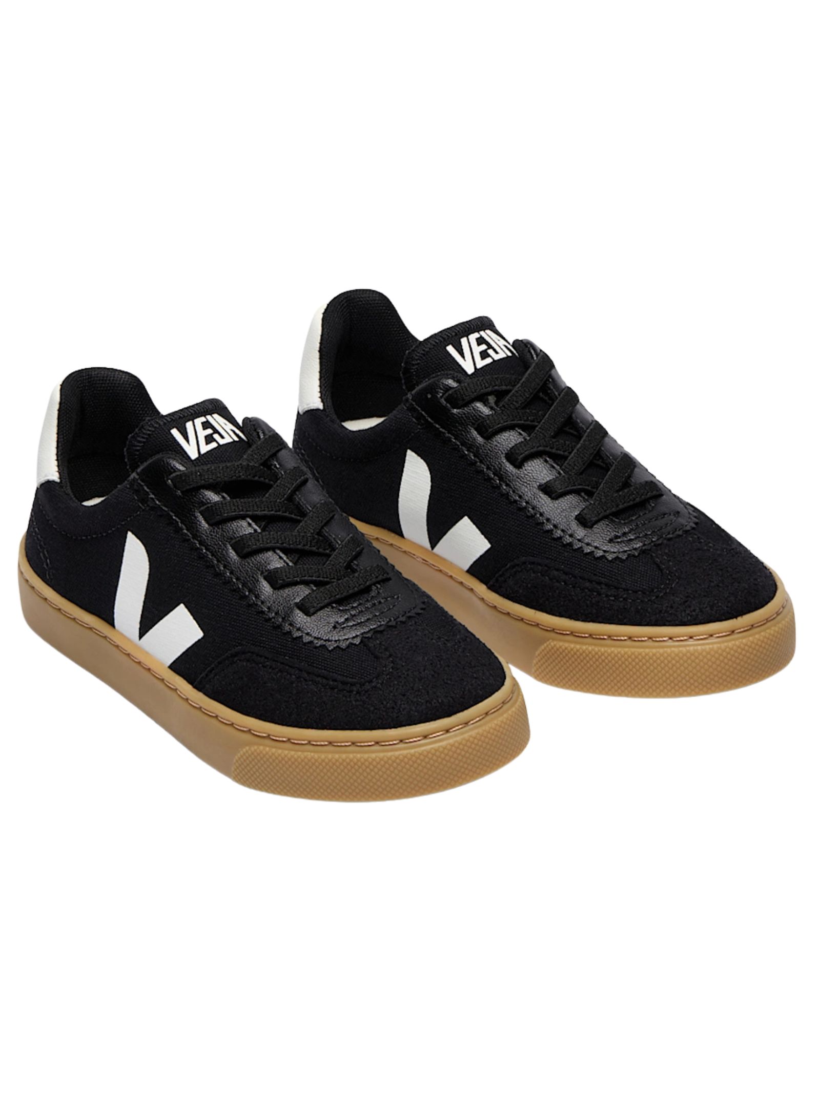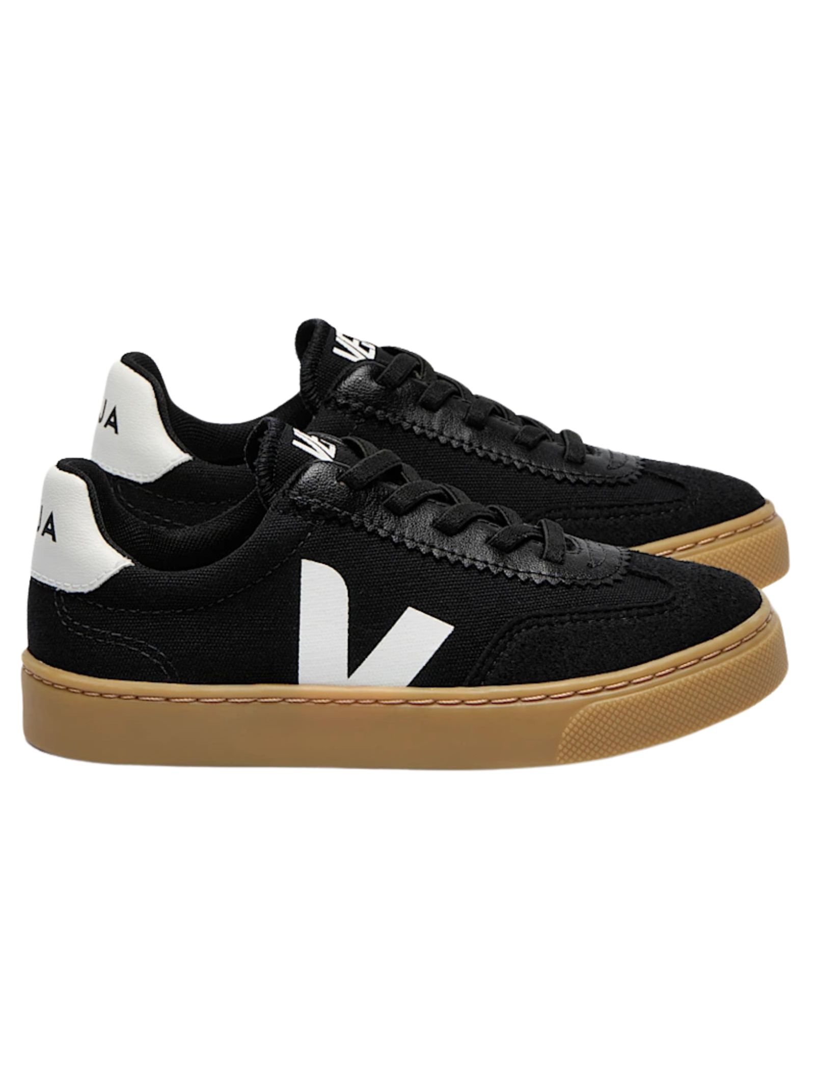 VEJA Kids SMALL VOLLEY CANVAS shoes in black, featuring a round toe, suede inserts, a printed logo tongue, a side logo, a contrasting heel counter, a logo insole, a flat rubber sole, and a lace-up front fastening. Sole: 100% rubber. Lining: 100% fabric. Outer: 100% calfskin.