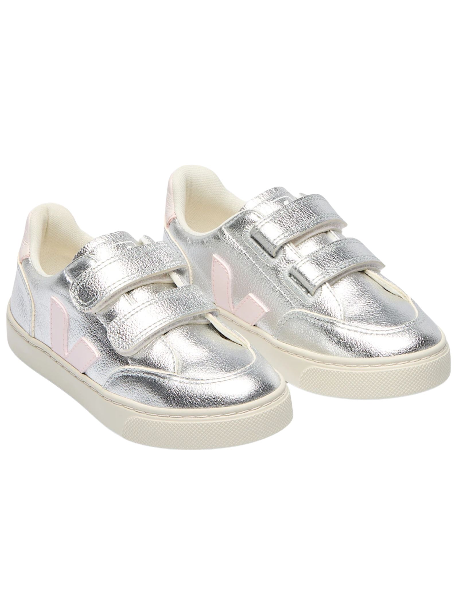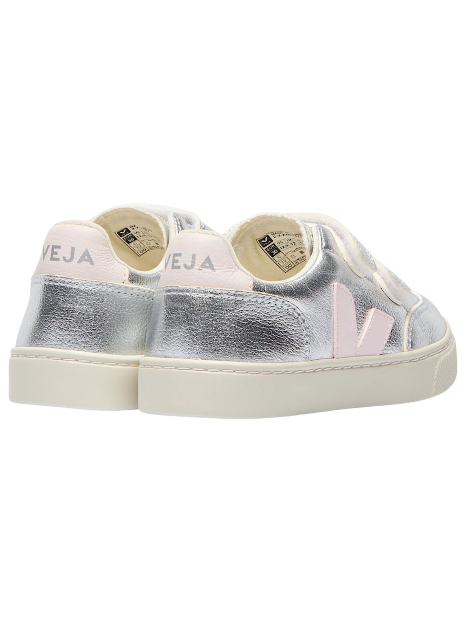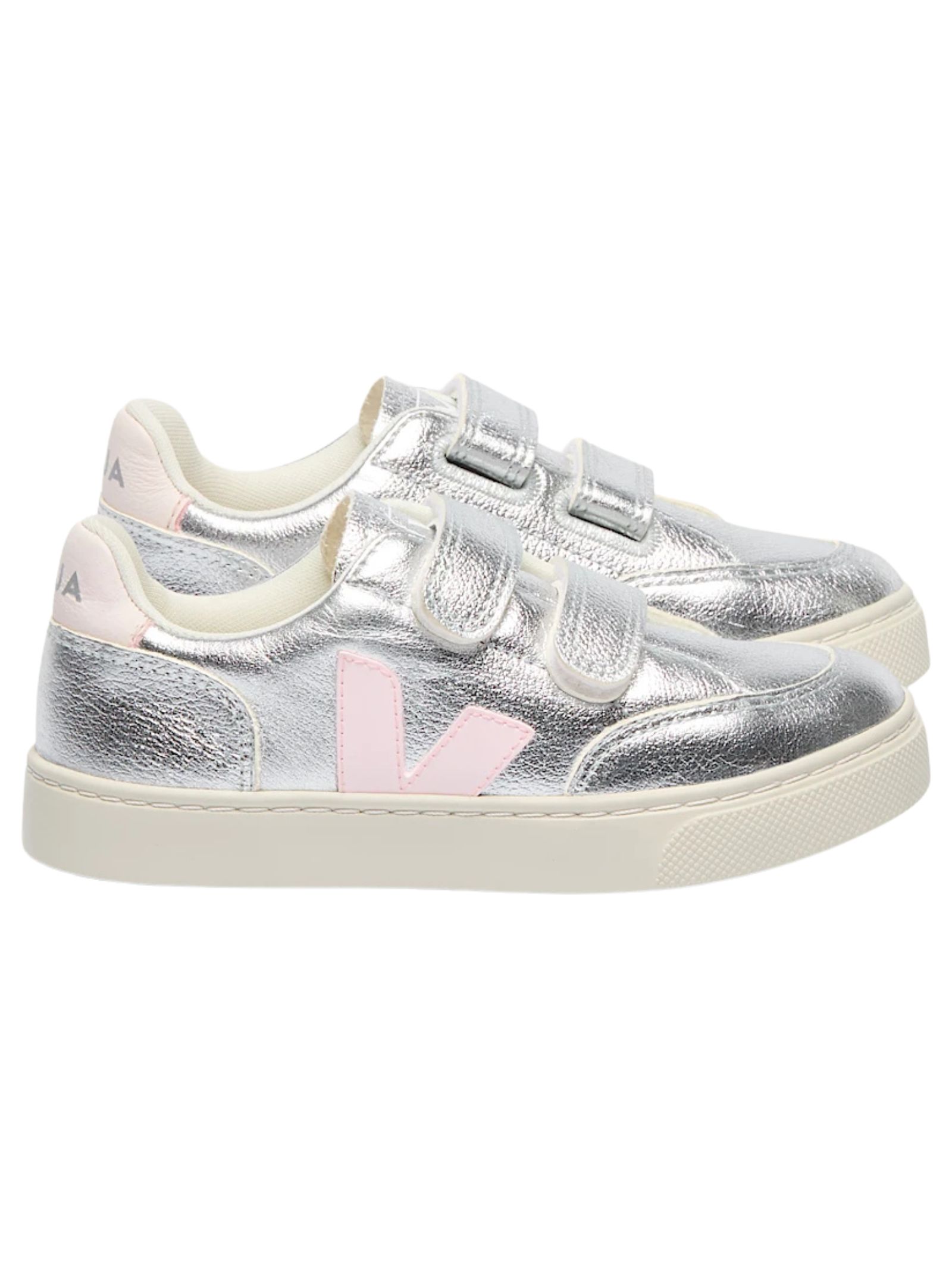 VEJA Kids ChromeFree® leather shoes in silver/pink, featuring a round toe, a printed logo tongue, a side logo, a contrasting heel counter, a logo insole, a flat rubber sole, and a velcro front fastening. Sole: 100% rubber. Lining: 100% fabric. Outer: 100% calfskin.