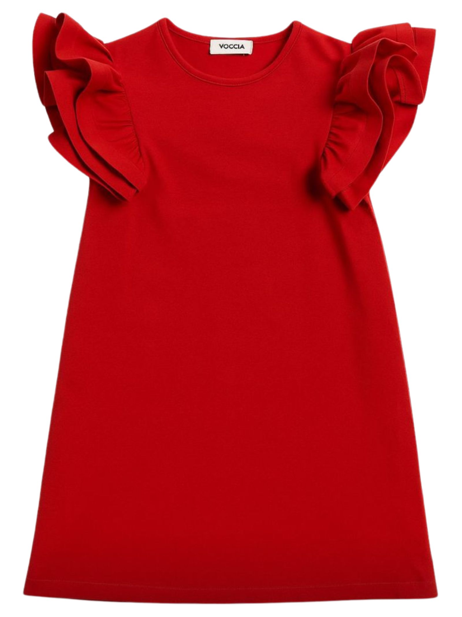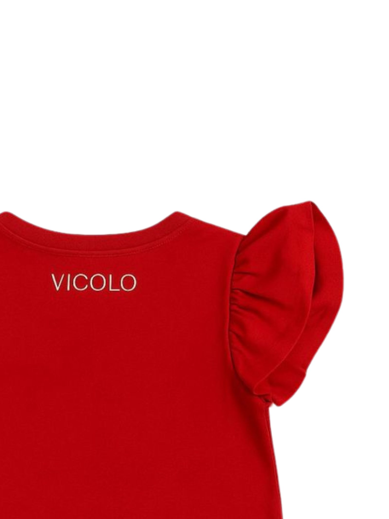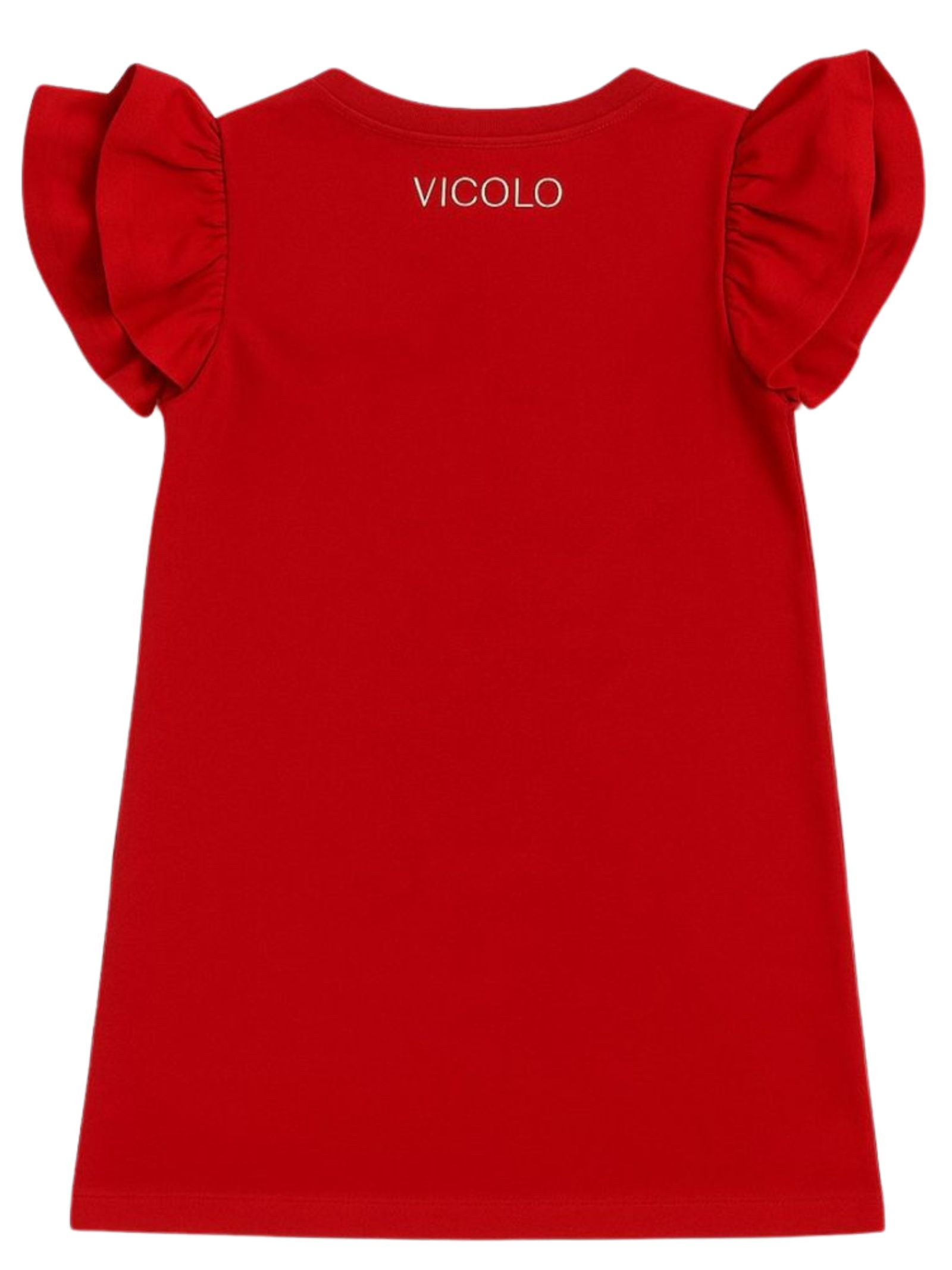 Vicolo Kids red dress, crew neck, ruffled sleeves, A-line design, logo on the back, regular fit. Composition: 94% cotton, 6% elastane. Made in Italy.