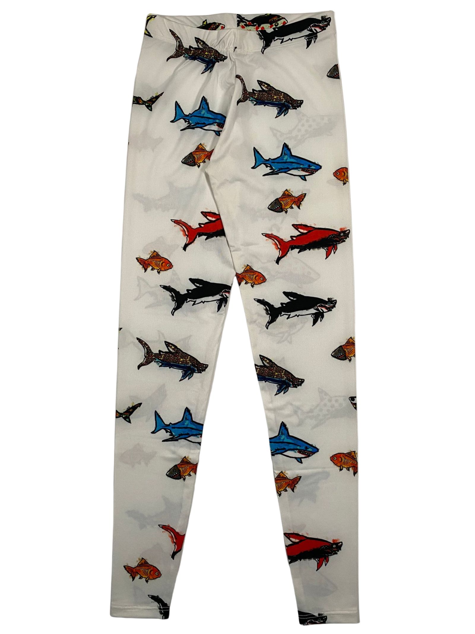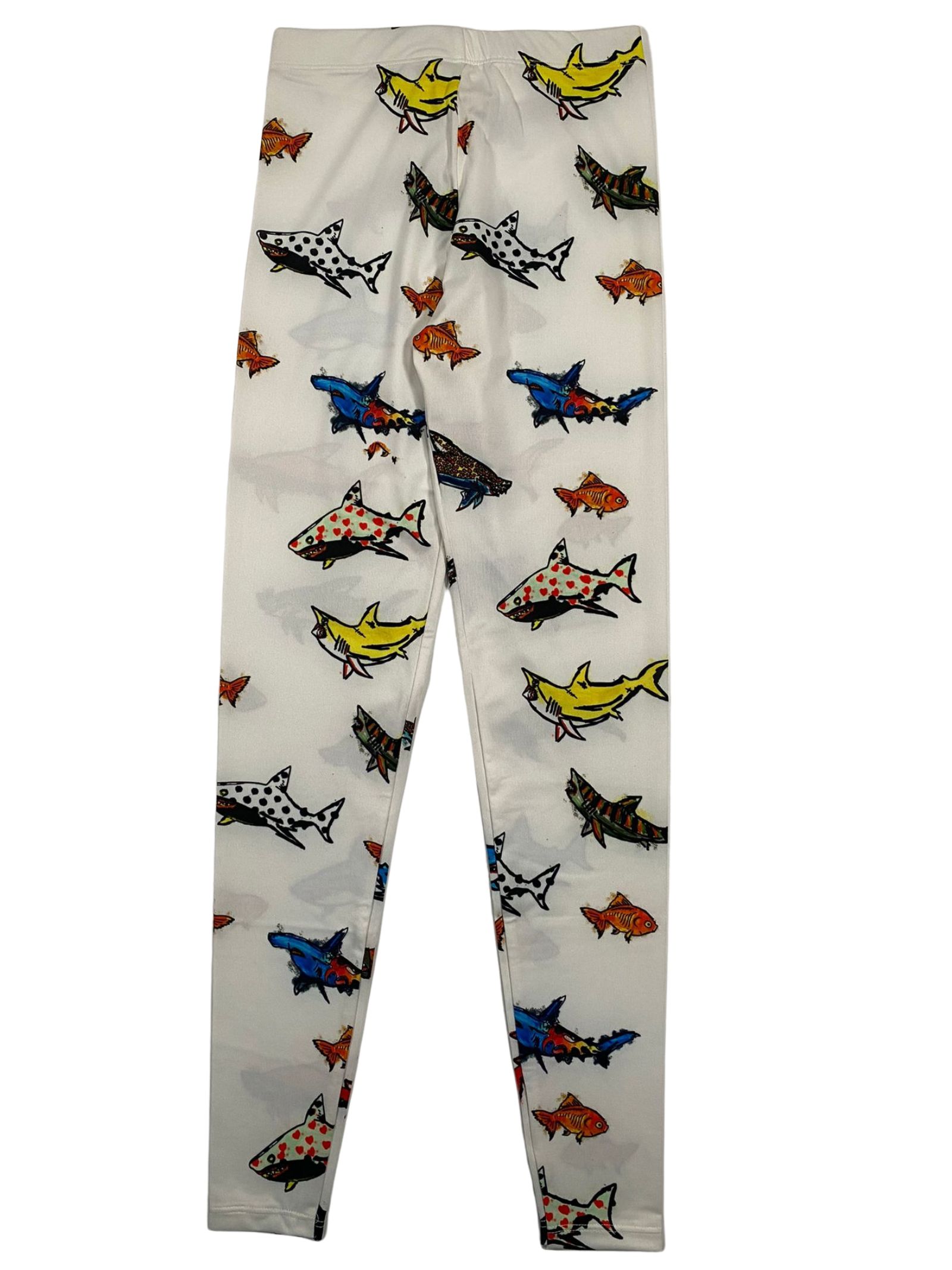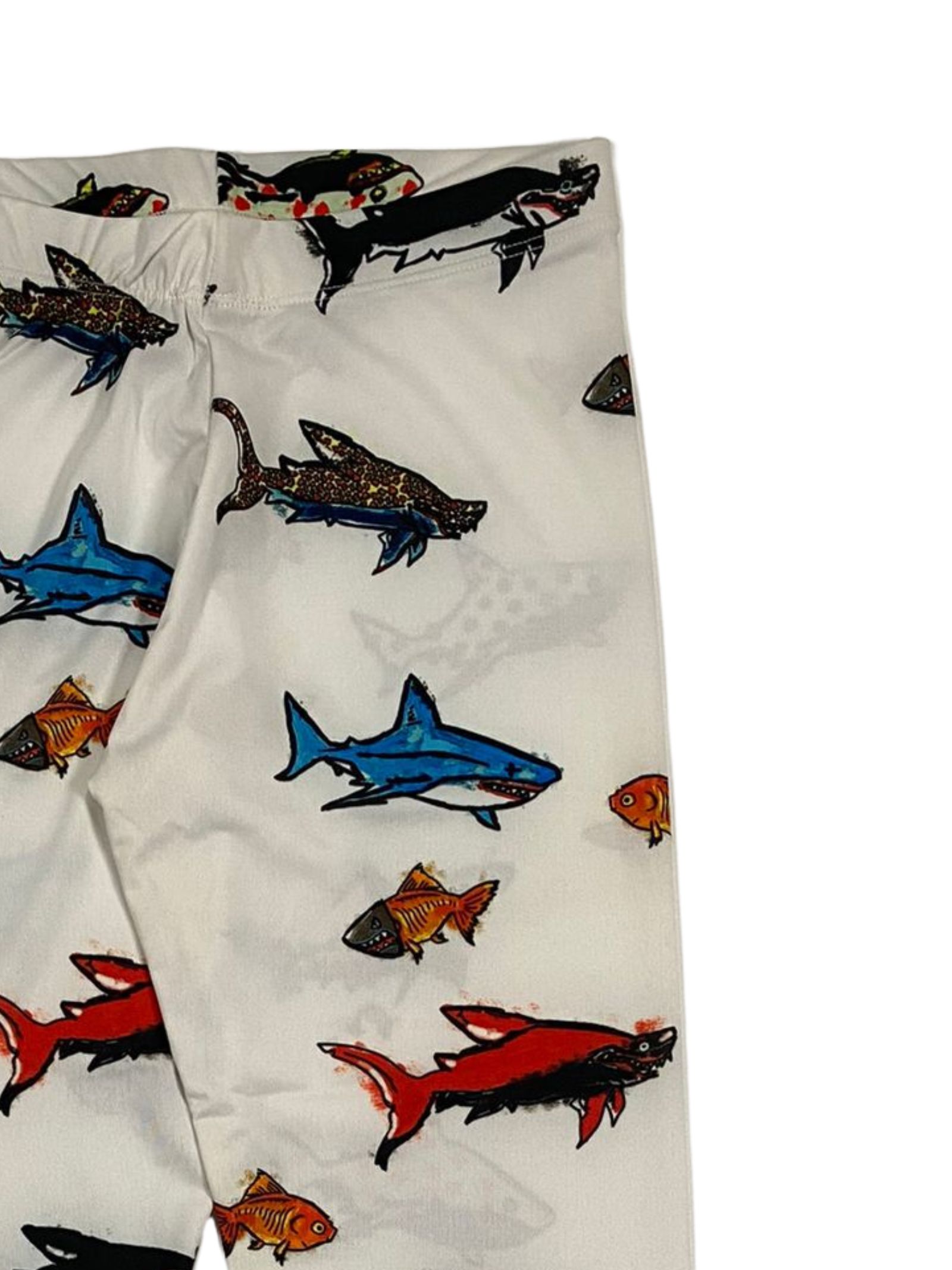 White Kids leggings made of soft white fabric with a contrasting multicolor pattern across the entire surface, elastic waistband, and a fitted design. Composition: 100% polyester. Made in Italy.
