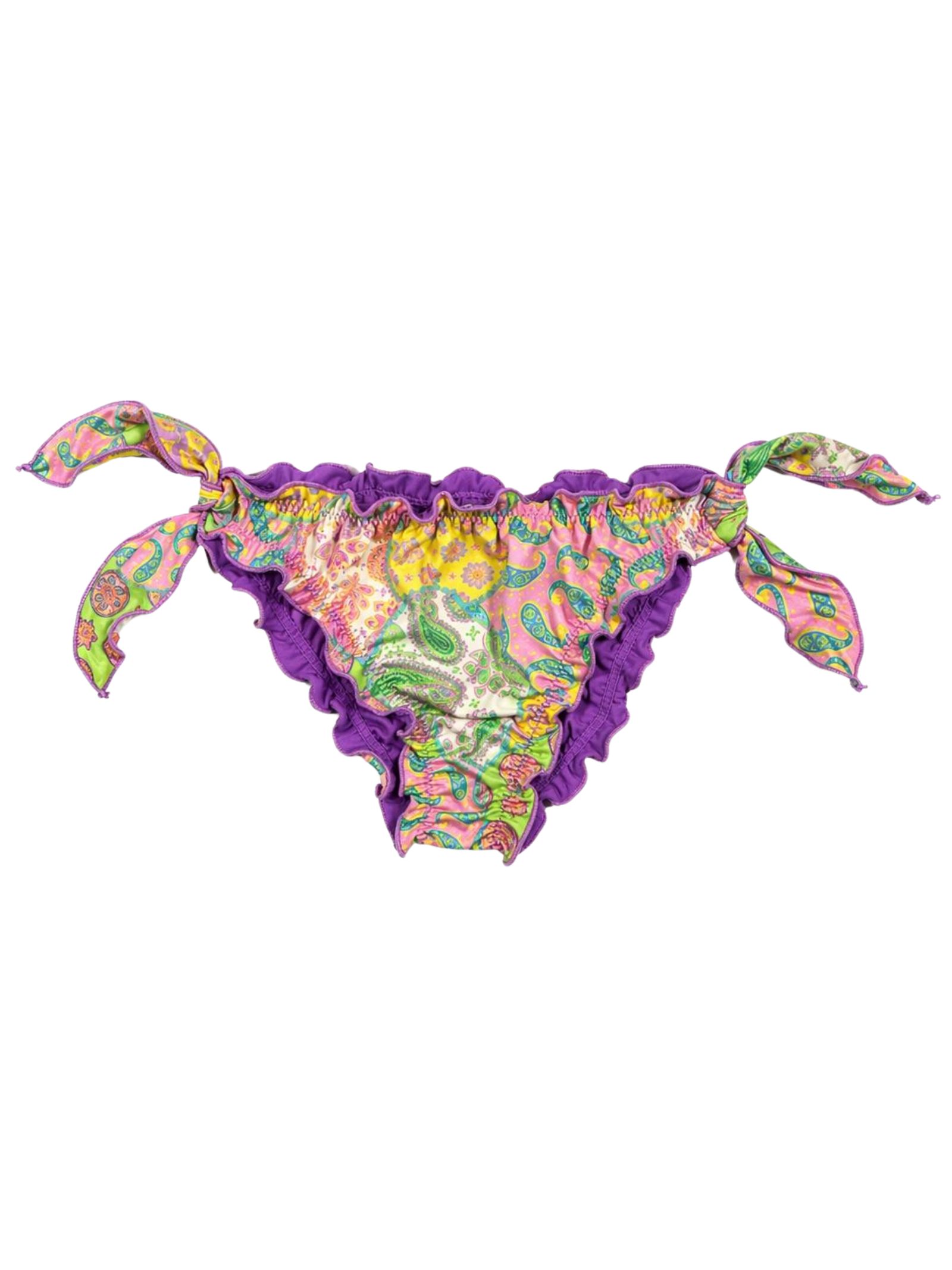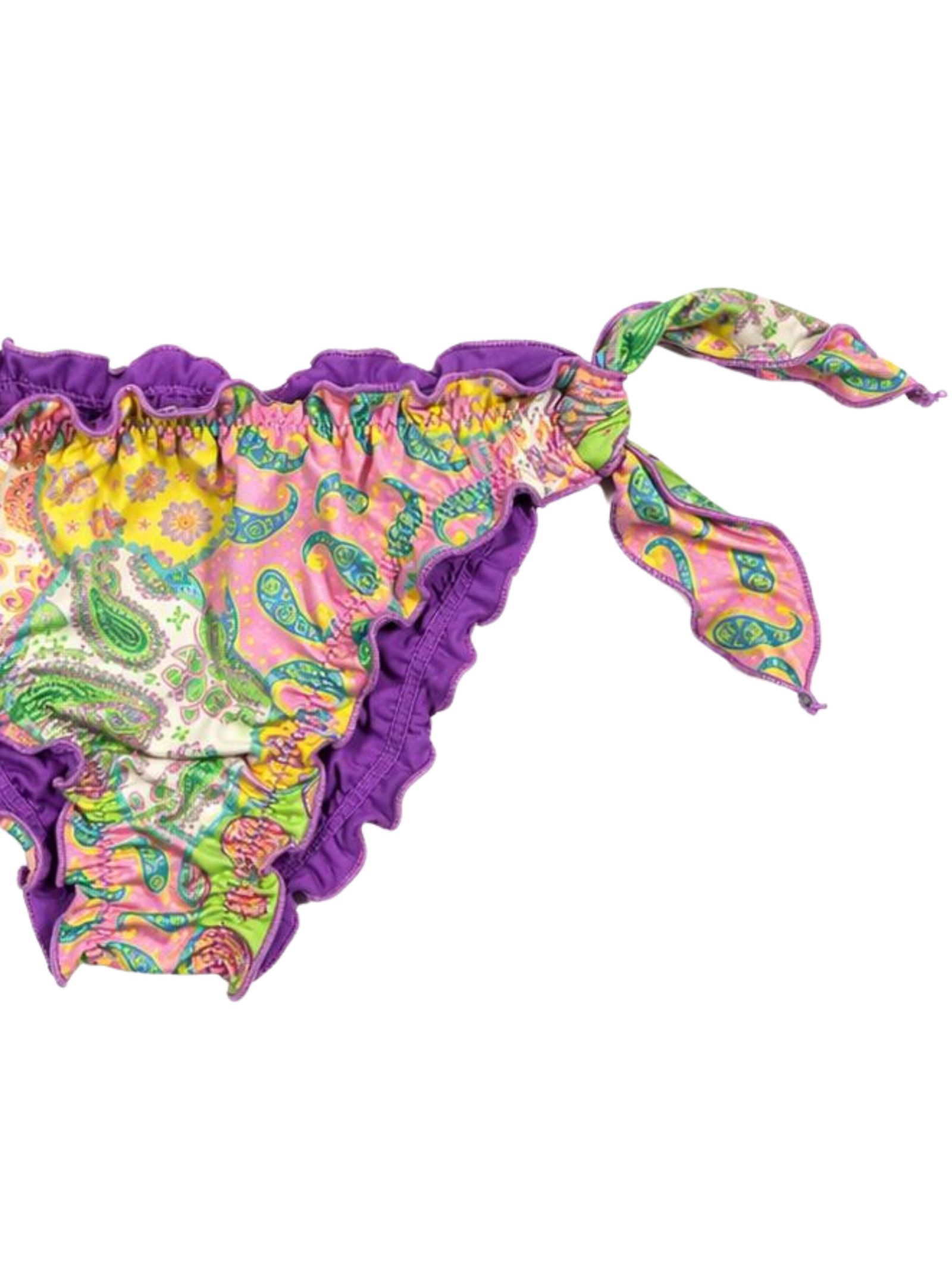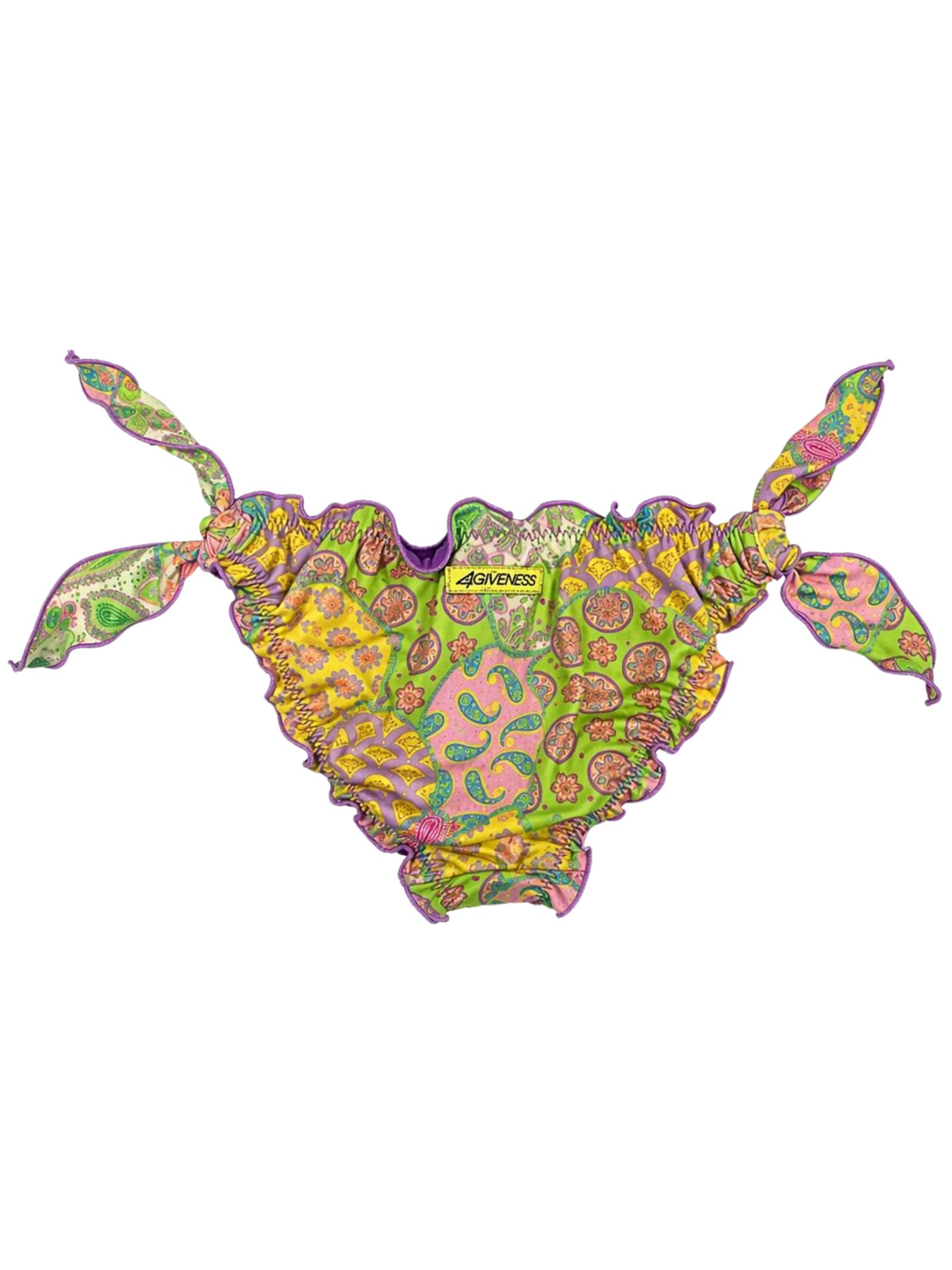 4GIVENESS Kids costume da bagno modello slip di colore multicolor/viola con stampe iconiche del brand, design con fiocchetti laterali, dettaglio bordi arricciati, patch con logo sul retro. Composizione: 82% poliestere 18% elastan