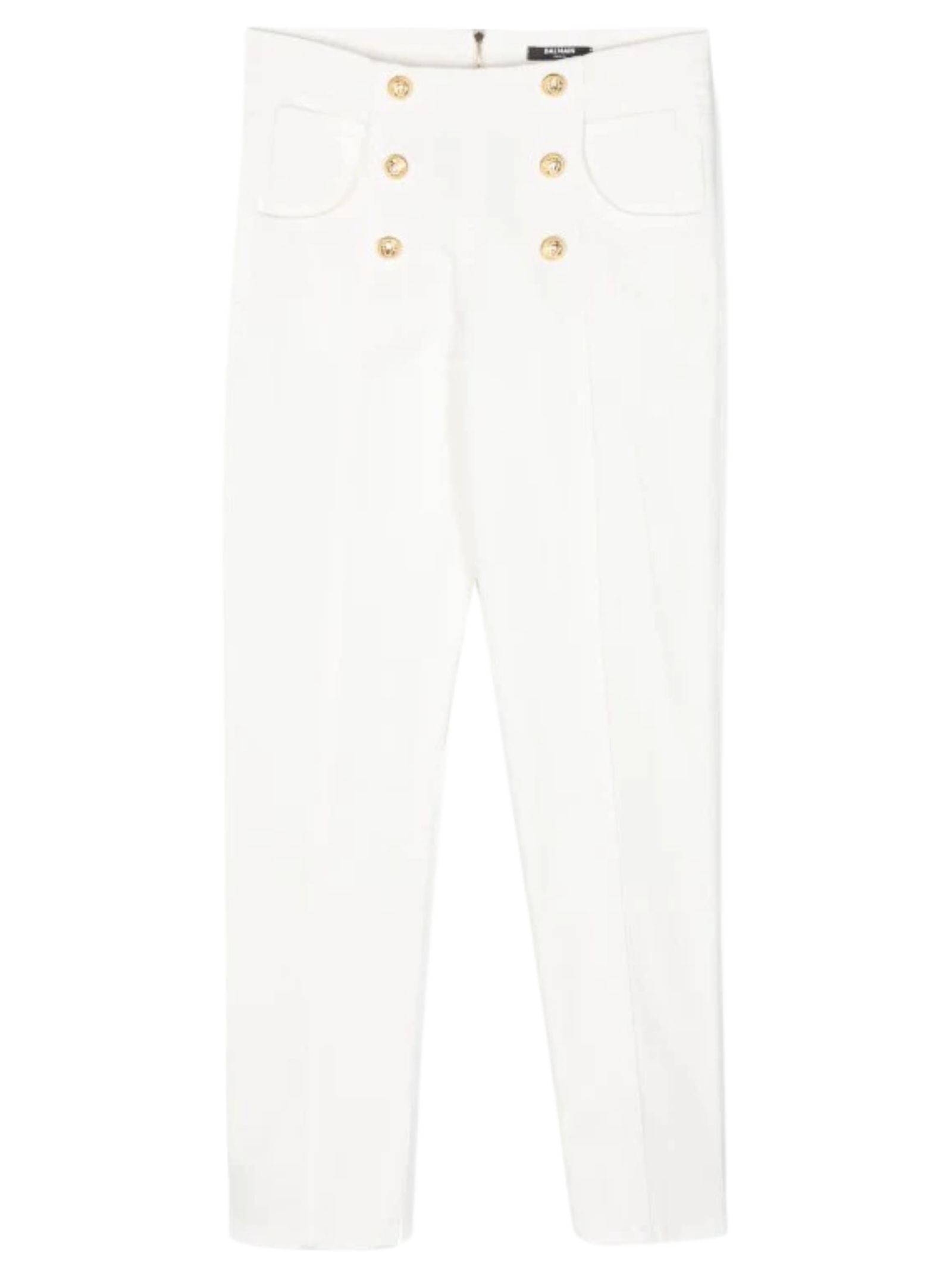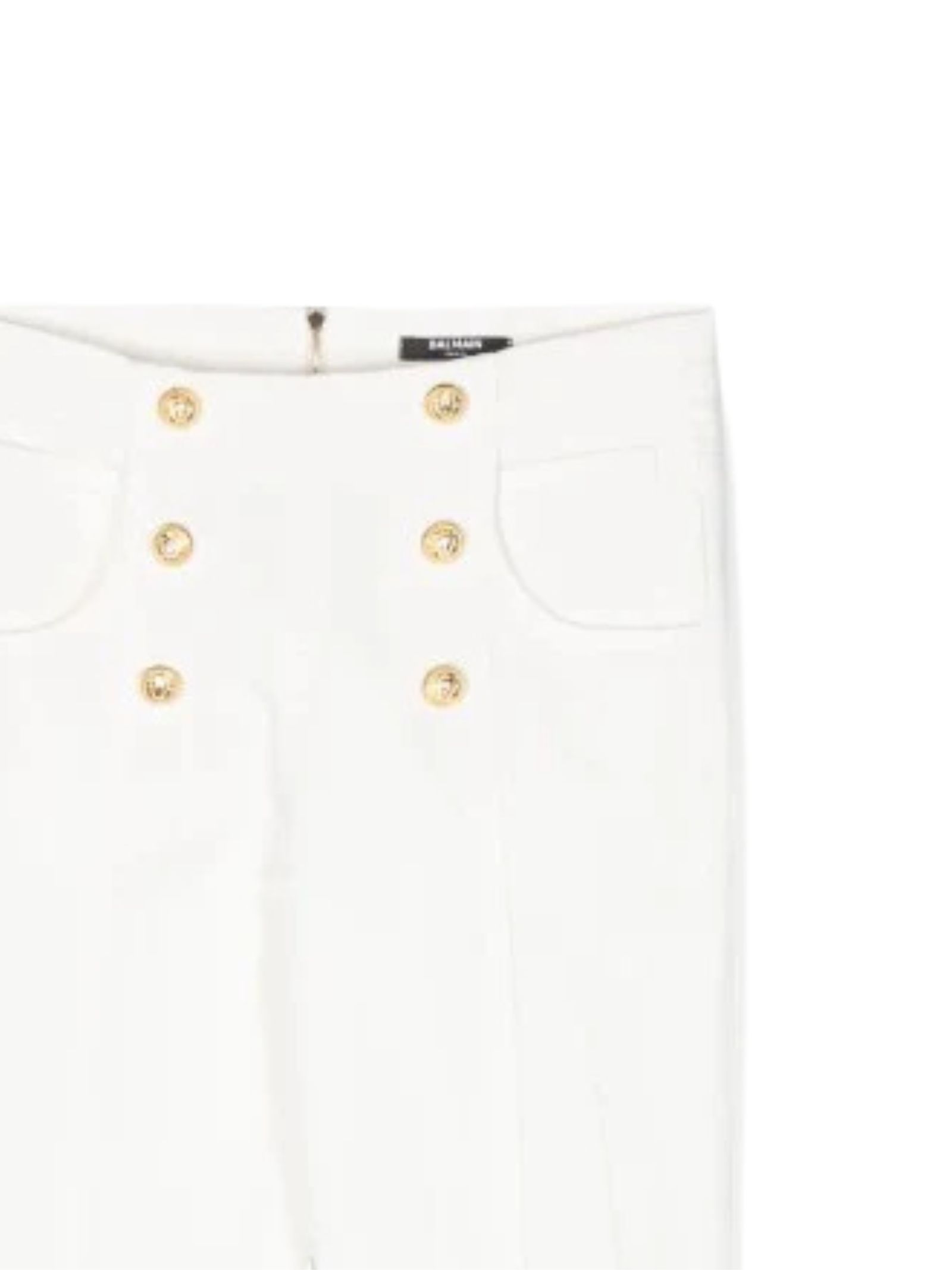Balmain Kids jeans di colore bianco panna, modello con vita alta, multitasche, decorato con bottoni in tono dorato con la testa del leone firmata del marchio, chiusura con zip posteriore, design aderente, patch con logo sul retro. Composizione: 92% cotone 8% modal. Made in Italy