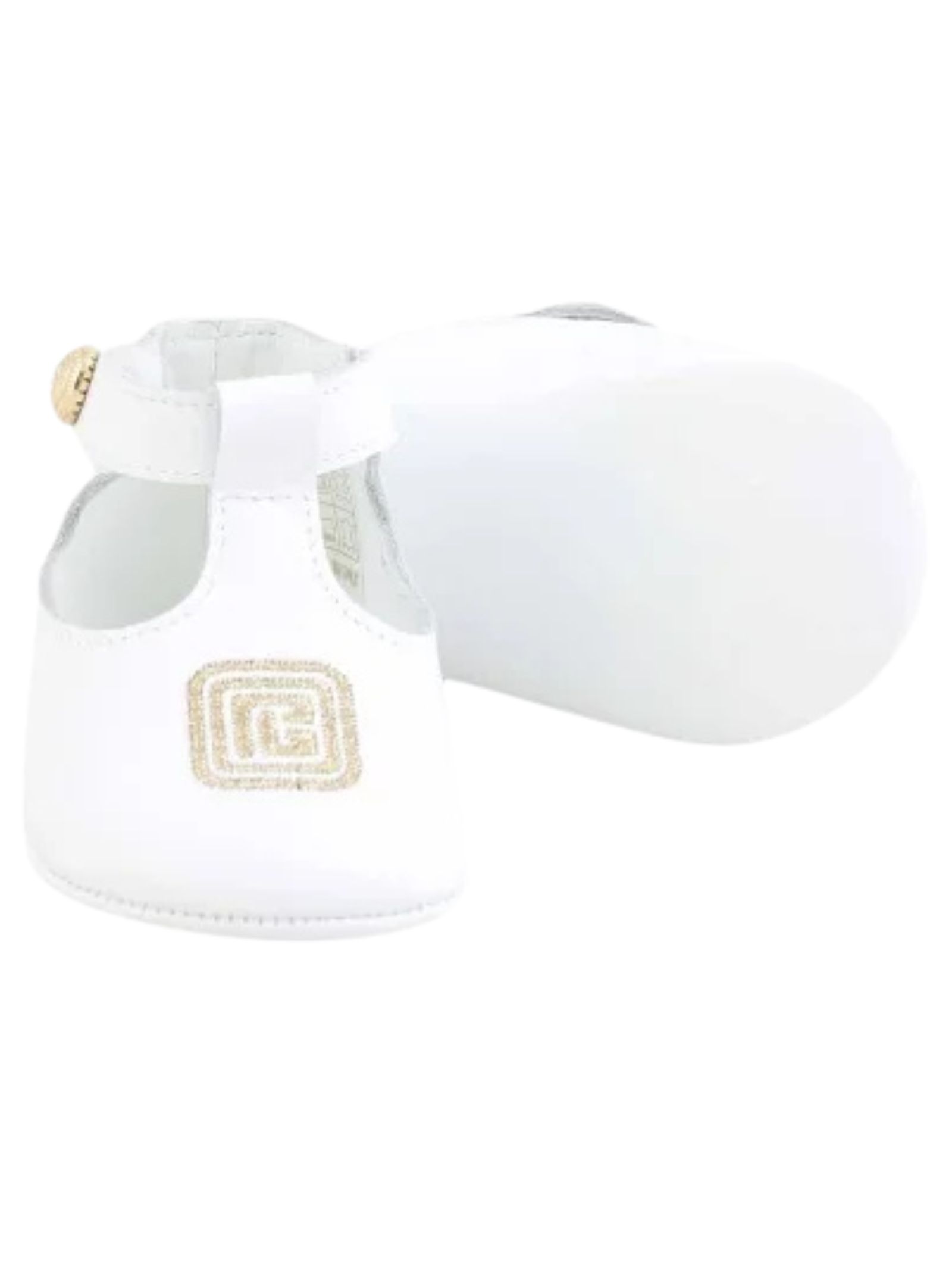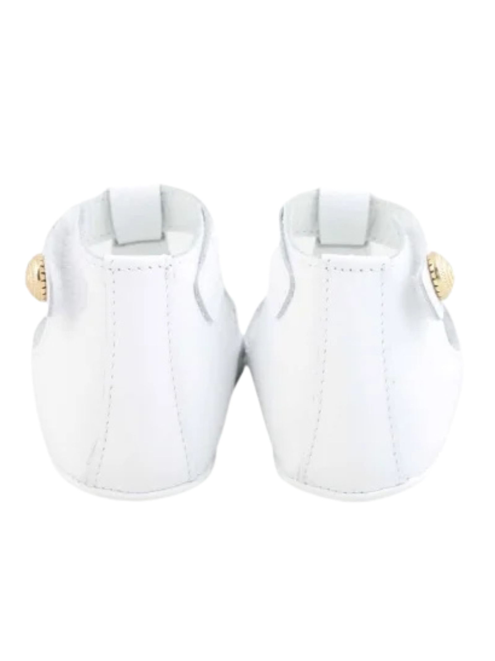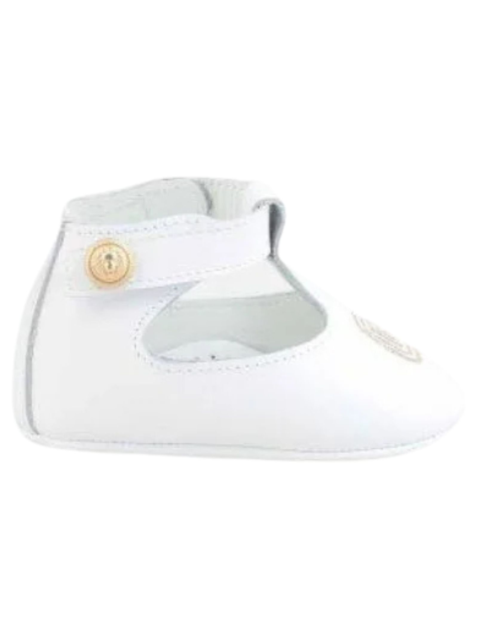 Balmain Kids scarpine pre-walker di colore bianco, dettagli a contrasto oro, realizzate in pelle liscia, punta tonda, chiusura con velcro, logo impresso. Made in Italy