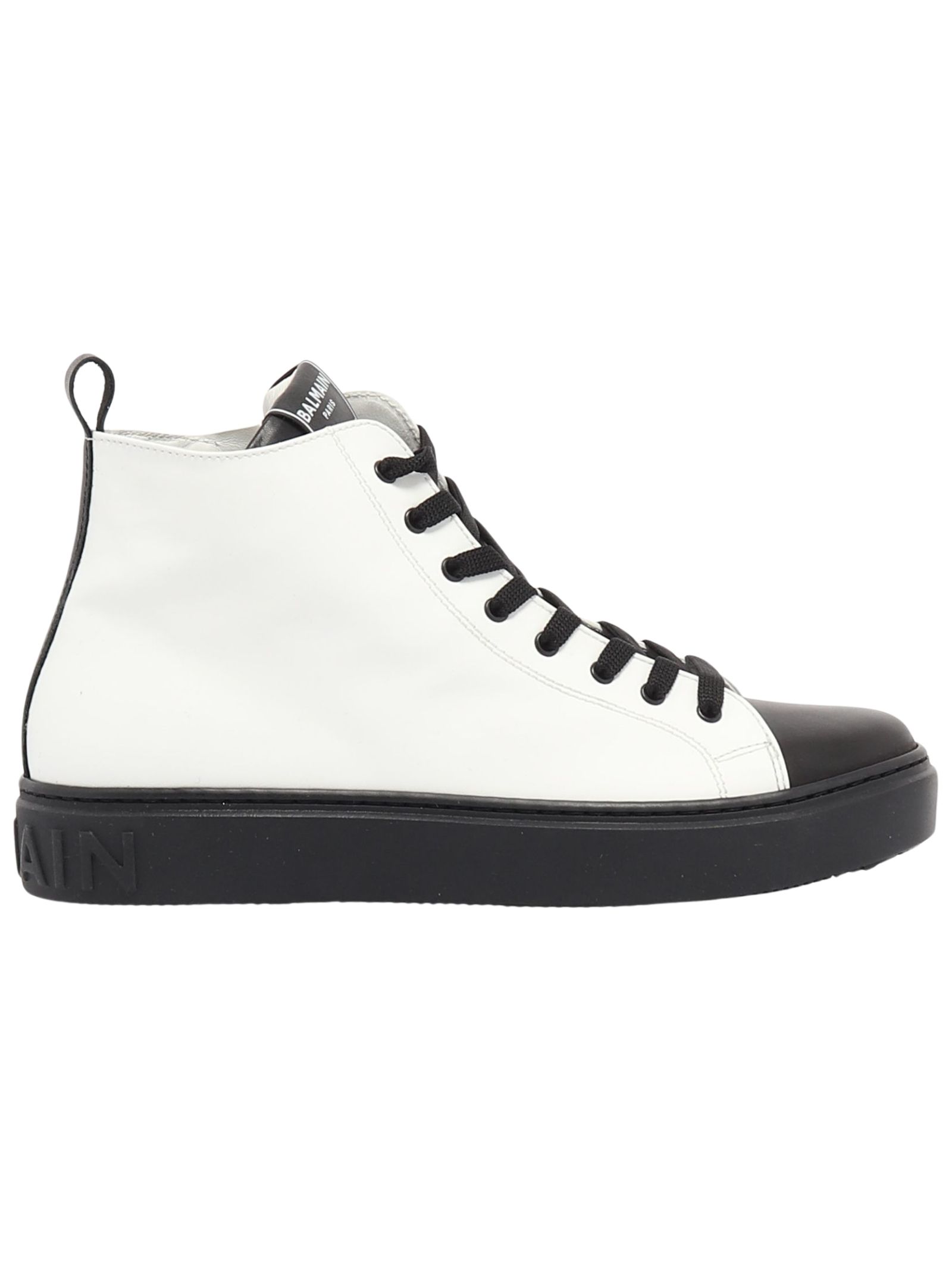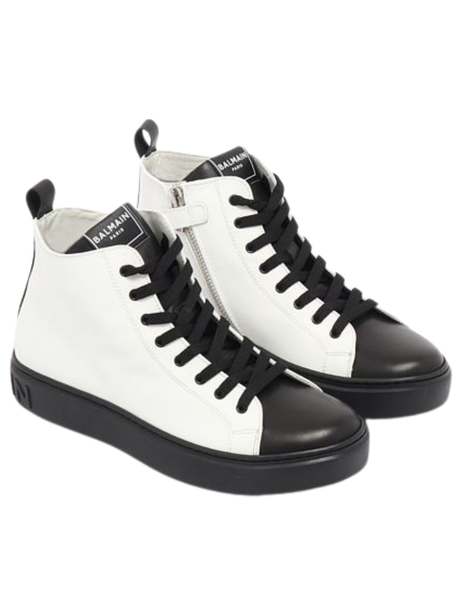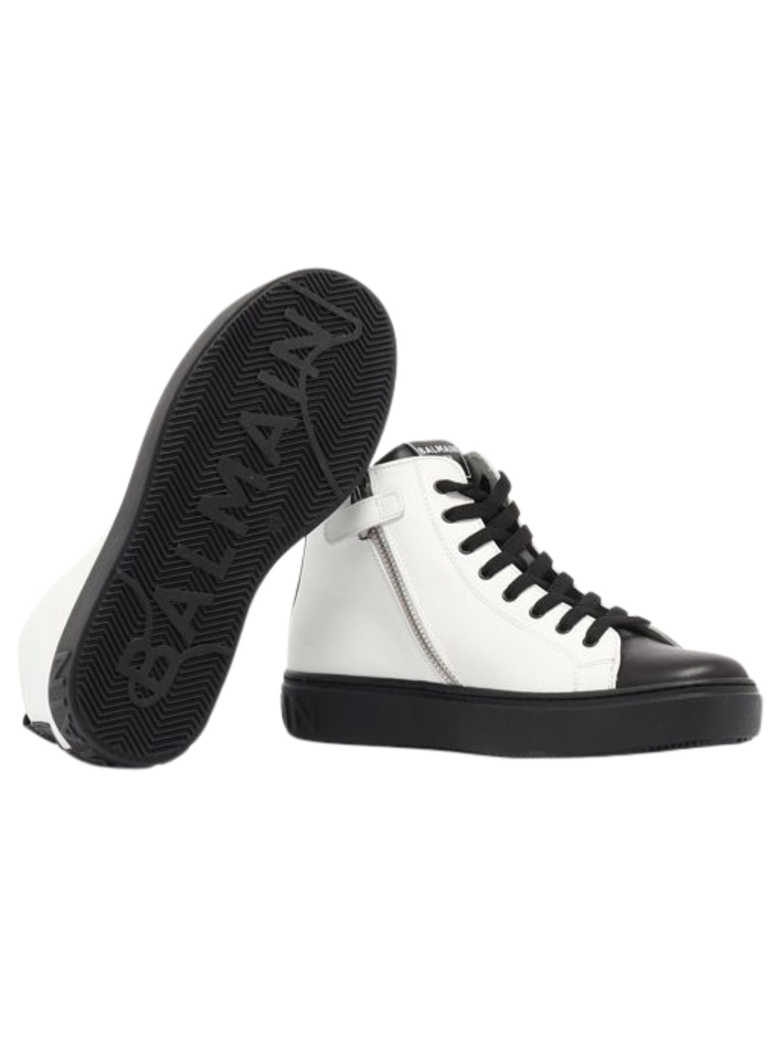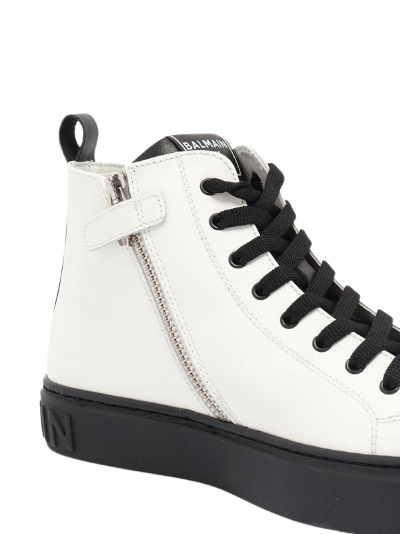 Balmain Kids scarpe di colore bianco/nero, realizzate in pelle liscia, design collo alto con punta tonda, chiusura frontale con lacci, zip laterale, logo impresso sul retro, interno in pelle, suola piatta in gomma, soletta in cuoio. Made in Italy