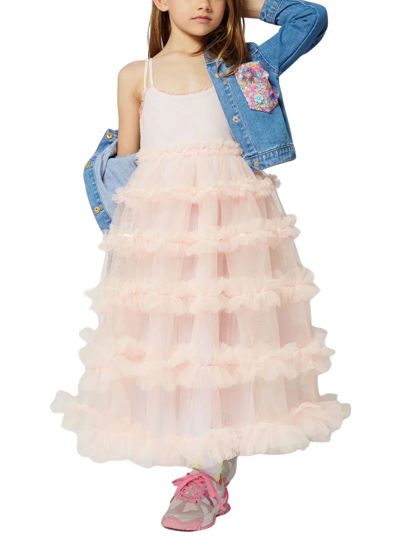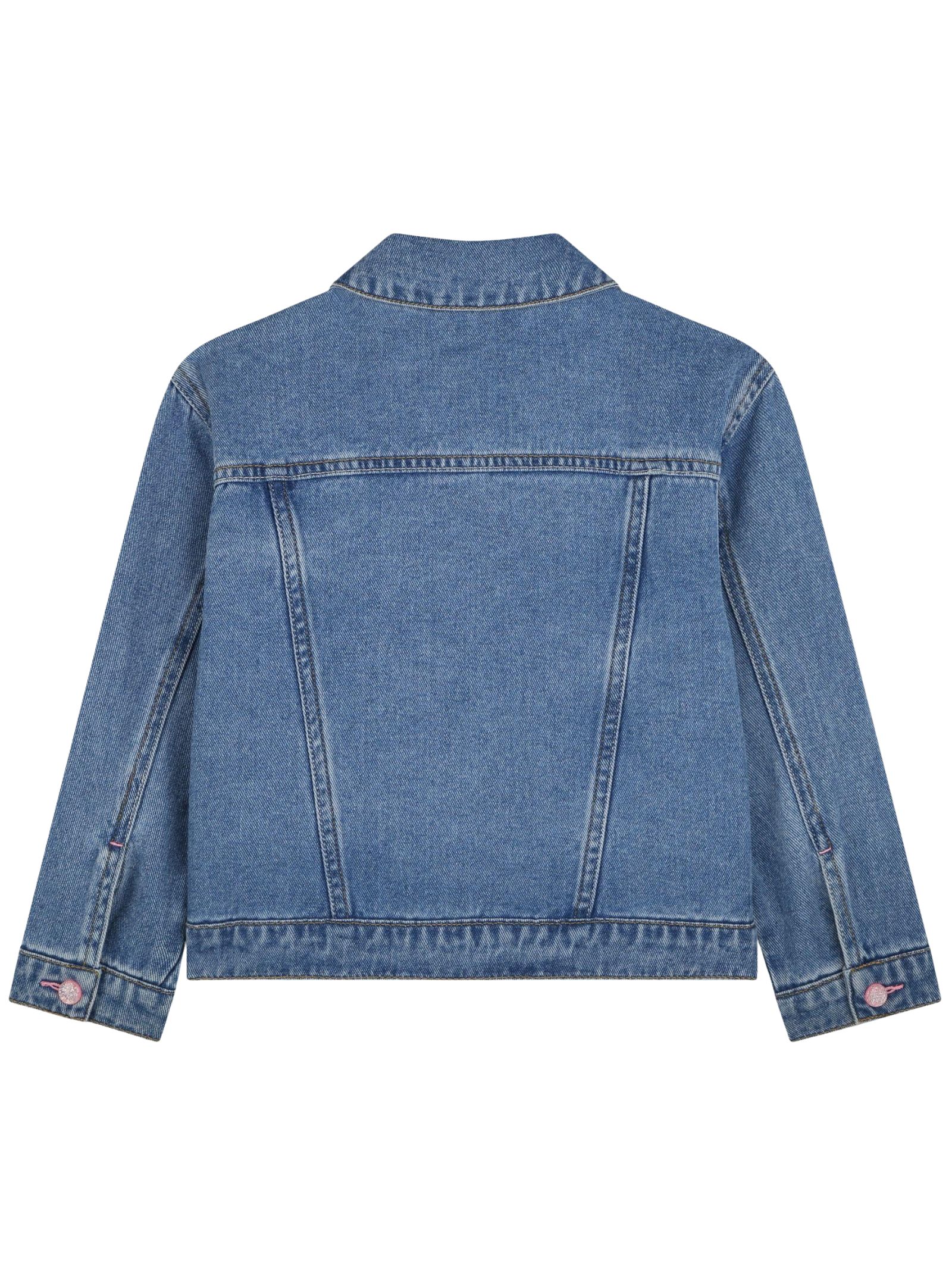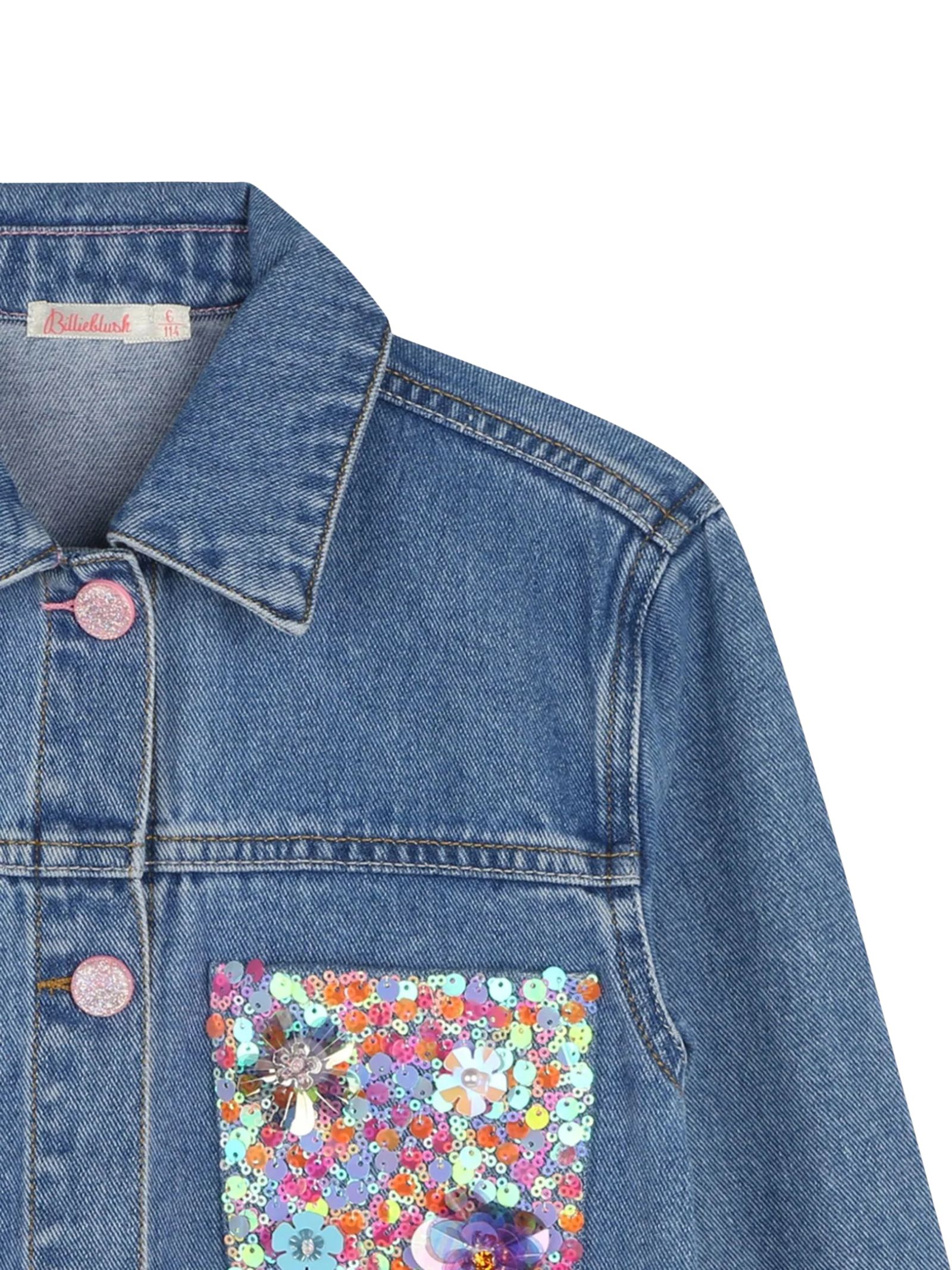 Billieblush Kids giubbino in cotone denim dal lavaggio blu, due tasche applicate con paillettes e fiori applicati a contrasto multicolor, bottoni automatici glitterati, maniche lunghe con polsini e bottone, vestibilità regolare. Composizione: 100% Cotone