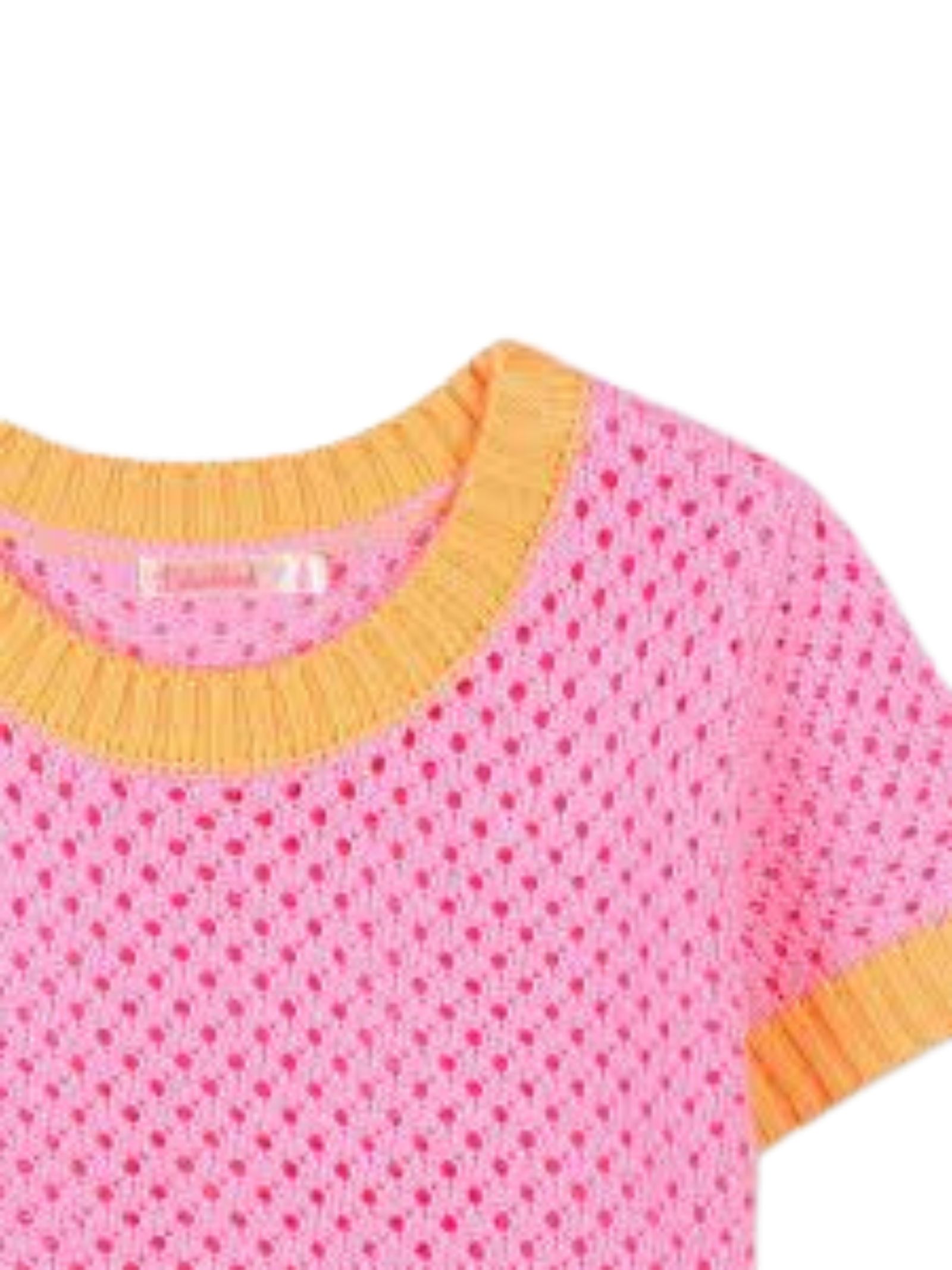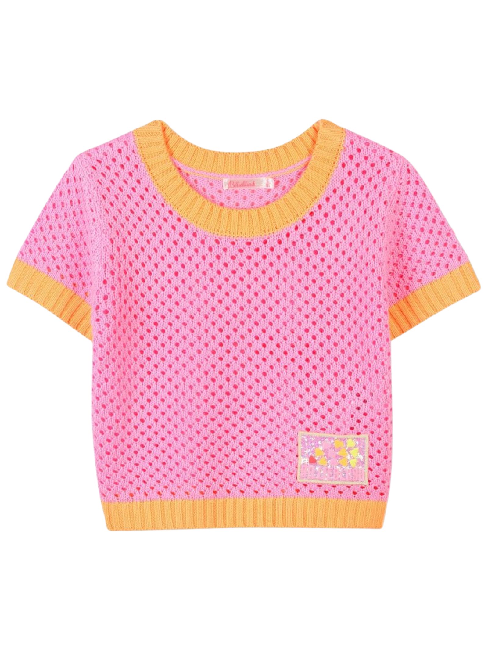 Billieblush Kids maglia di colore rosa/arancio fluo lavorata a maglia traforata, modello corto, girocollo, mezze maniche, patch con logo applicato, orli a costine, vestibilità regolare. Composizione: 100% acrilica