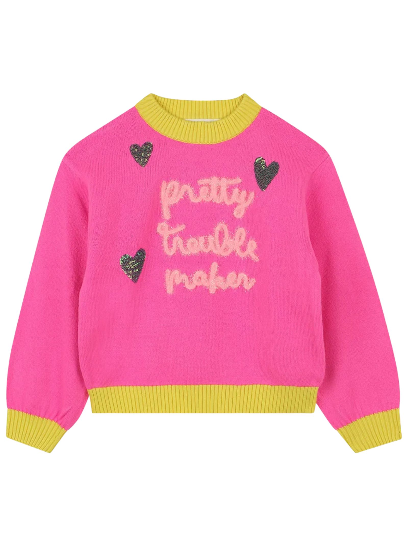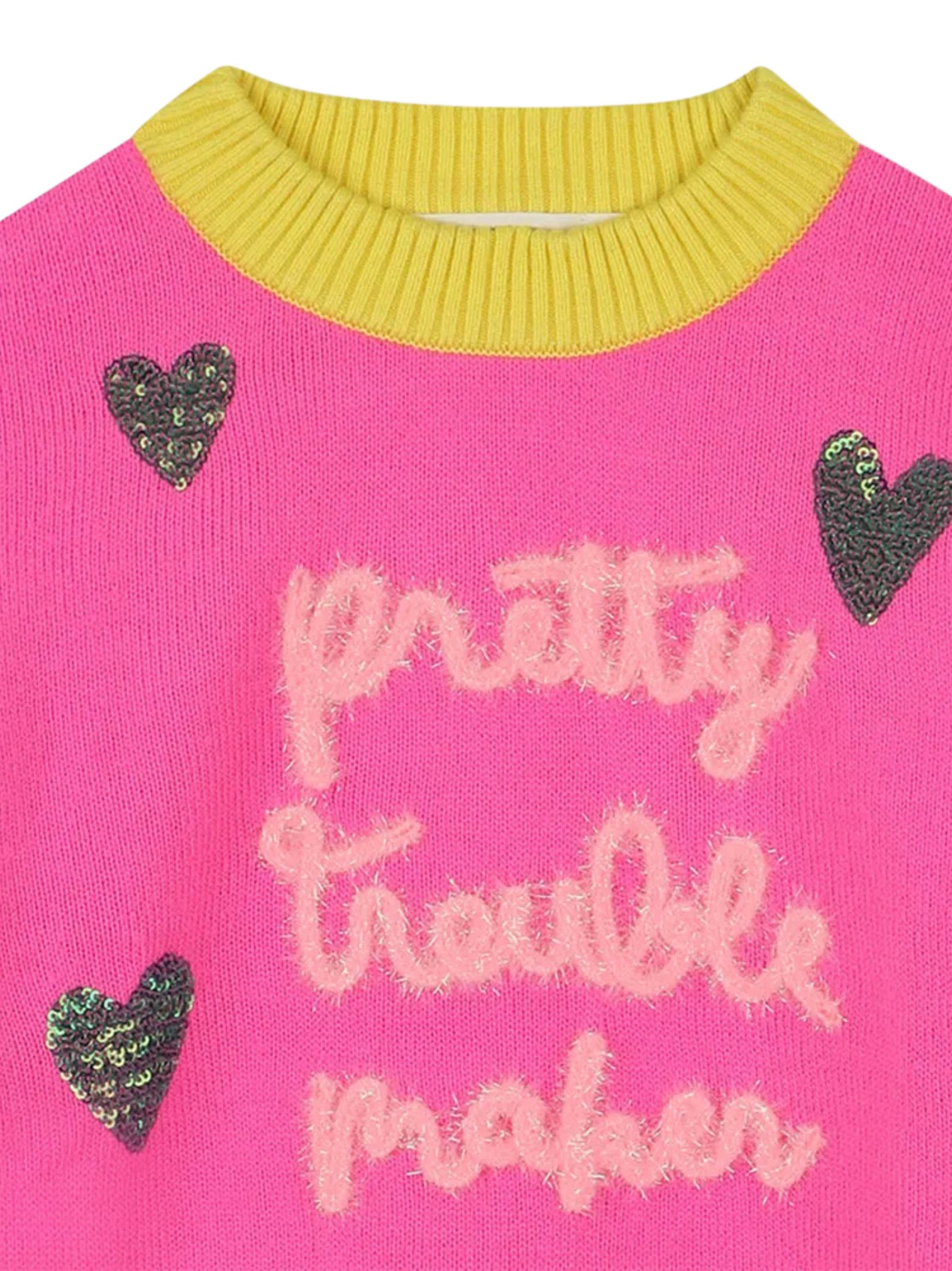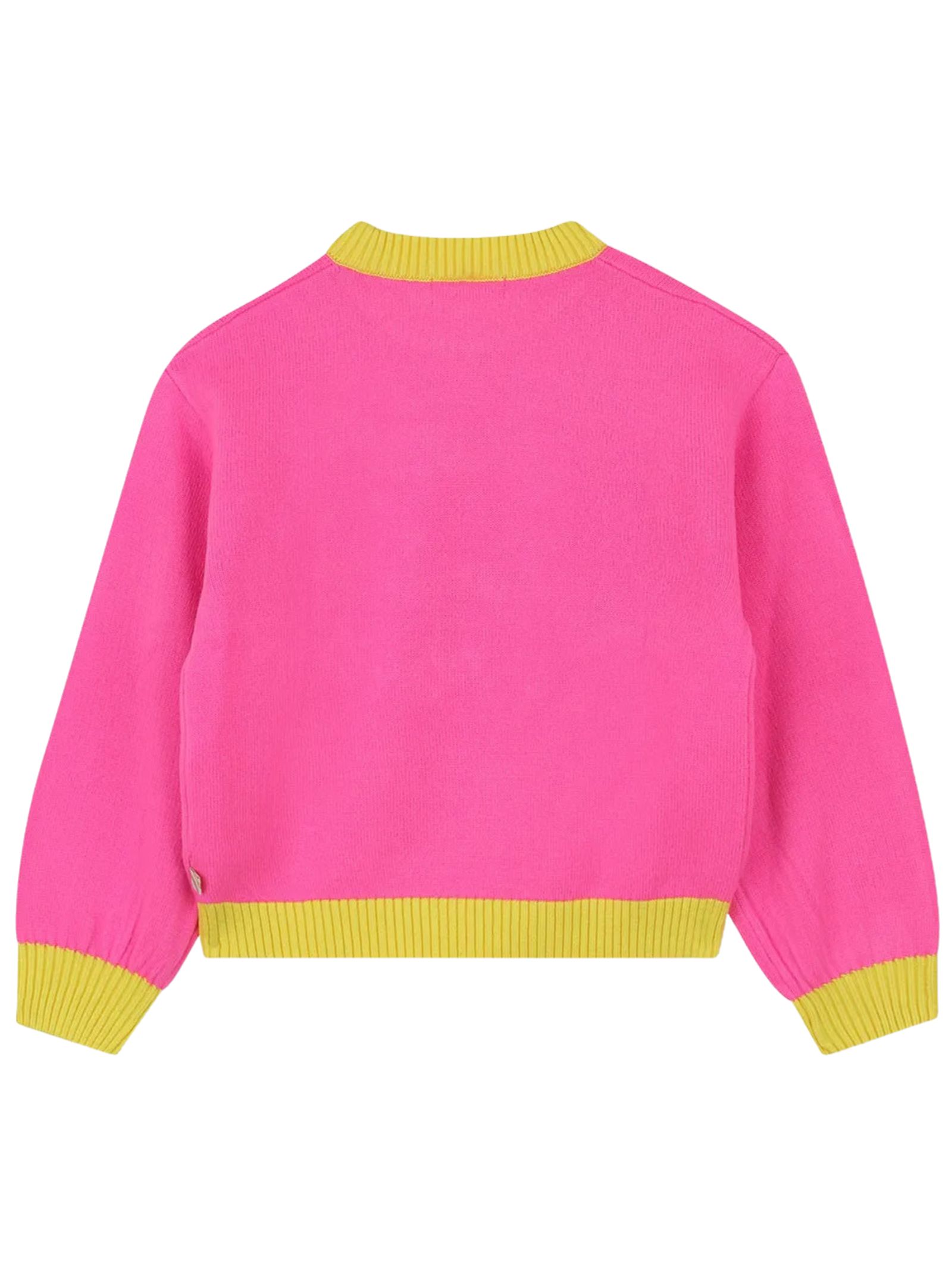 Billieblush Kids maglione di colore fucsia lavorato a maglia, modello girocollo, illustrazione jacquard impreziosita da paillettes, dettagli a contrasto multicolor, vestibilità regolare. Composizione: 100% acrilica