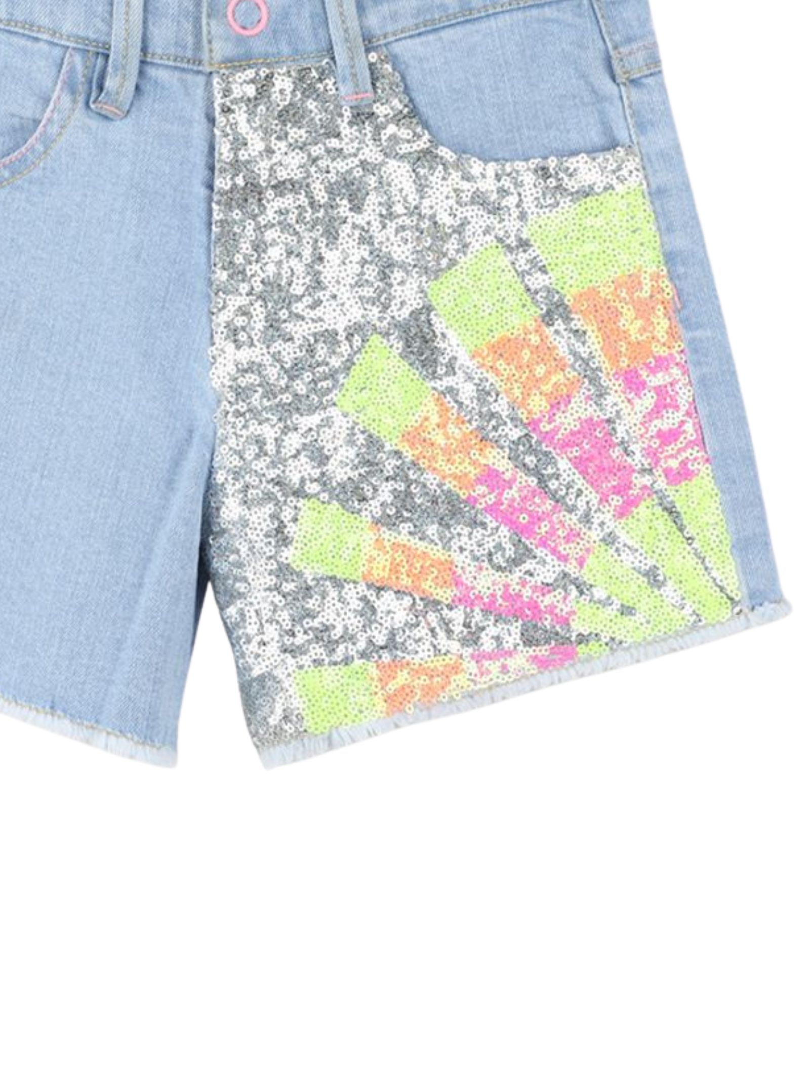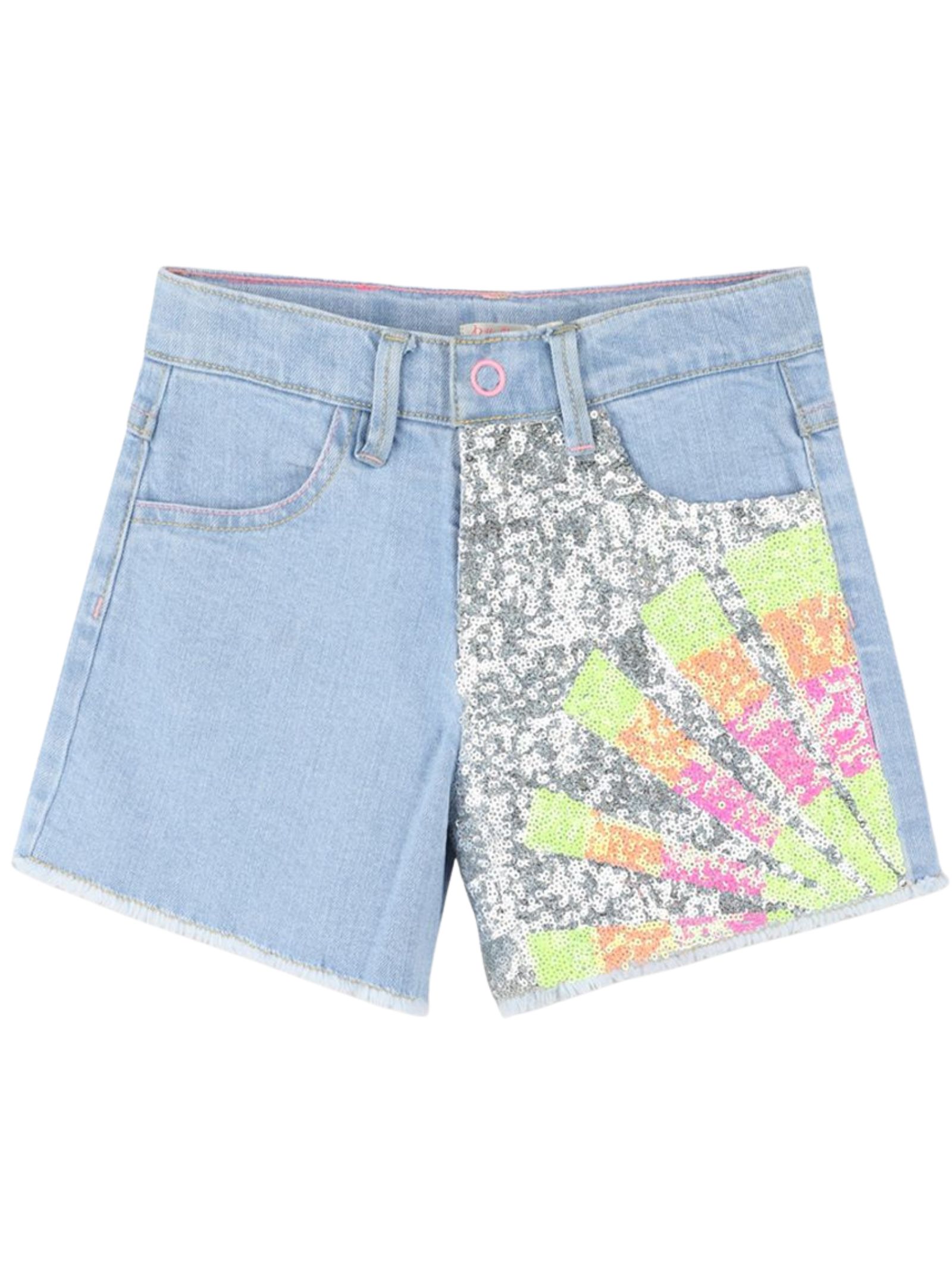 Billieblush Kids shorts in denim chiaro, cuciture a vista a contrasto rosa, vita regolare con bottone e zip, elastici interni, design a 4 tasche, dettaglio applicazione paillettes in multicolor, patch con logo sul retro, orlo sfrangiato. Composizione: 99% cotone 1% elastan