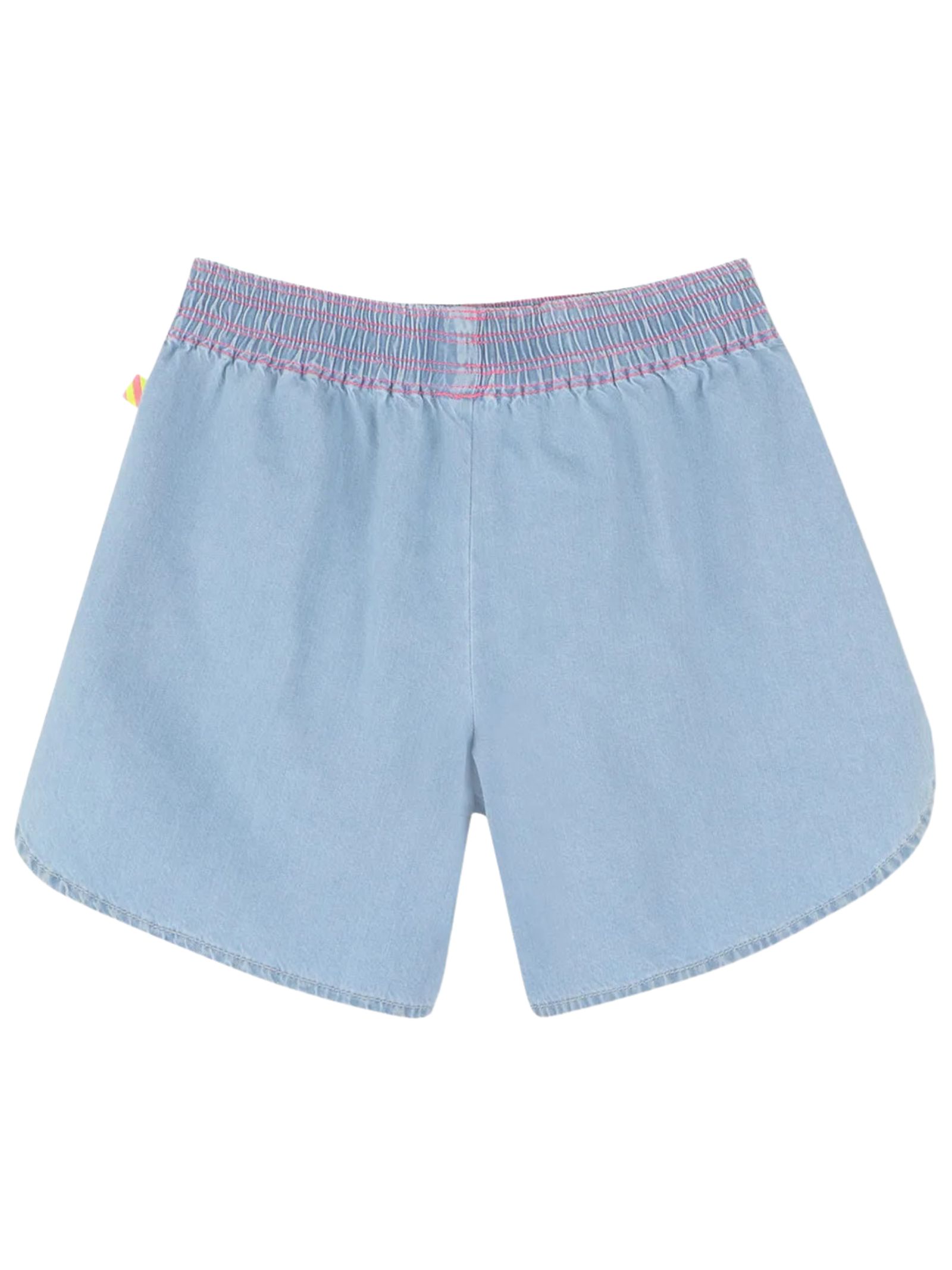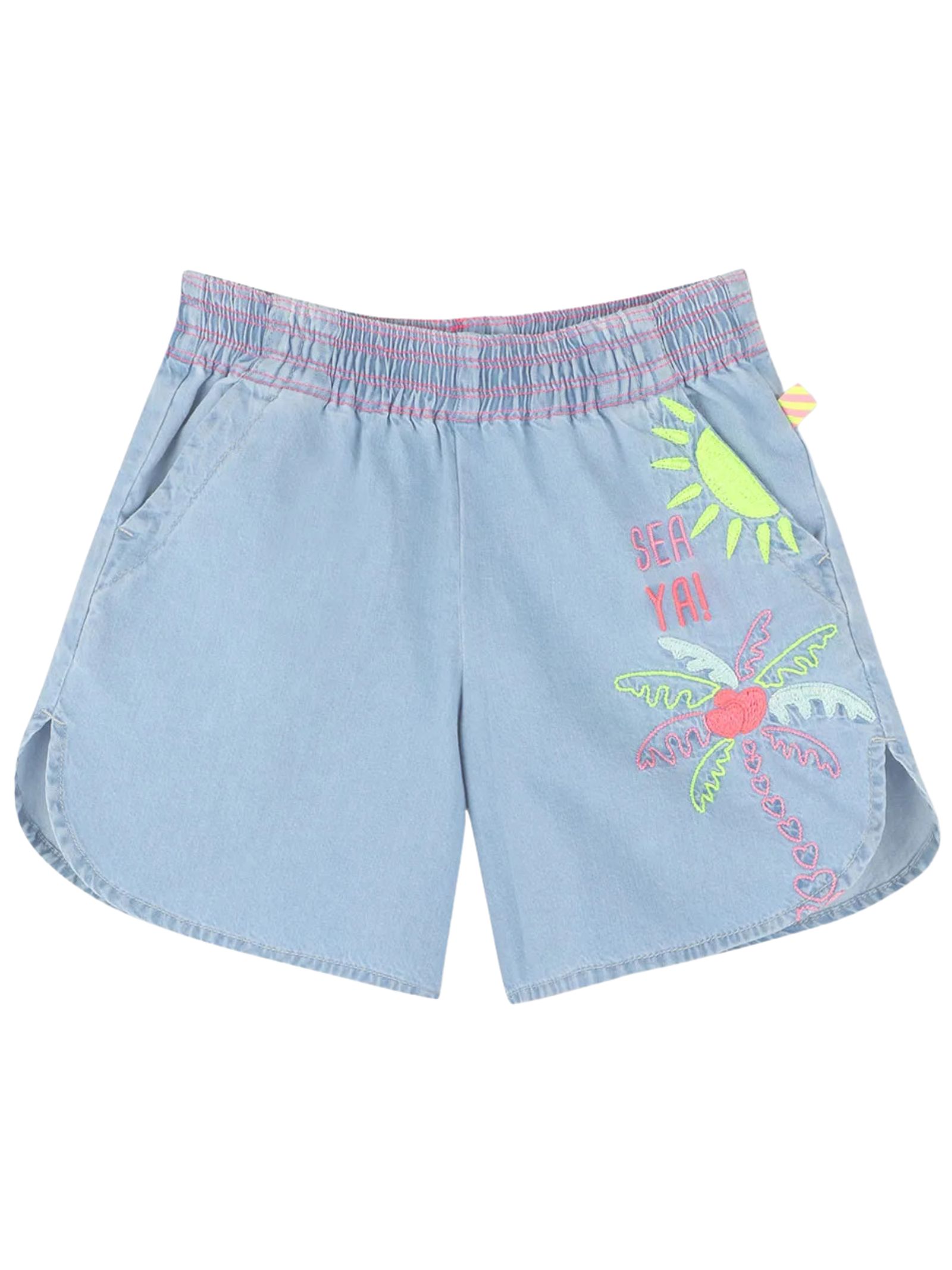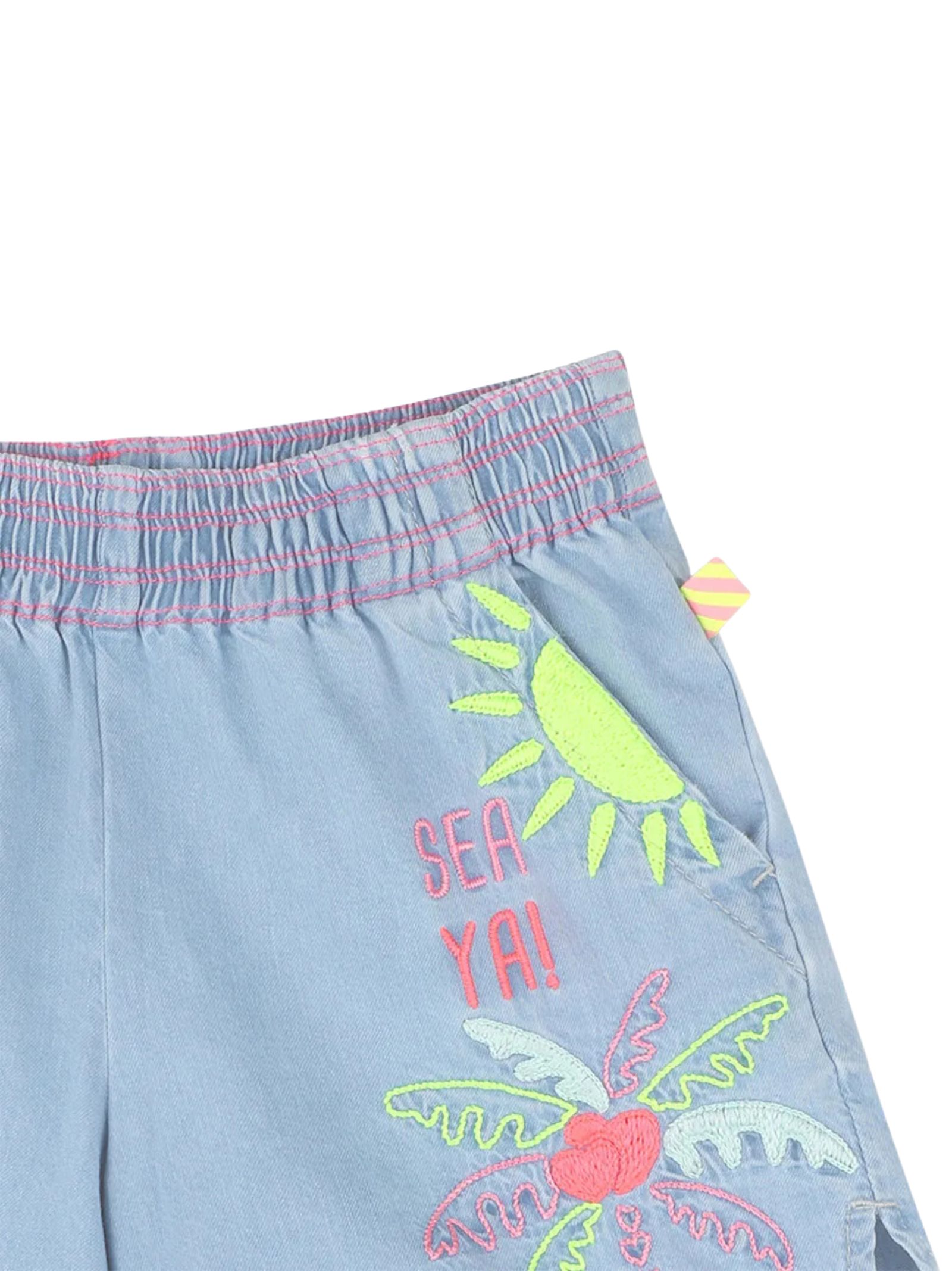 Billieblush Kids shorts in cotone denim di colore azzurro, dettaglio ricami a contrasto multicolor, modello con vita aderente, due tasche laterali, spacchetti laterali, vestibilità regolare. Composizione: 100% Cotone