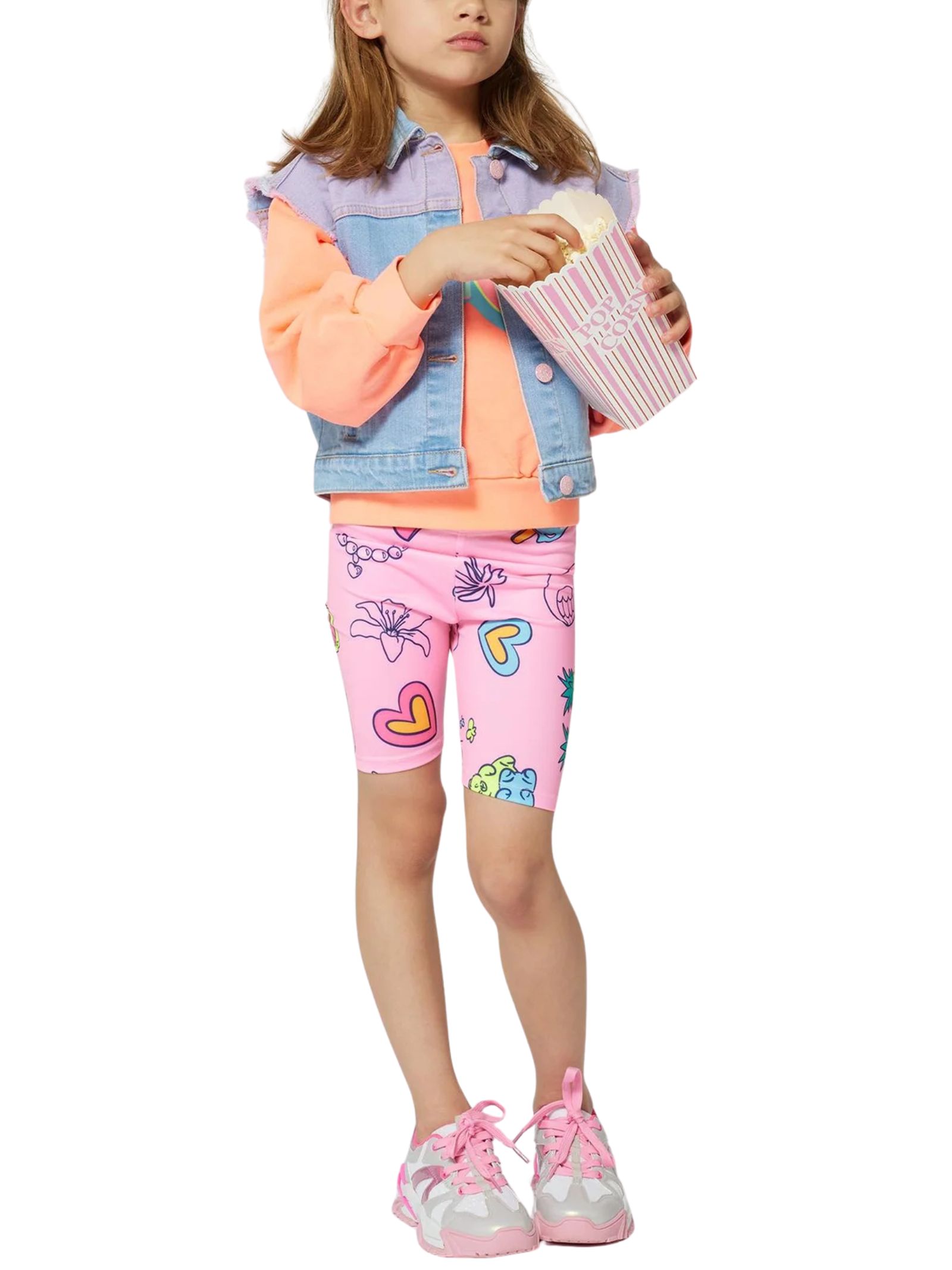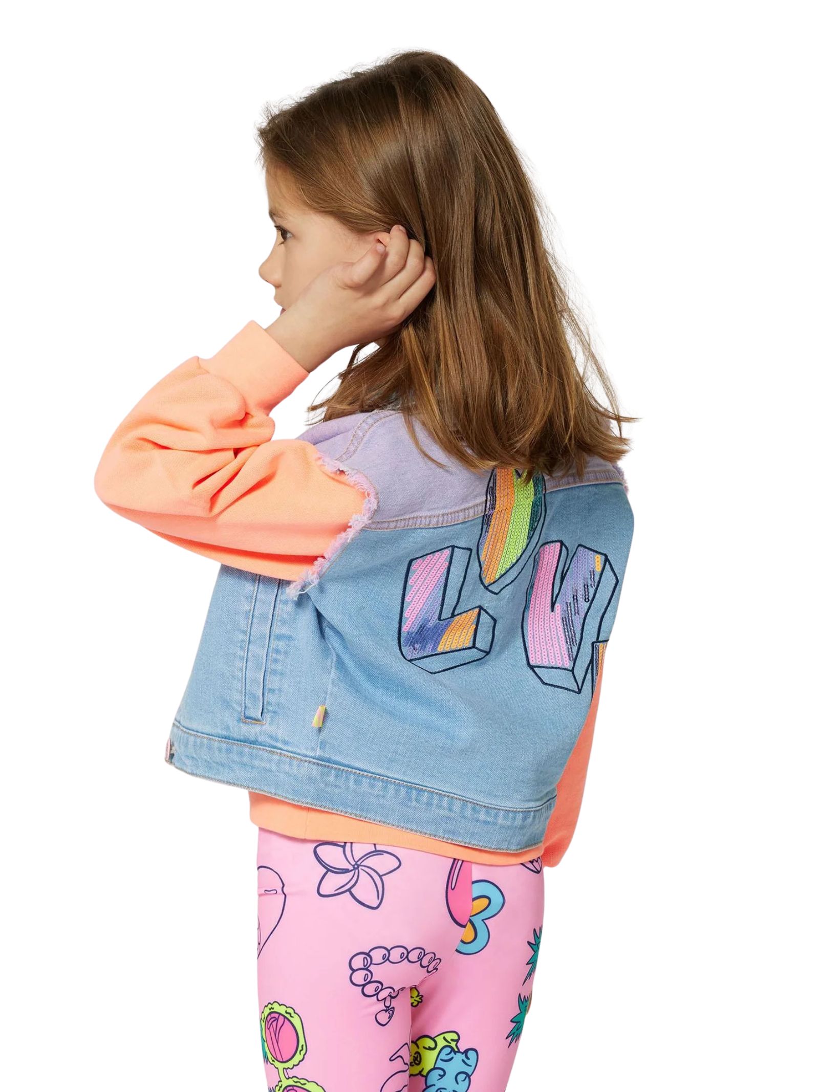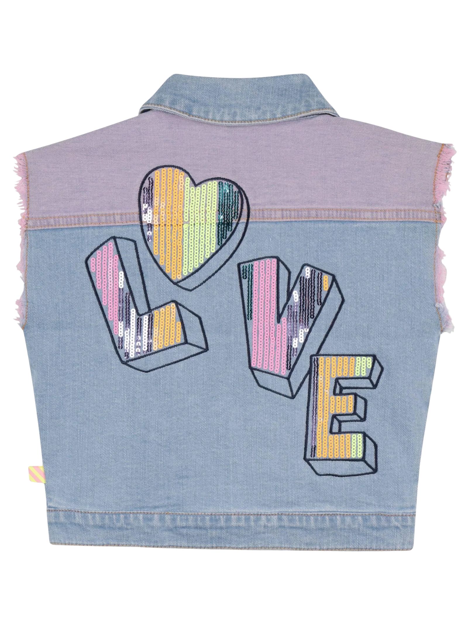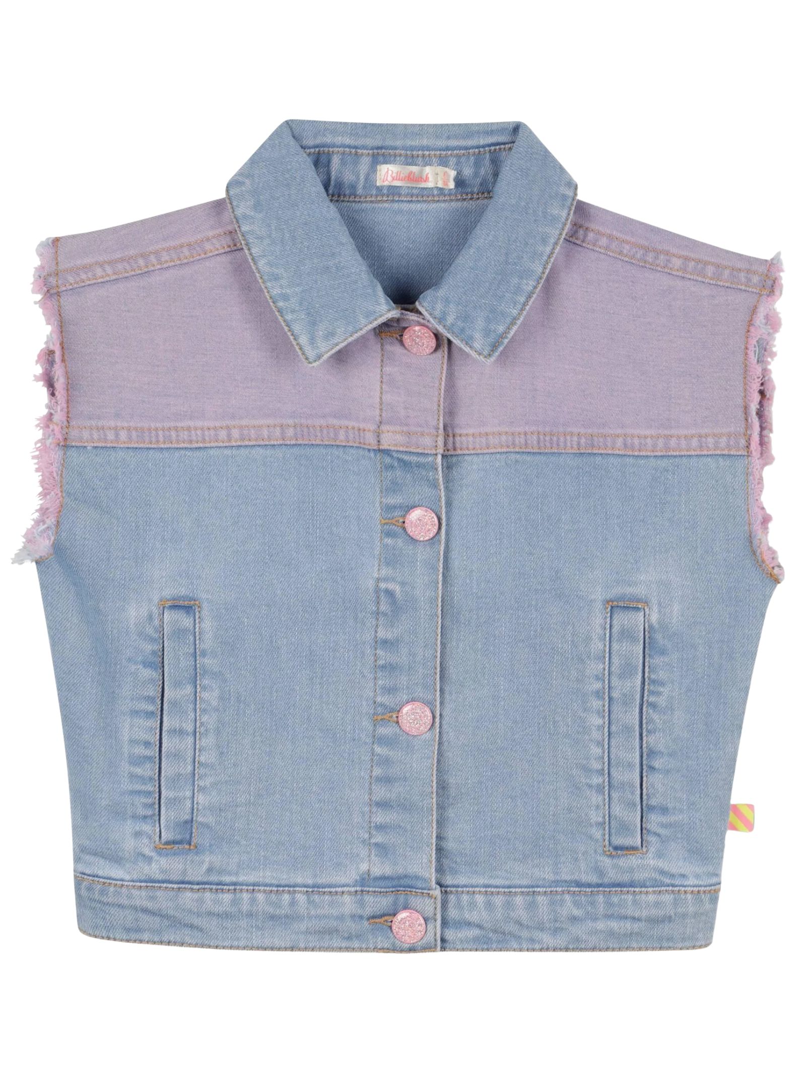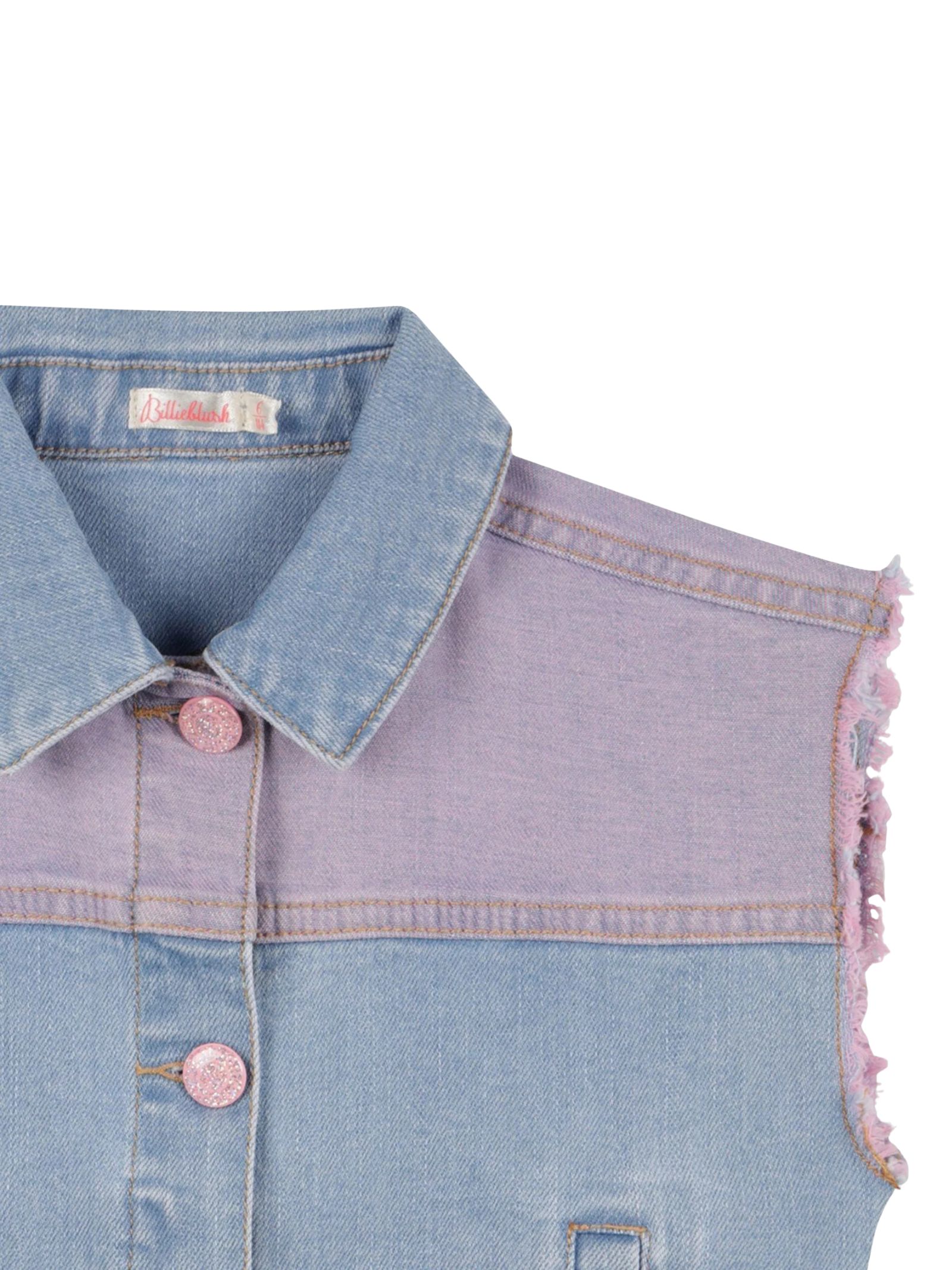 Billieblush Kids smanicato in cotone denim chiaro, colletto a camicia, iIllustrazione fantasia in paillettes sul retro, fascia a contrasto in denim rosa sulla parte superiore, bottoni colorati, giro maniche sfrangiate. Composizione: 99% cotone 1% elastan