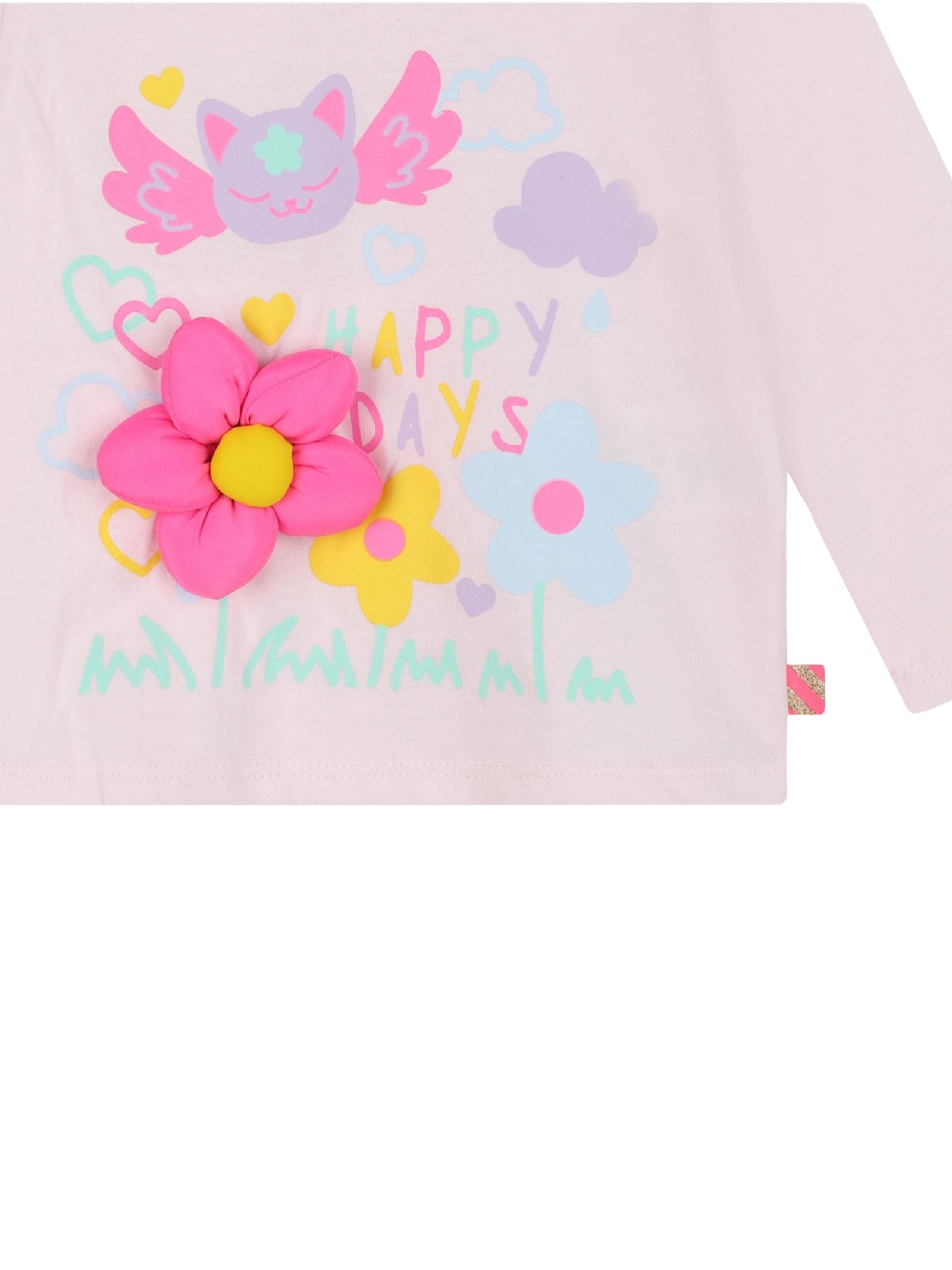 Billieblush Kids t-shirt di colore rosa, modello girocollo, maniche lunghe, decorata con stampa multicolor e fiore in rilievo, apertura sulla spalla, orlo dritto, vestibilità regolare. Composizione: 100% cotone