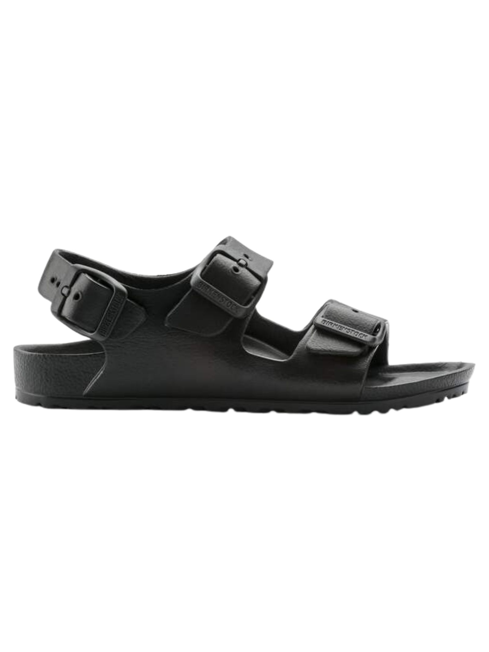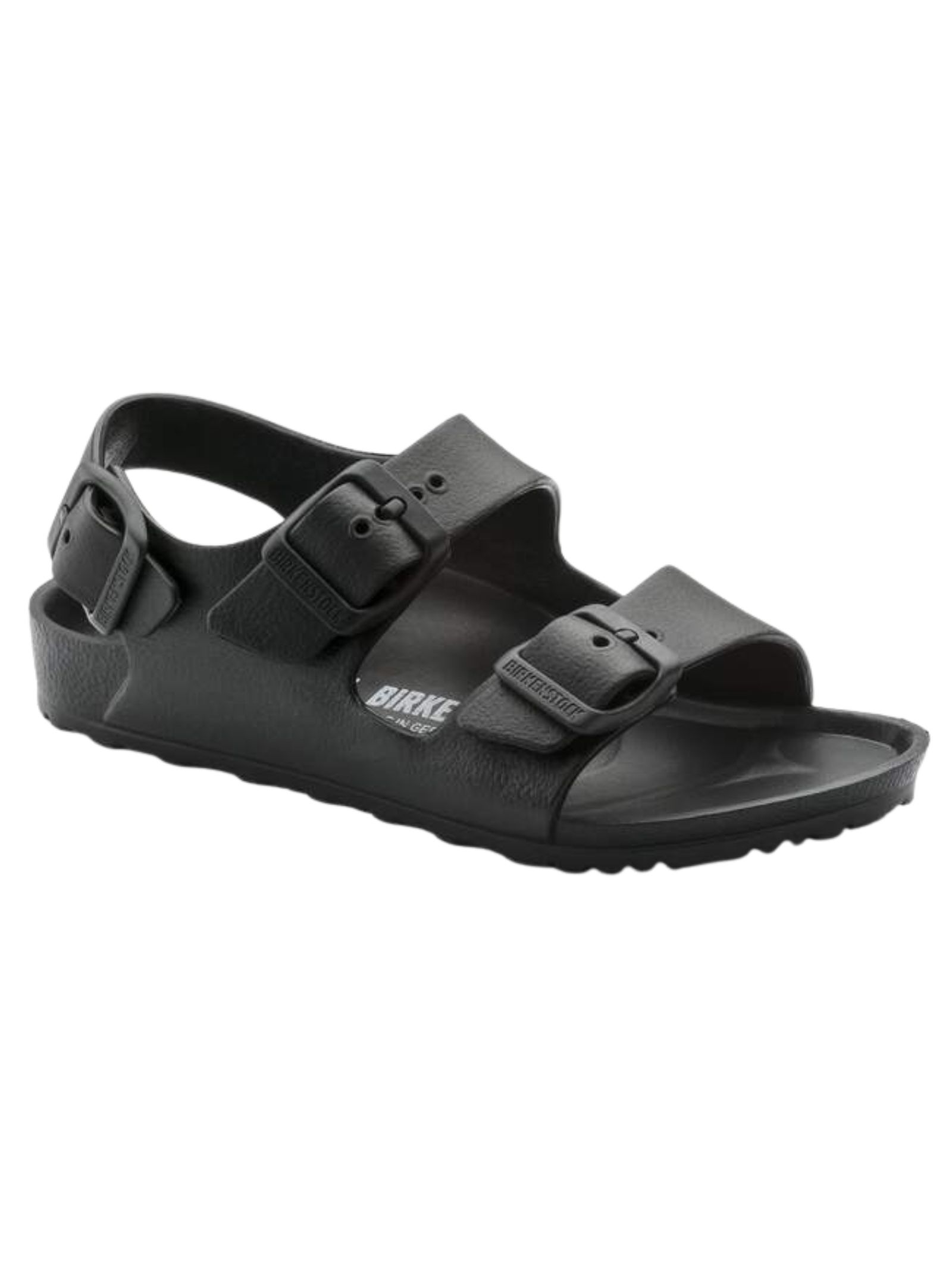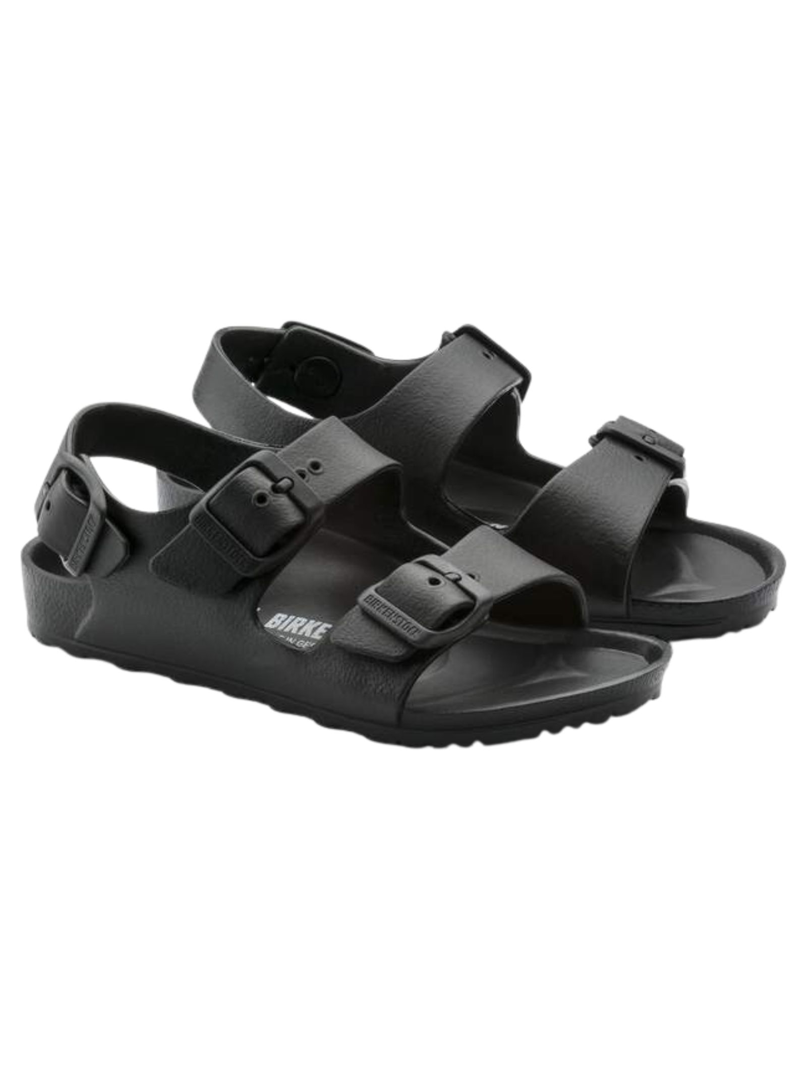 Sandali BIRKENSTOCK kids MILANO EVA di colore nero con chiusura con fibbia, cinturino posteriore, punta tonda, suola in gomma antiscivolo, impermeabile, lavabile, ultraleggero. Realizzato interamente in un solo pezzo in EVA (etilene vinil acetato) 100%. Made in Germany