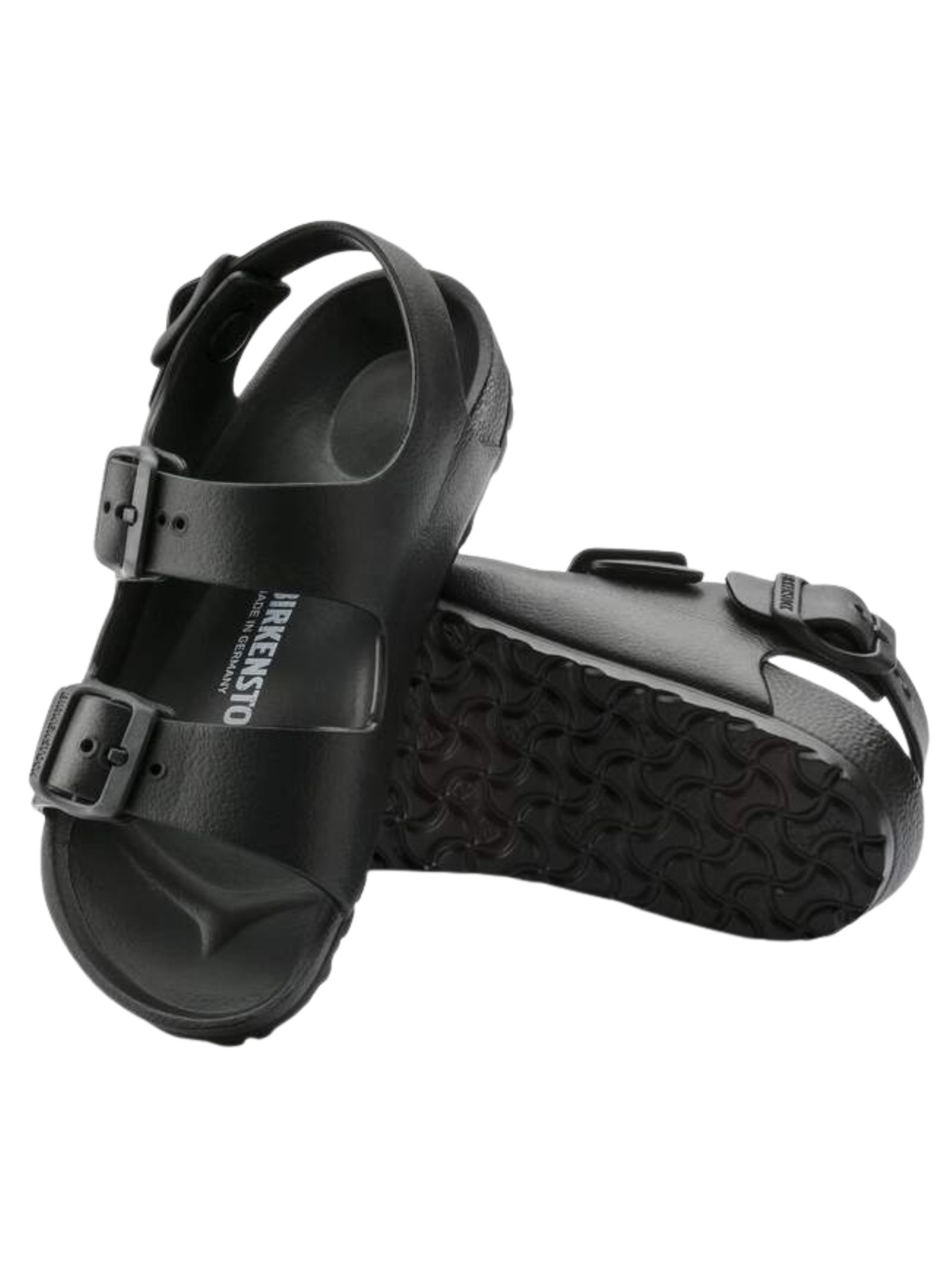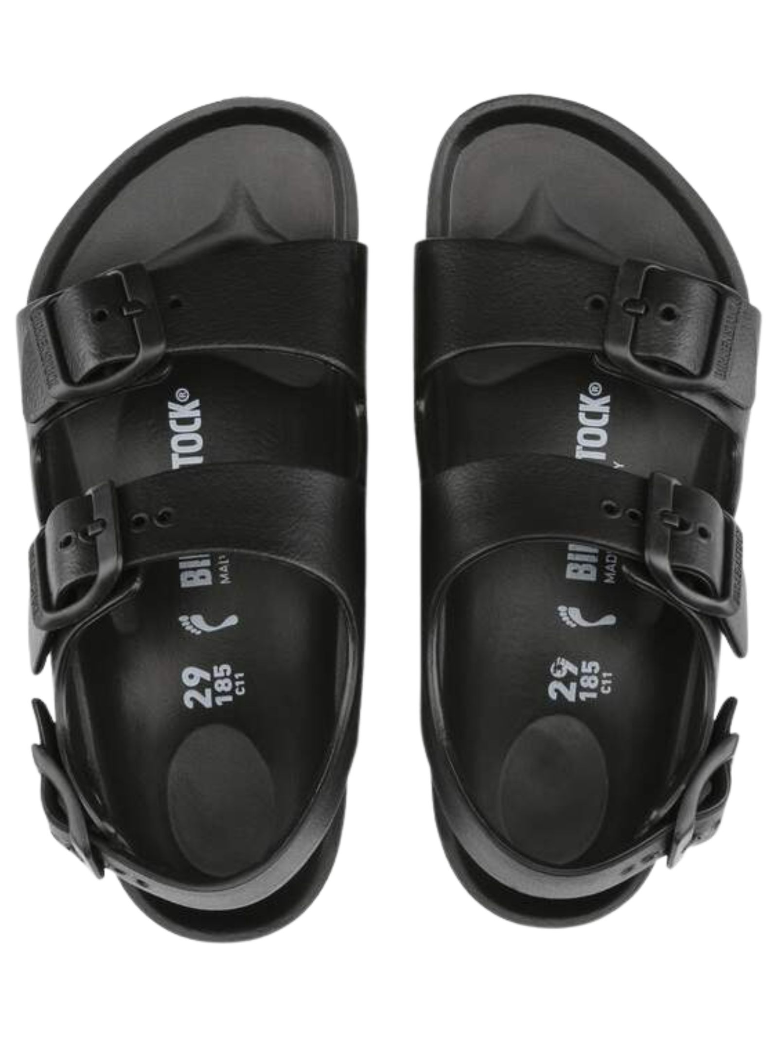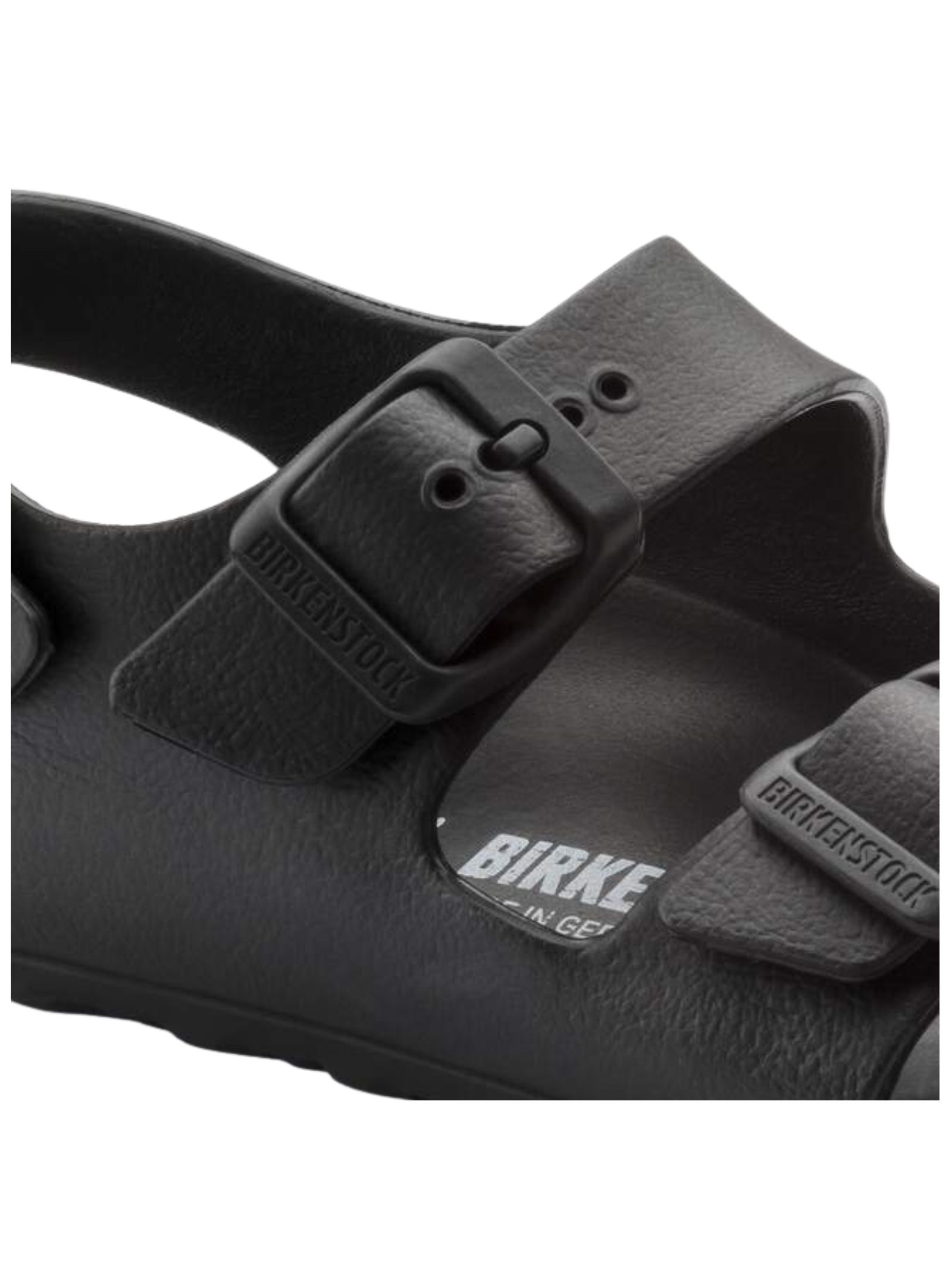 Sandali BIRKENSTOCK kids MILANO EVA di colore nero con chiusura con fibbia, cinturino posteriore, punta tonda, suola in gomma antiscivolo, impermeabile, lavabile, ultraleggero. Realizzato interamente in un solo pezzo in EVA (etilene vinil acetato) 100%. Made in Germany