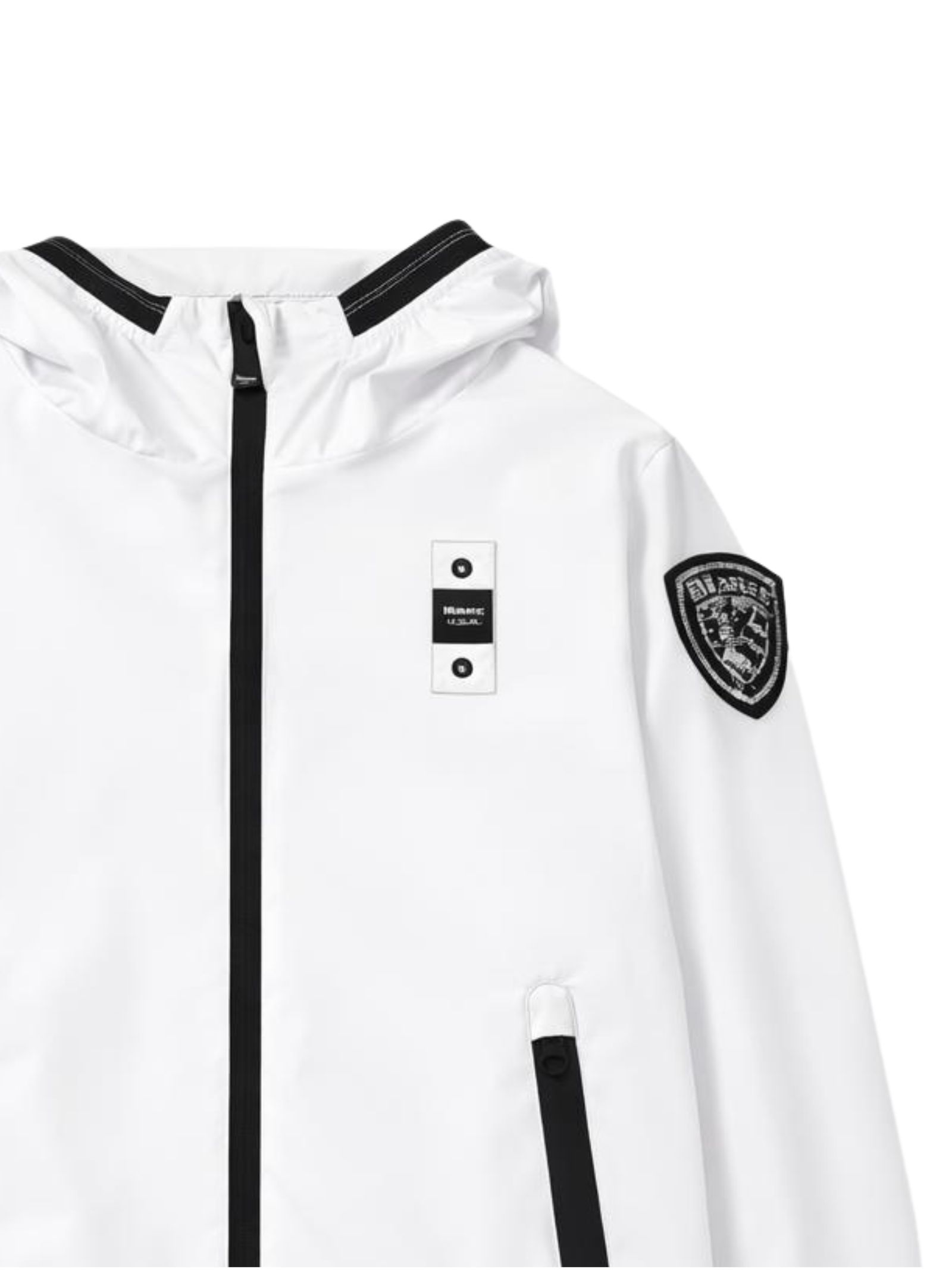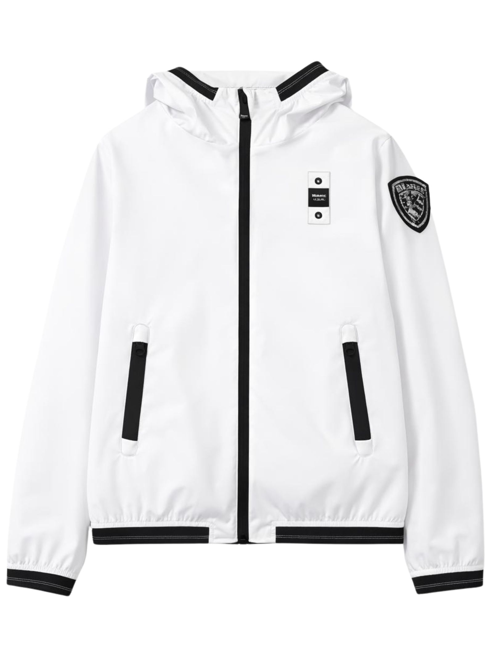 Blauer Kids giubbino di colore bianco, in tessuto nylon impermeabile liscio, due tasche con zip, applicazione logo sul petto, bordi con profilo in lycra elastica a contrasto nero, applicazione logo glitter sul braccio, vestibilità regolare. Composizione: 100% Nylon