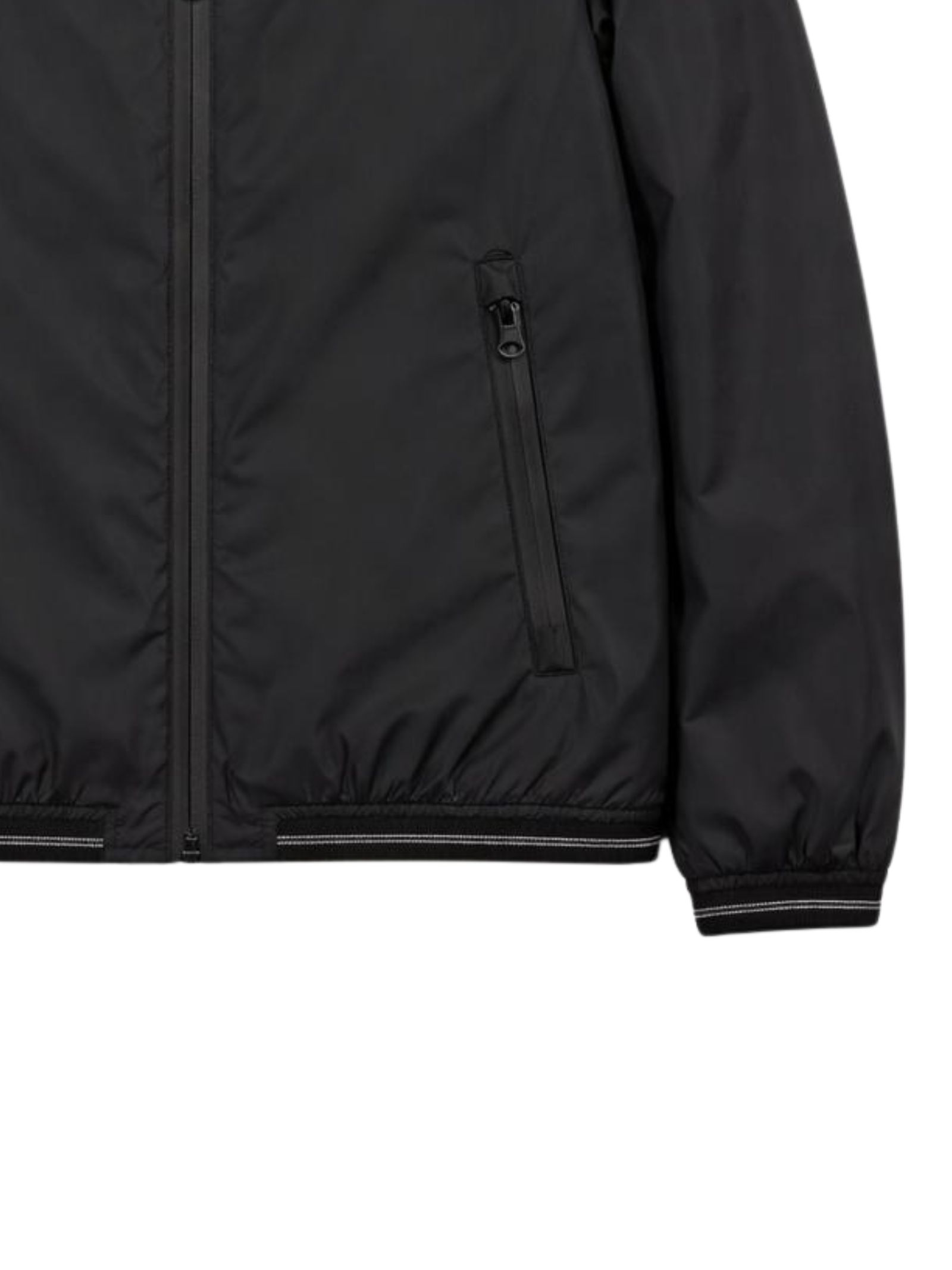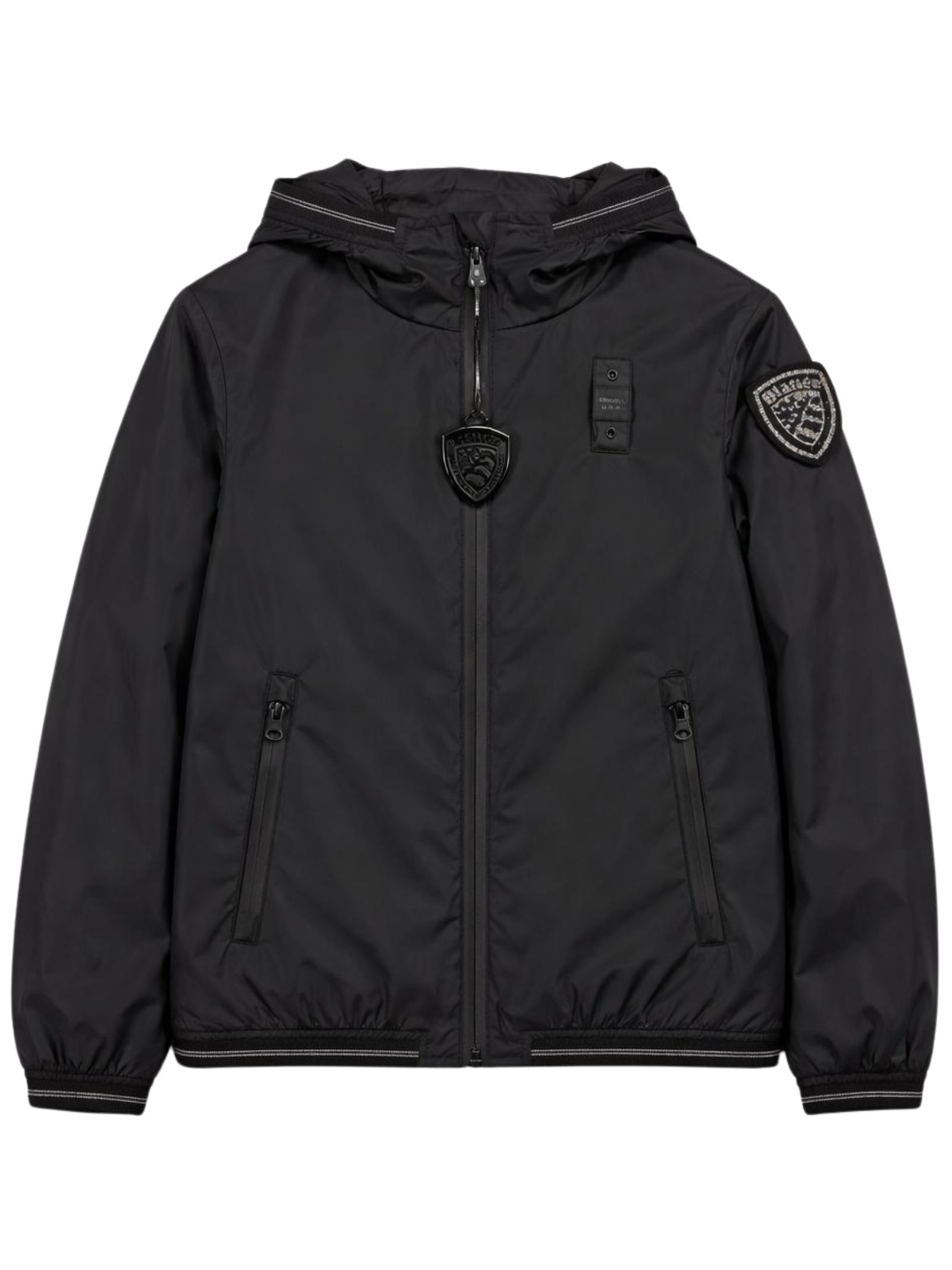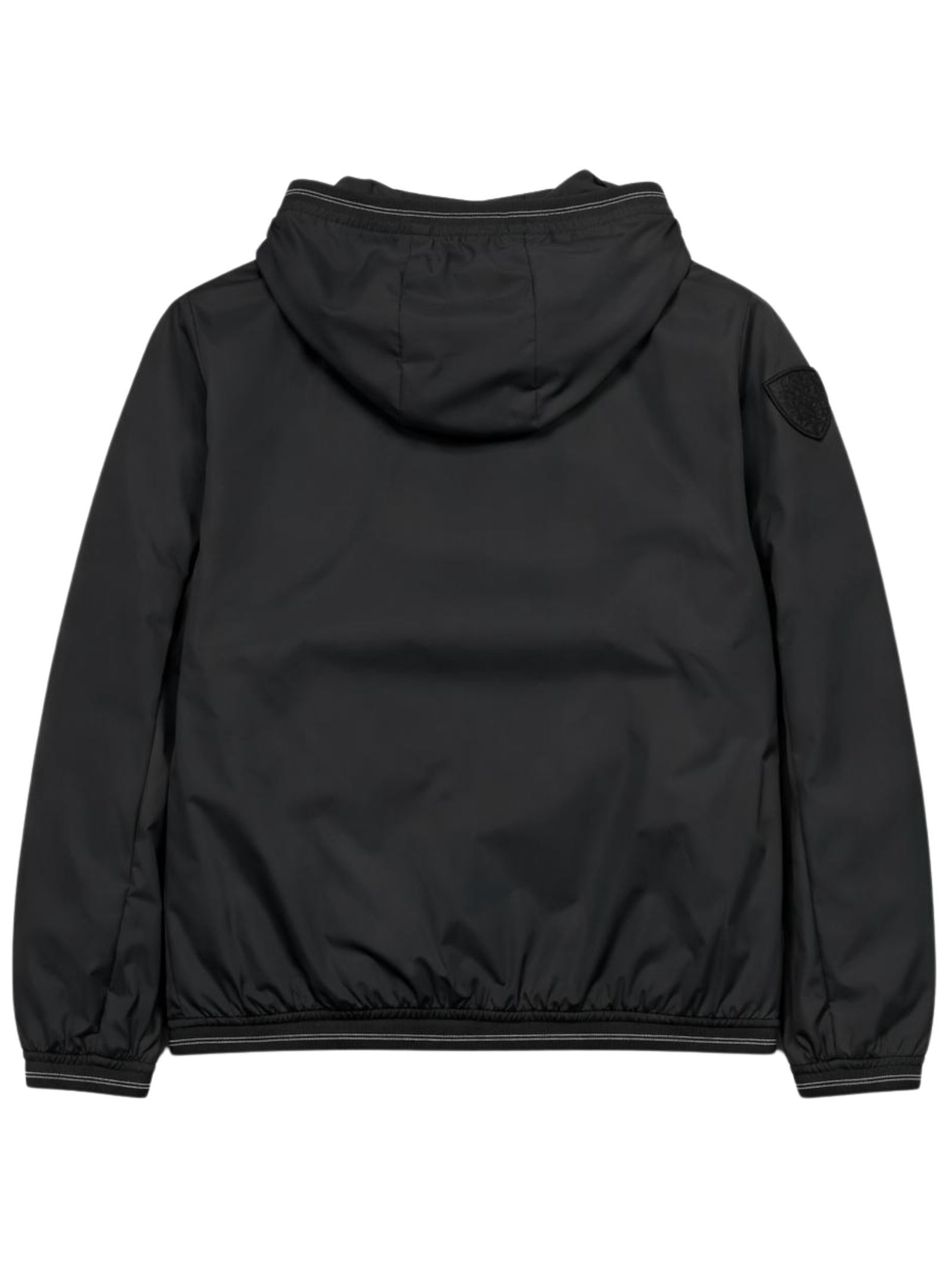 Blauer Kids giubbino di colore nero, in tessuto liscio impermeabile, modello con cappuccio, applicazione logo glitter sul braccio, due tasche con zip, applicazione logo sul petto, orli con fascia elastica. Composizione: 100% poliammide