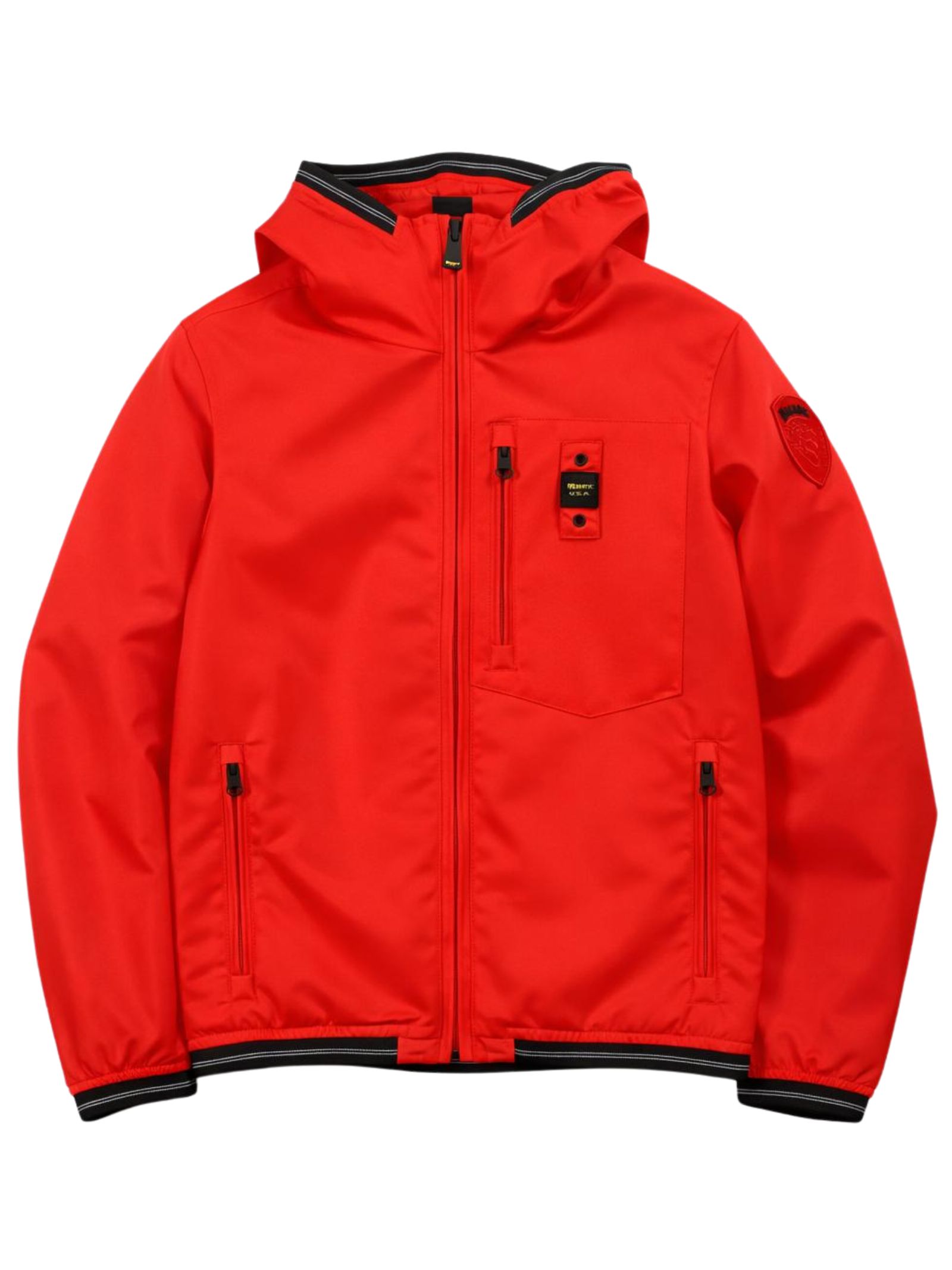 Blauer Kids giubbino di colore rosso, in tessuto impermeabile liscio, cappuccio, 3 tasche con zip, applicazione logo sul petto, bordi con profilo in lycra elastica a contrasto nero, applicazione logo sul braccio, vestibilità regolare. Composizione: 100% poliammide