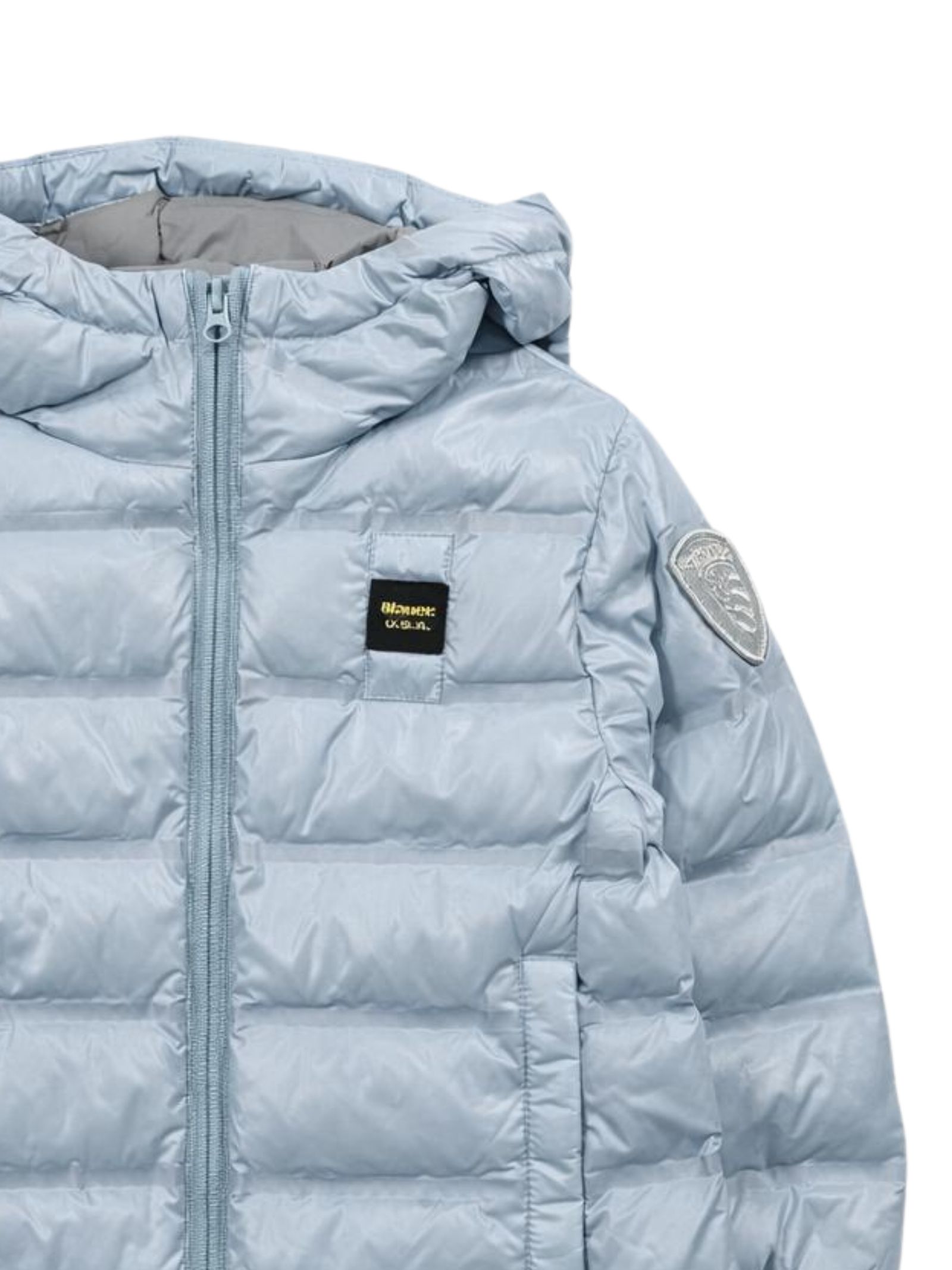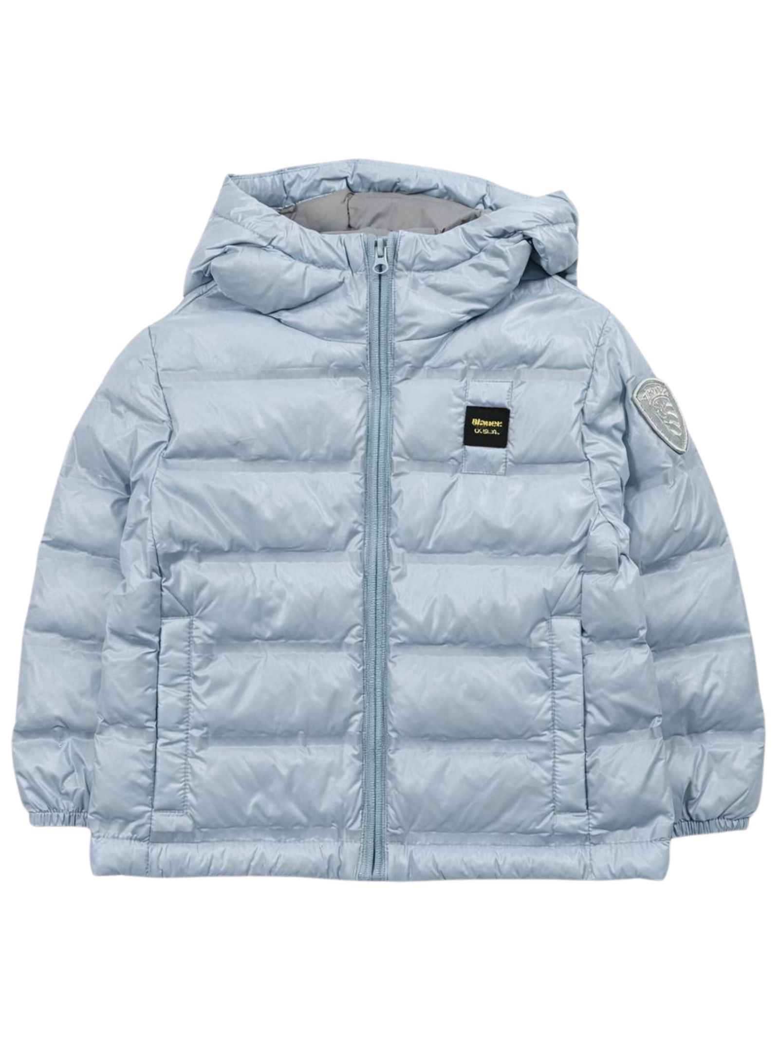 Blauer Kids giubbino di colore azzurro, design imbottito, chiusura frontale con zip, cappuccio, applicazione patch logo sul petto, applicazione logo sul braccio, due tasche laterali con zip, vestibilità regolare. Composizione: 100% poliammide. Imbottitura: 100% poliestere