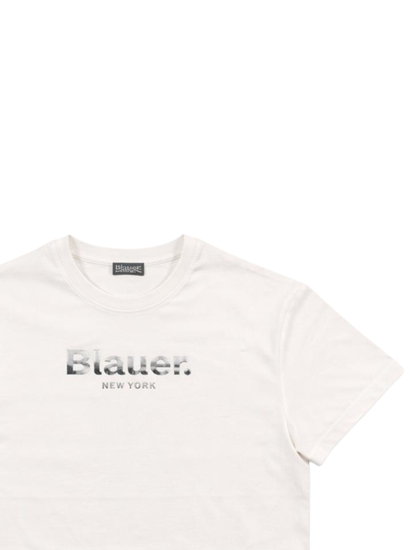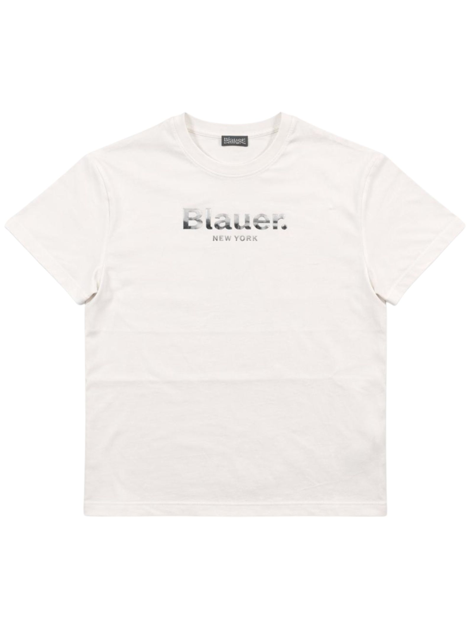 Blauer Kids t-shirt di colore bianco, modello girocollo, applicazione centrale logo a contrasto effetto specchiato, orlo dritto, vestibilità regolare. Composizione: 95% cotone 5% elastan