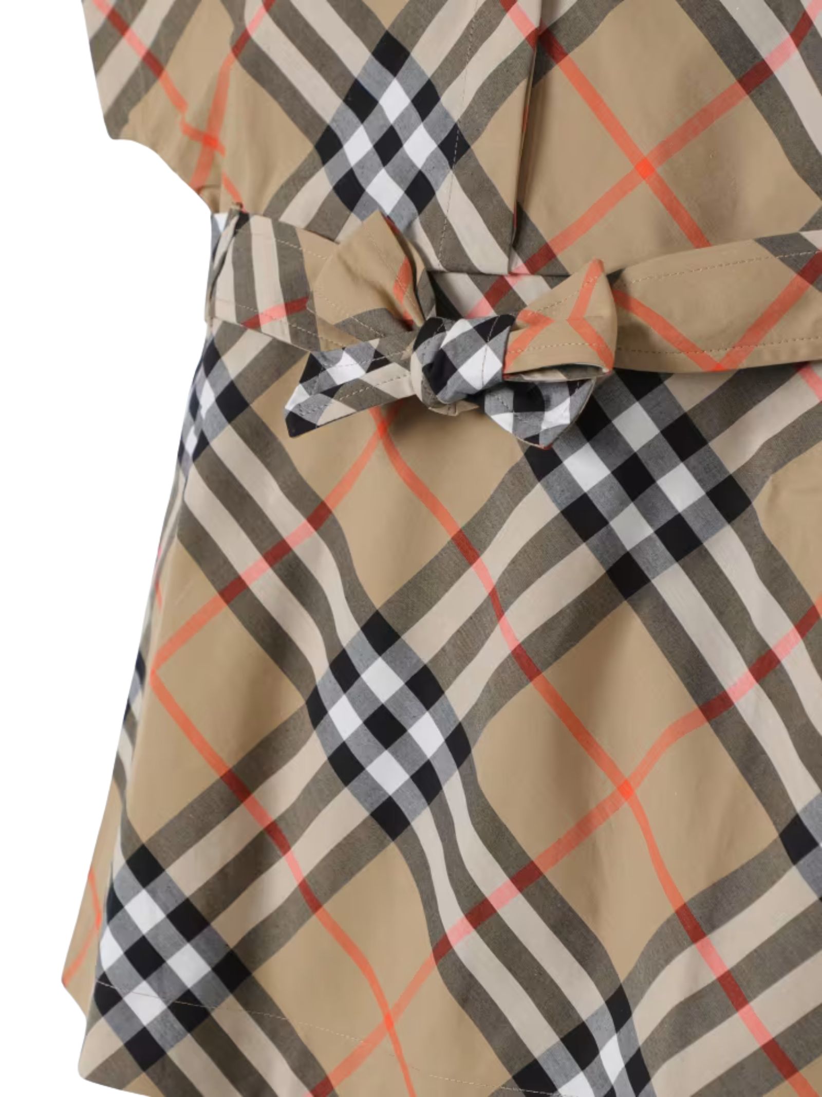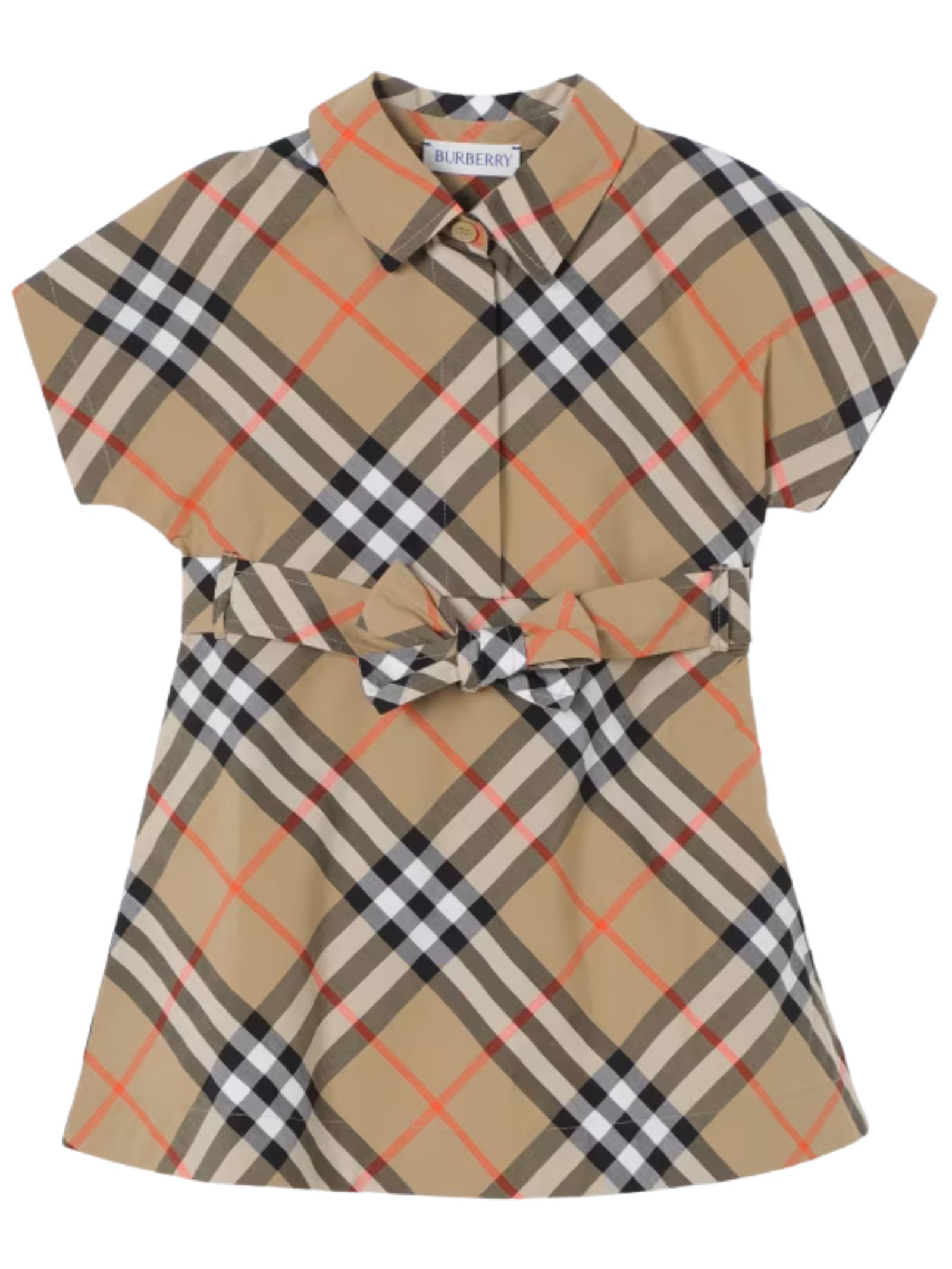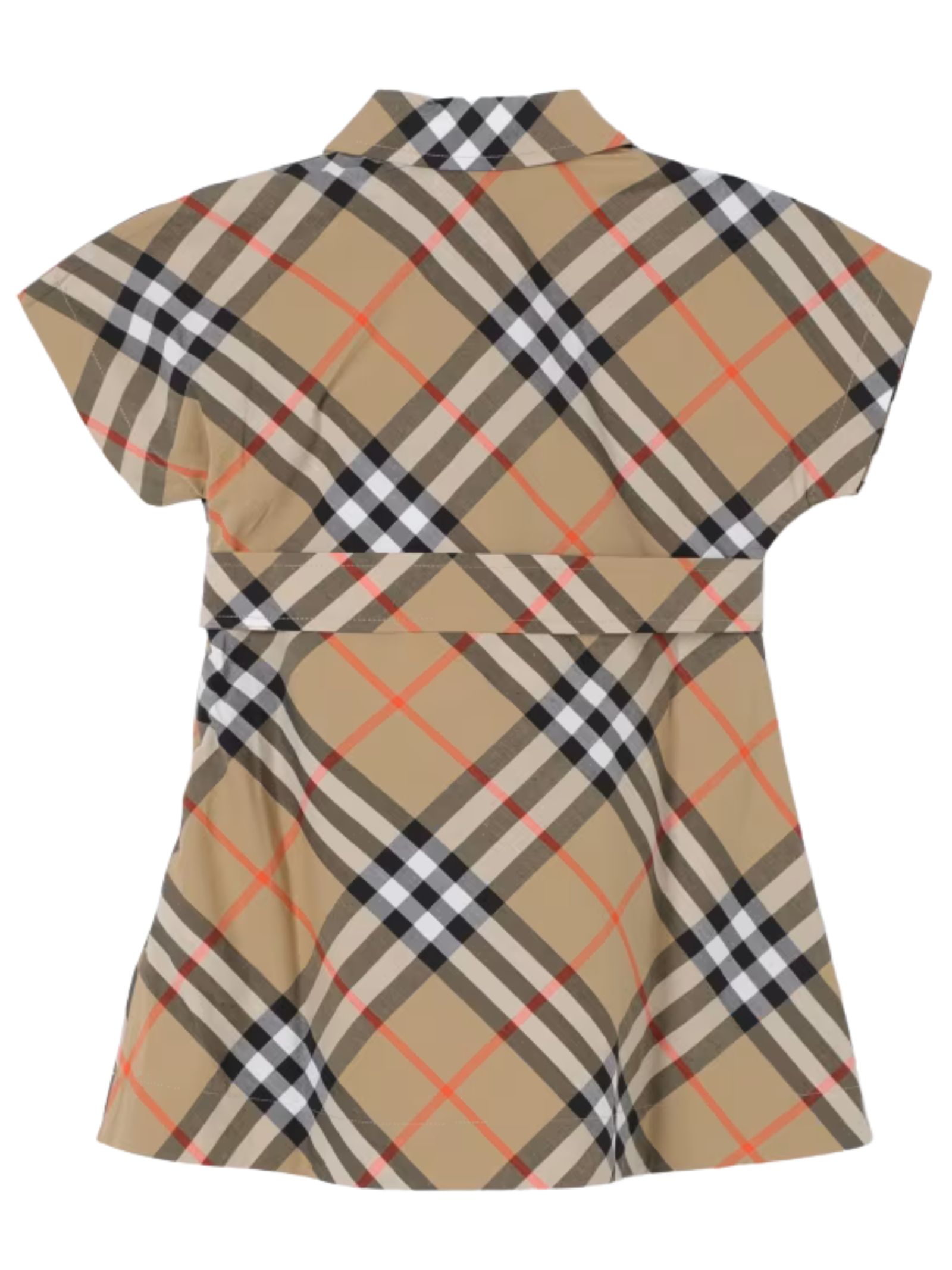 Burberry Kids abito realizzato in popline di cotone in motivo Vintage Check, modello girocollo, maniche corte, cintura abbinata in vita, abbottonatura a metà, design svasato. Composizione: 100% cotone
