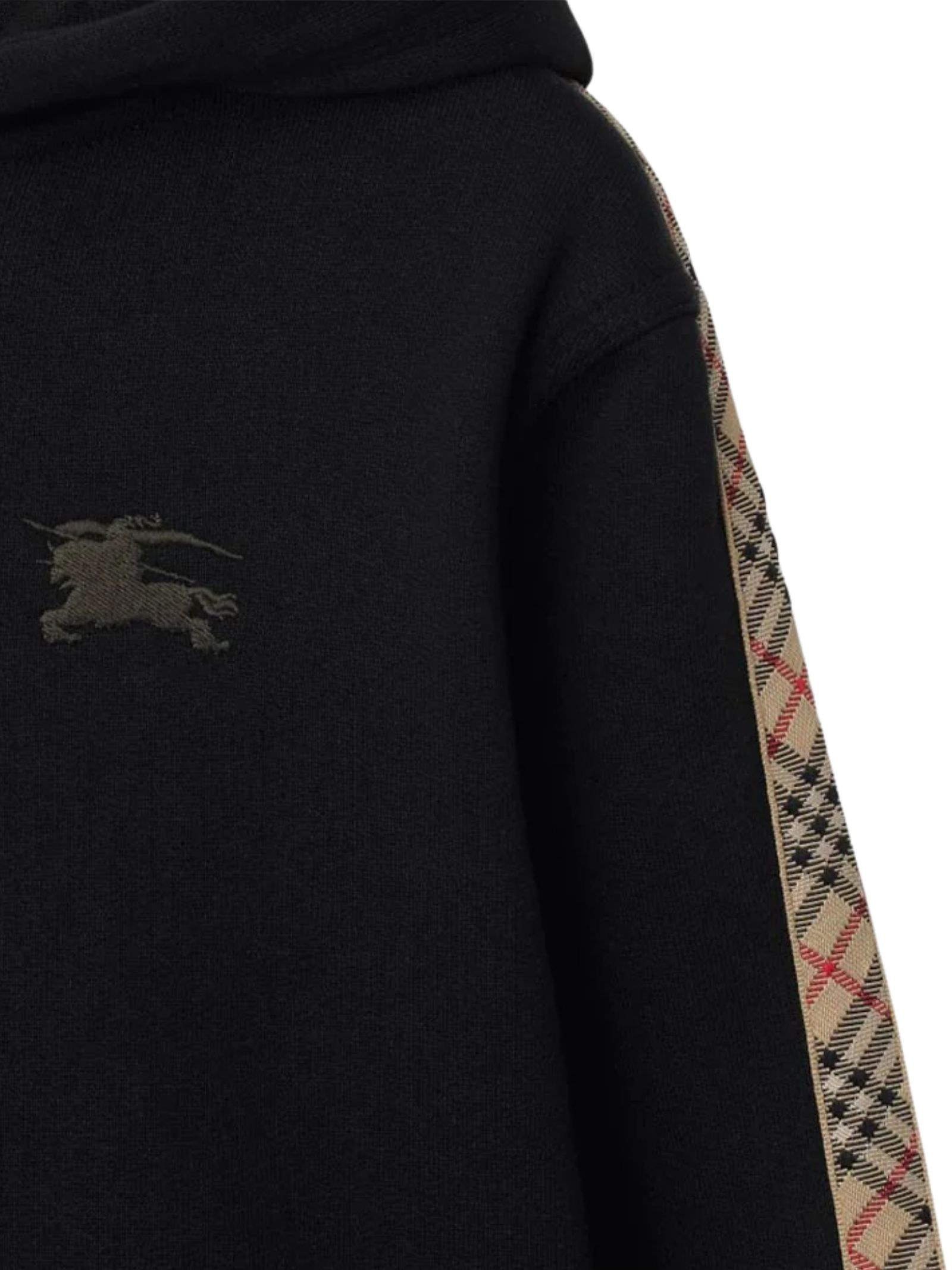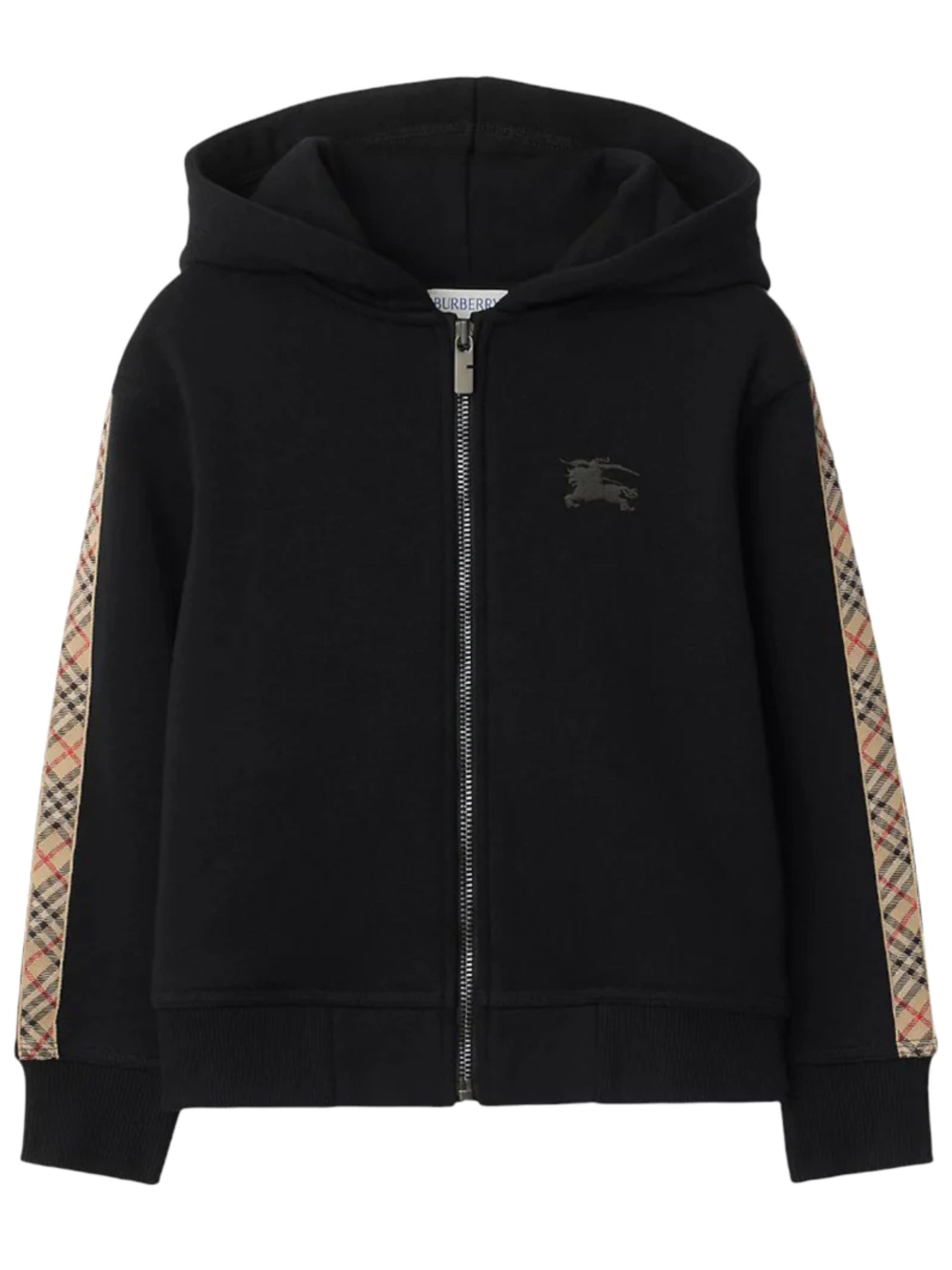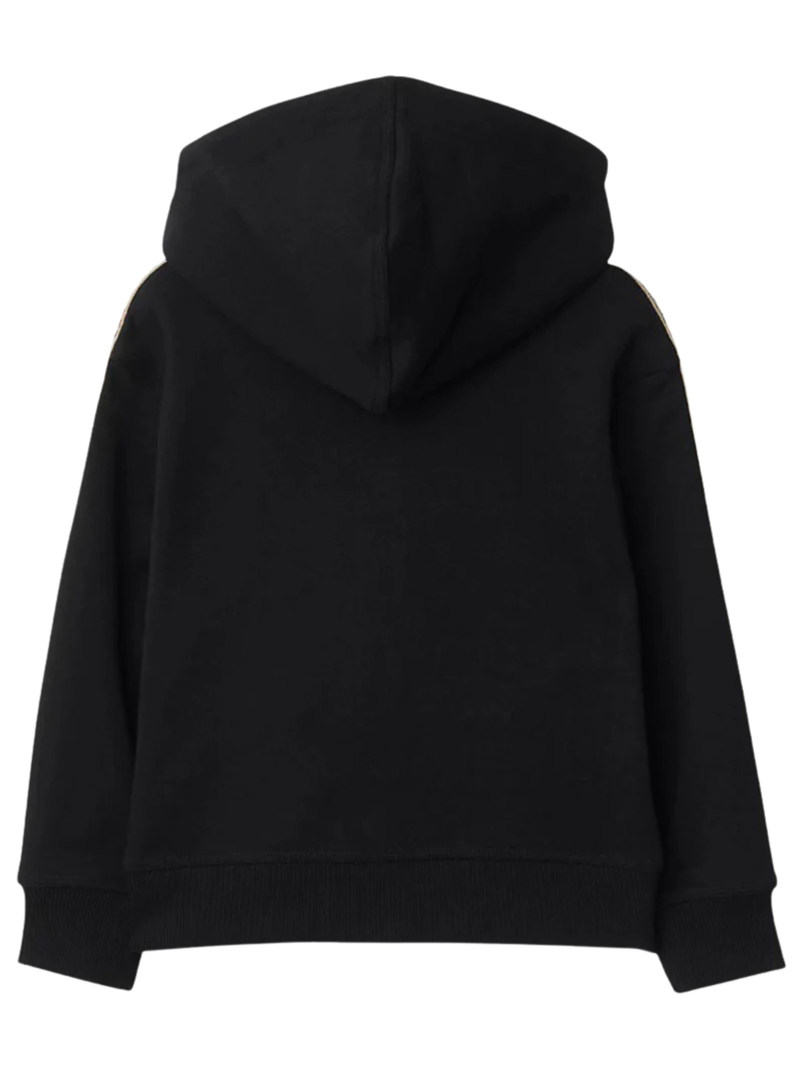 Burberry Kids Felpa di colore nero realizzata in cotone sgarzato, caratterizzata da cappuccio, chiusura frontale con zip, maniche lunghe con nastro Burberry Check, polsini a coste, due tasche laterali a filetto e orlo a coste, decorata con Equestrian Knight ricamato sul petto a contrasto. Composizione: 100% Cotone