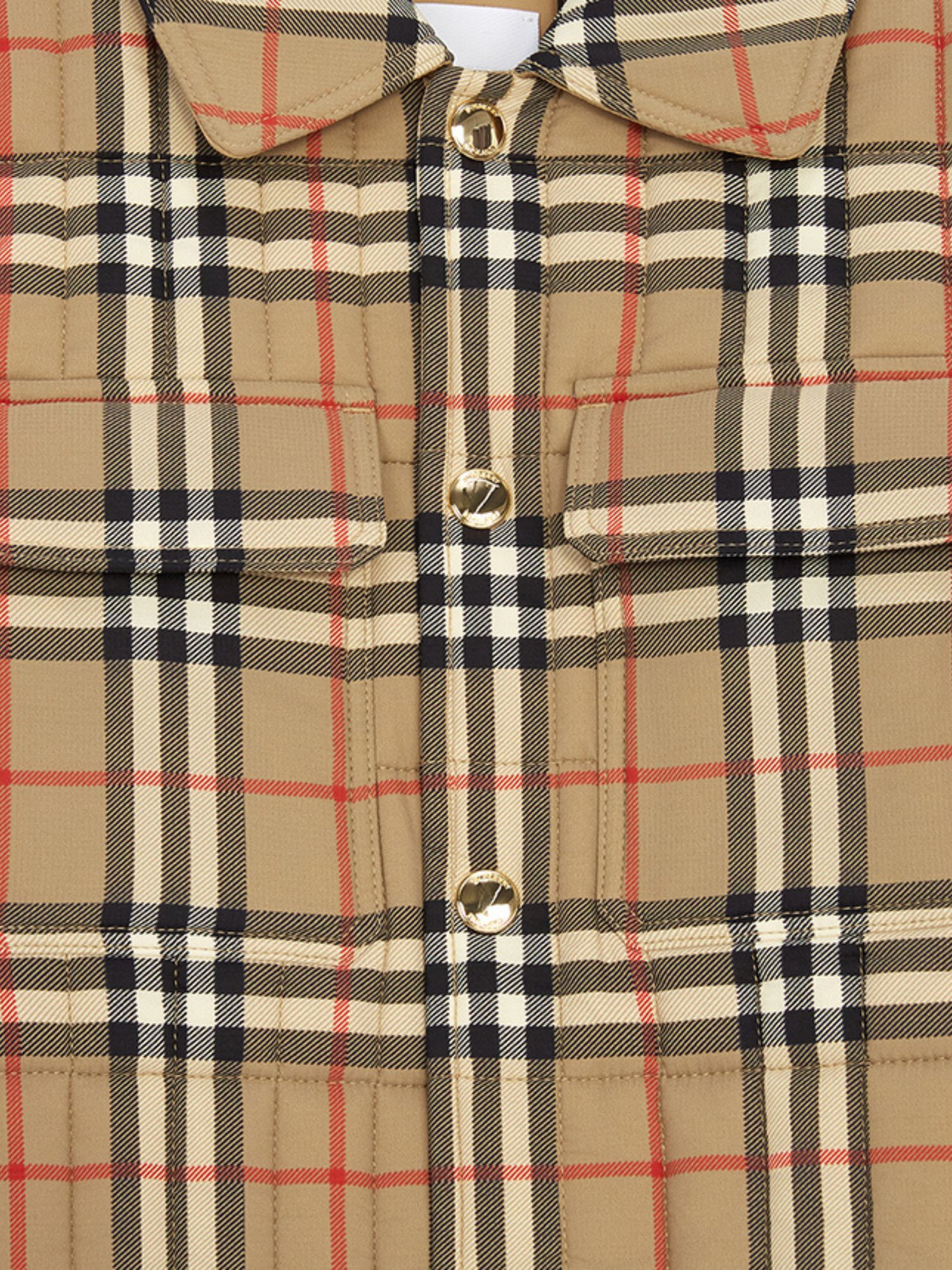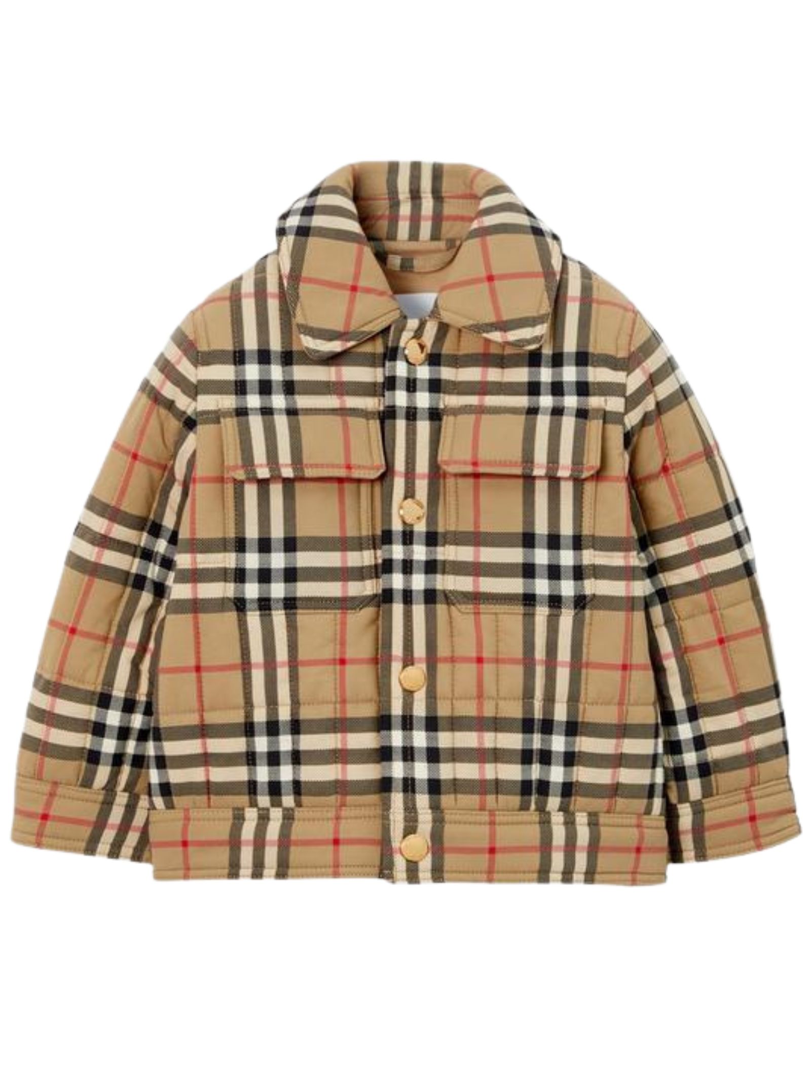 Burberry Kids giubbino di colore beige archivio in fantasia Vintage Check, design trapuntato, colletto, chiusura frontale con bottoni automatici, maniche lunghe, polsini con bottoni, due tasche laterali, due tasche applicate con patta e bottone, orlo dritto. Composizione: 100% poliestere