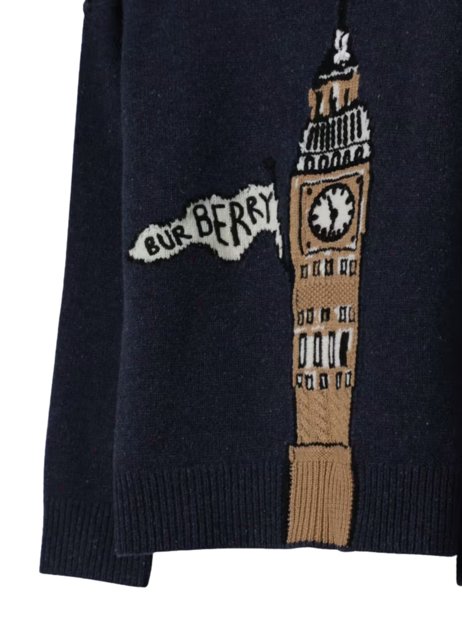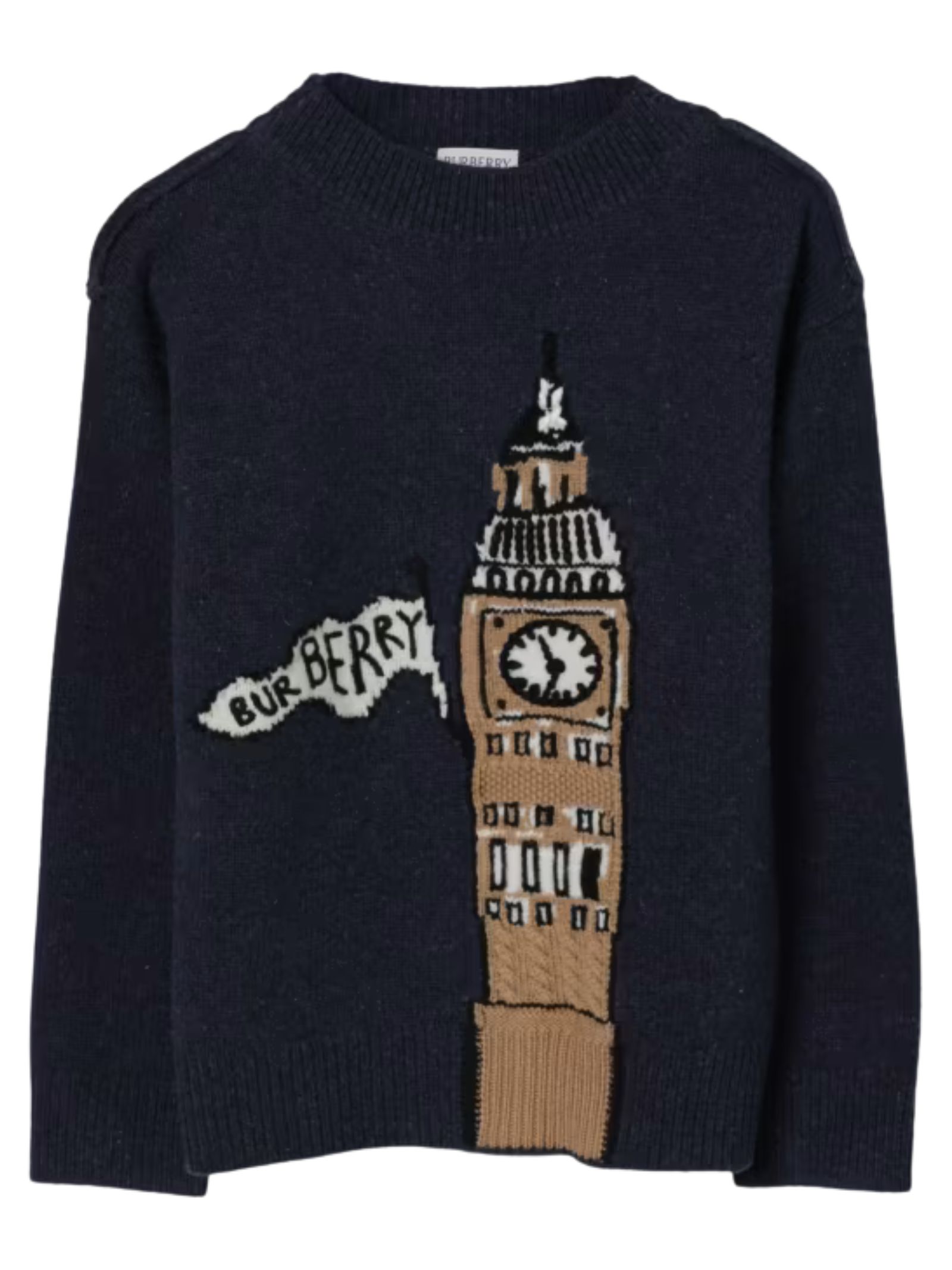 Burberry Kids maglione di colore blu lavorato a maglia, modello girocollo, illustrazione centrale a contrasto con logo, orli a costine, vestibilità regolare. Composizione: Lana 100%