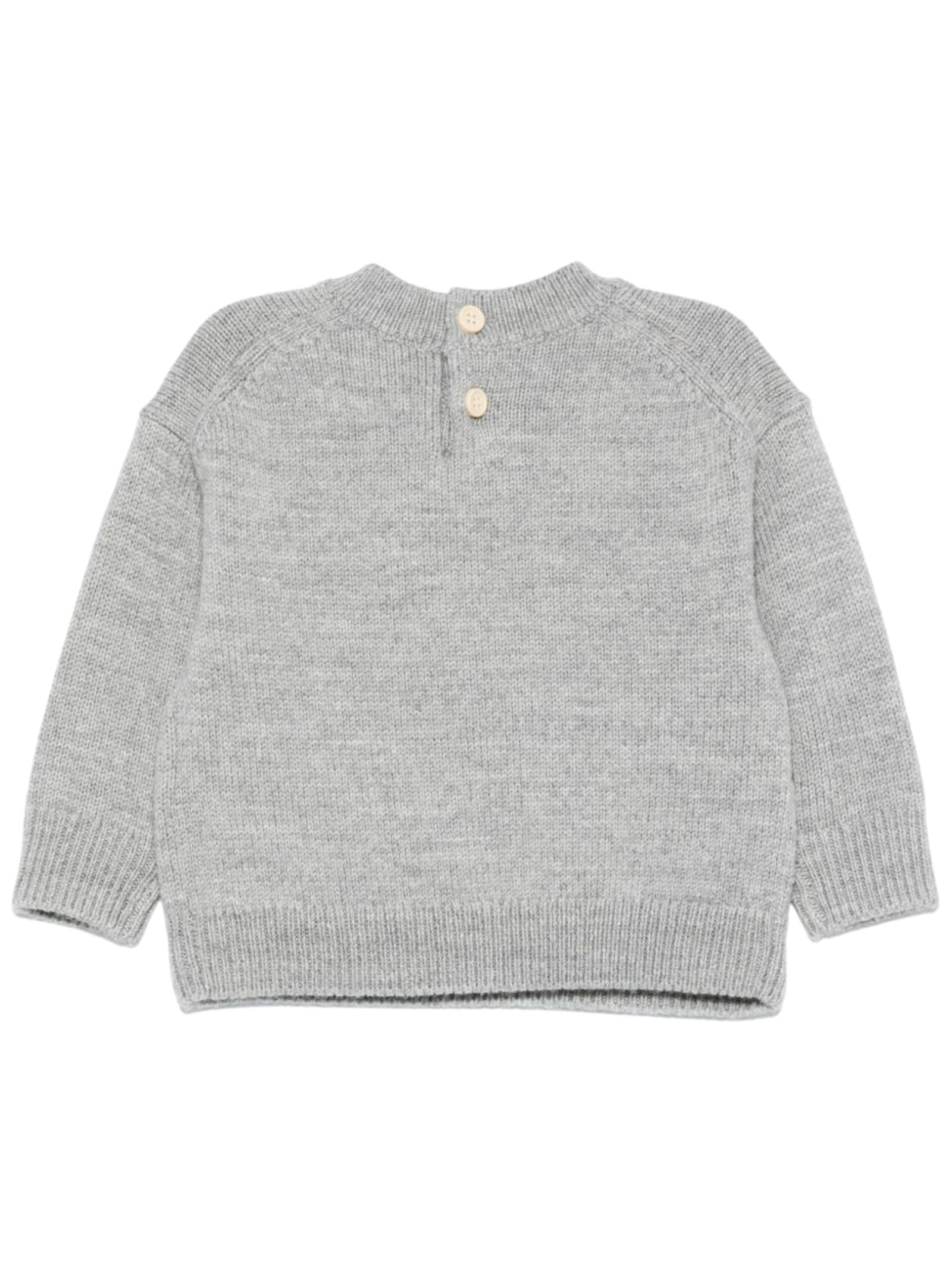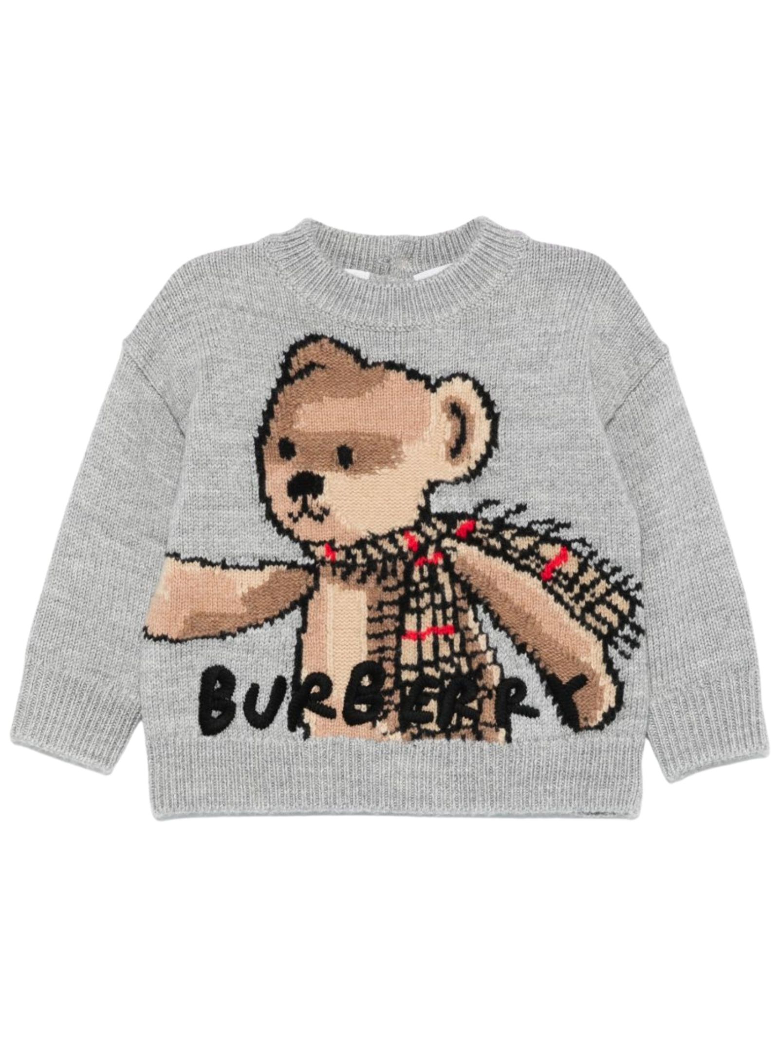 Burberry Kids maglione di colore grigio lavorato a maglia, modello girocollo, illustrazione centrale a contrasto con logo, bottoni sul retro, orli a costine, vestibilità regolare. Composizione: Lana 100%