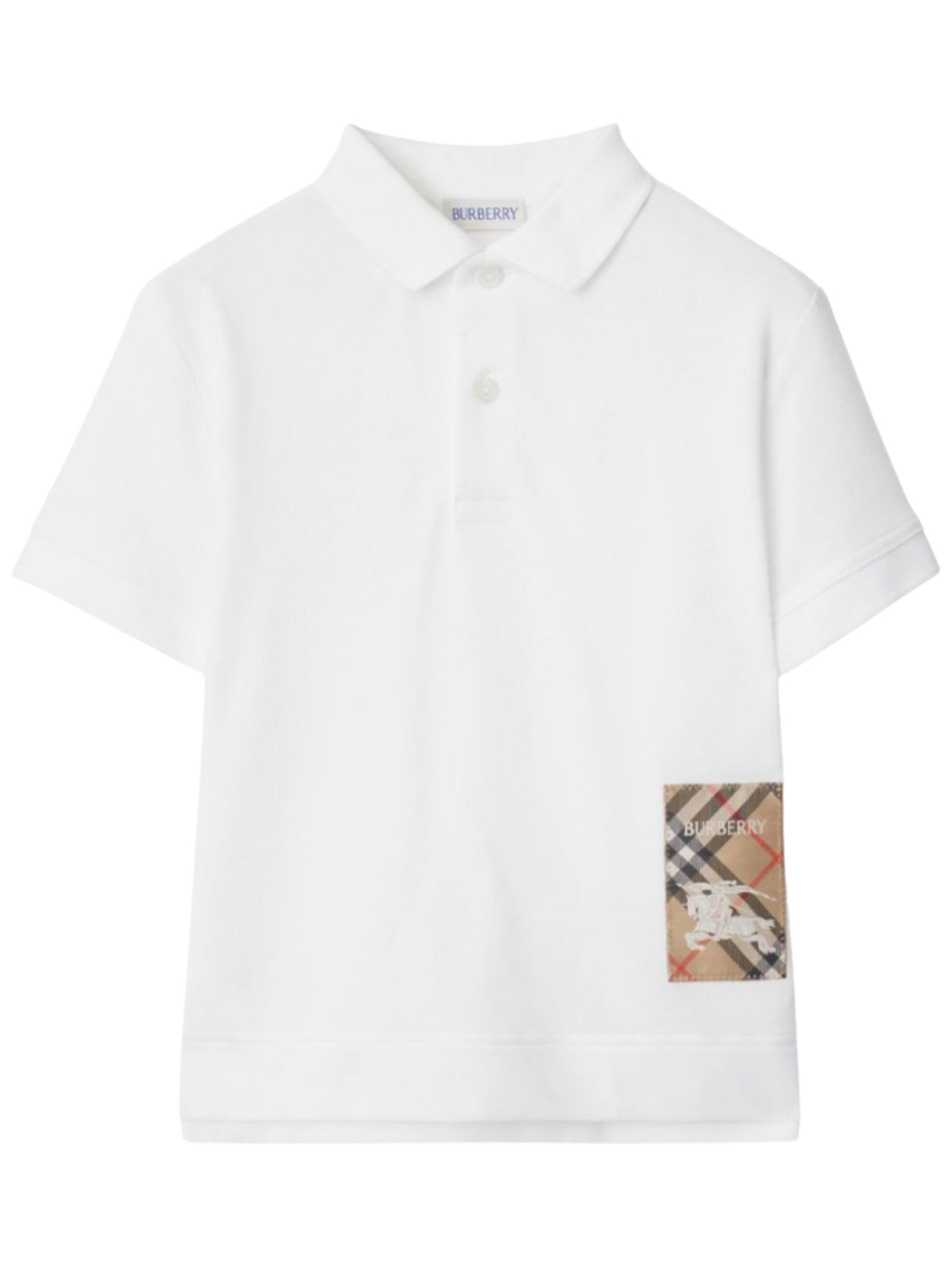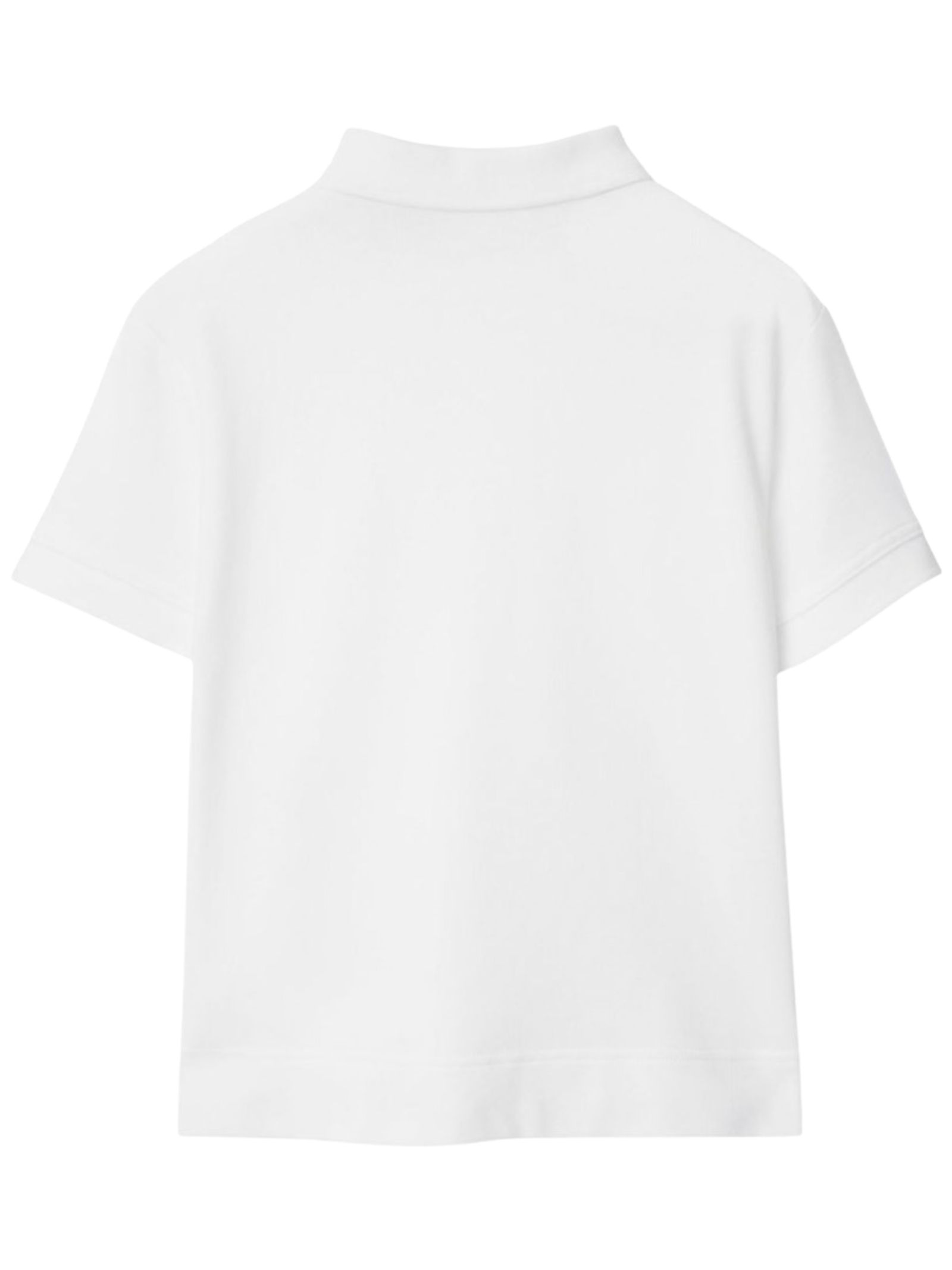 Burberry Kids polo di colore bianco, realizzata in cotone piquet, maniche corte, patch caratteristico motivo Equestrian Knight applicato su un lato, spacchetti laterali, orlo dritto con dettaglio retro più lungo. Composizione: 100% cotone