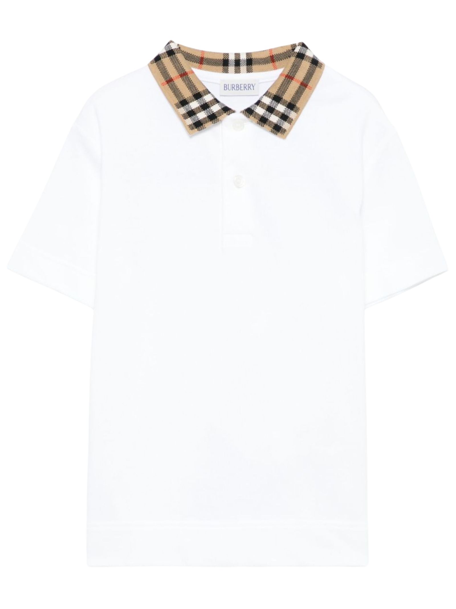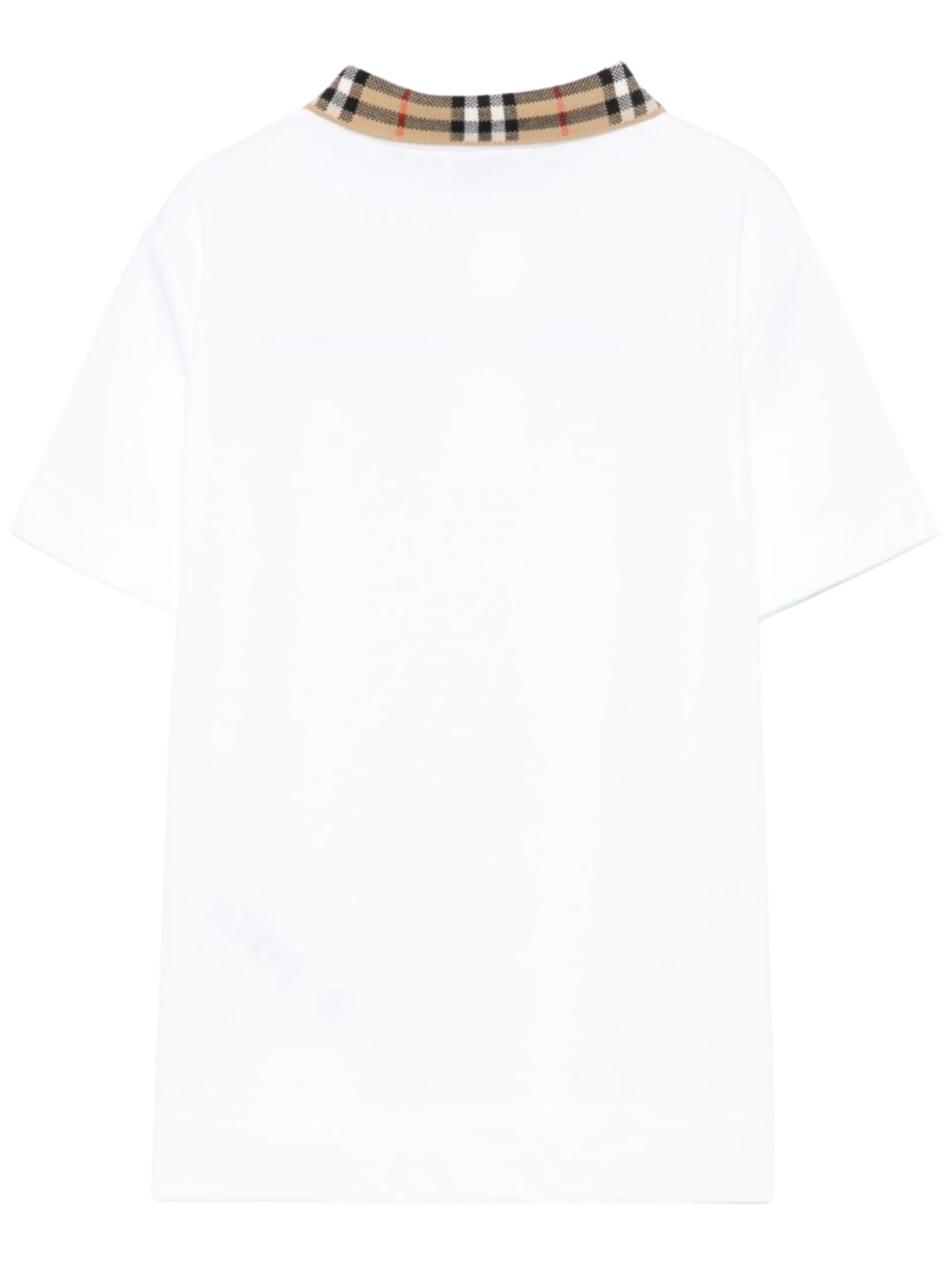 Burberry Kids polo di colore bianco, colletto a contrasto in motivo vintage check, realizzata in cotone piquet, maniche corte, spacchetti laterali, orlo dritto con dettaglio retro più lungo. Composizione: 100% cotone