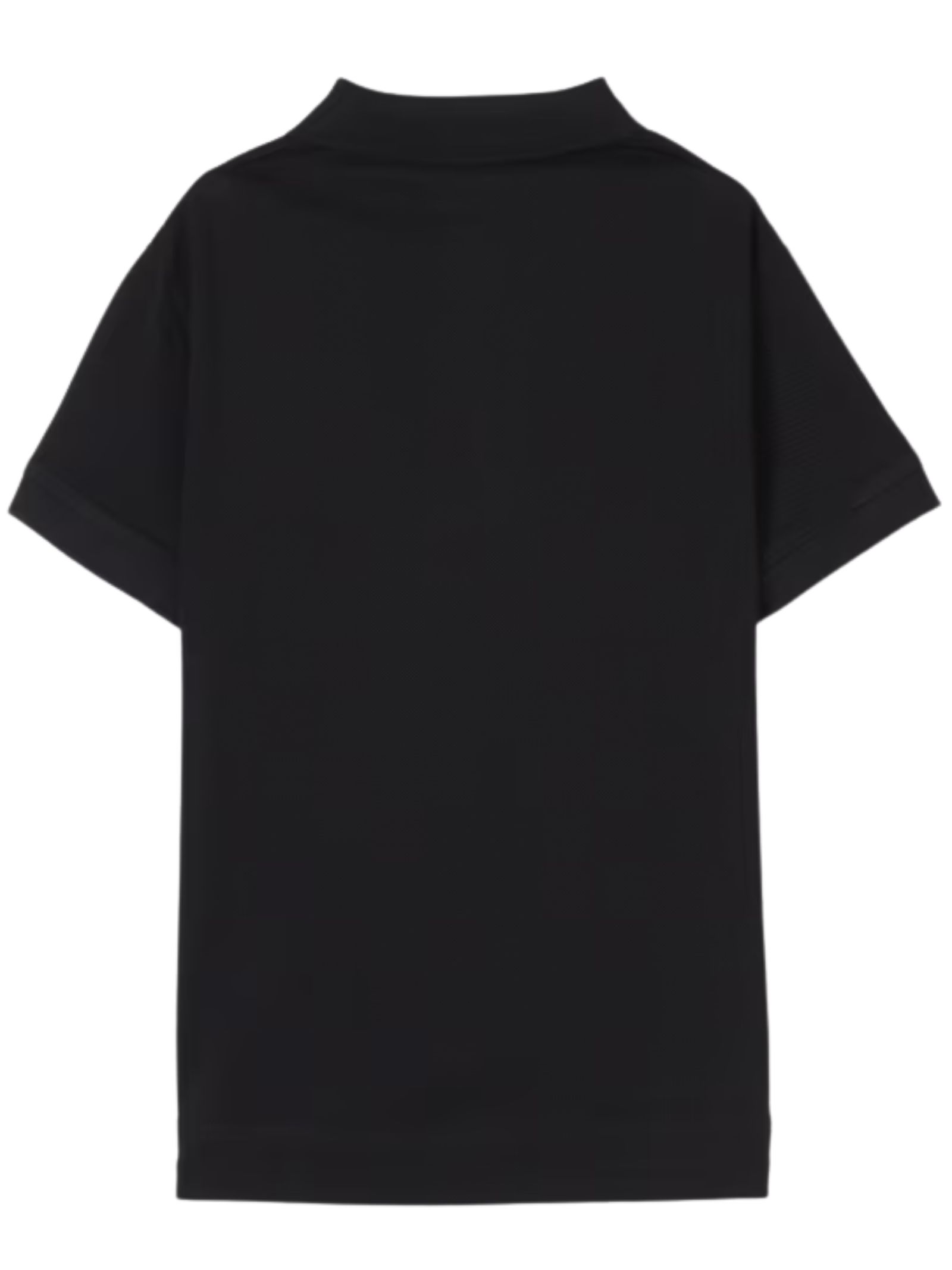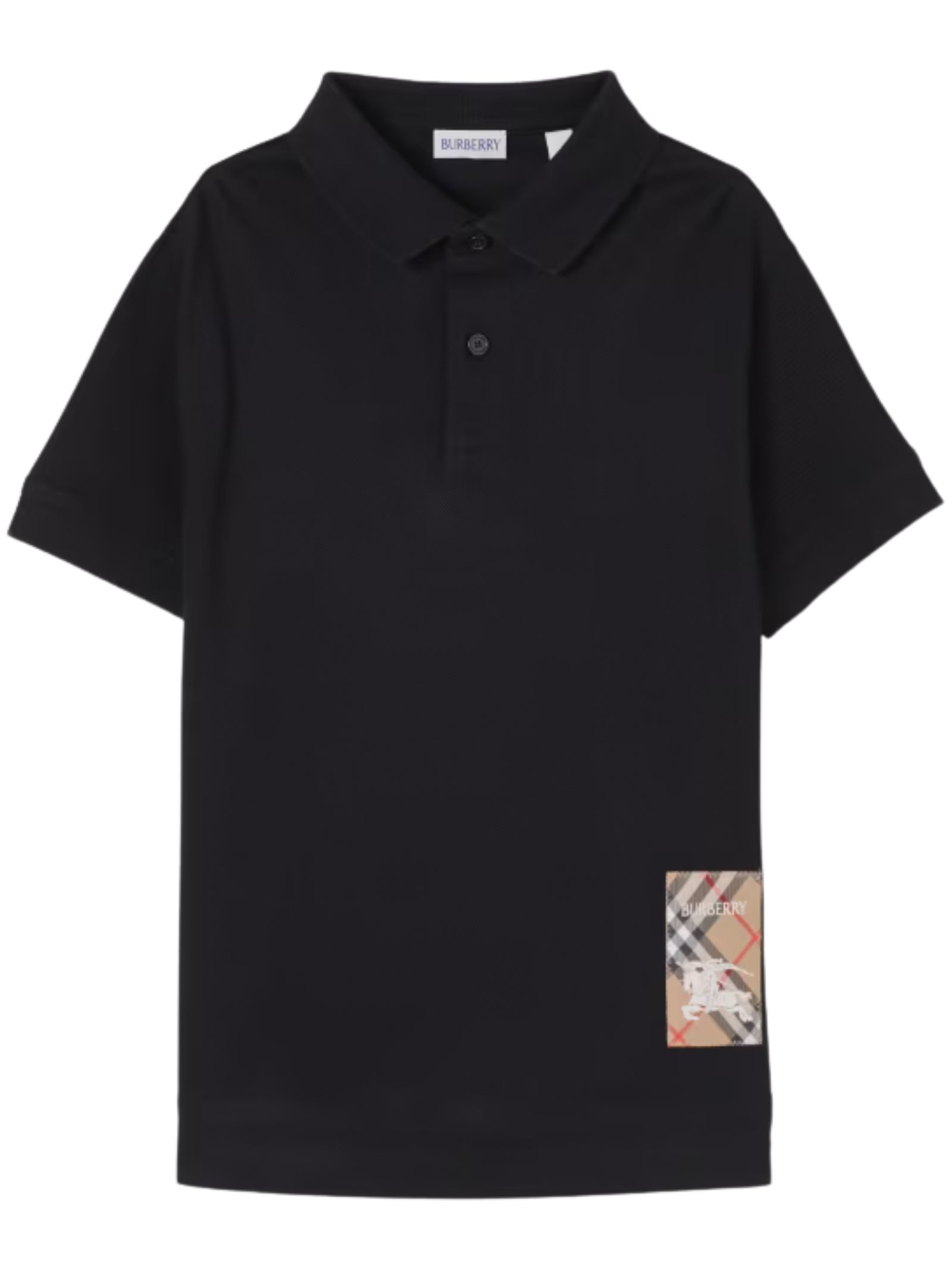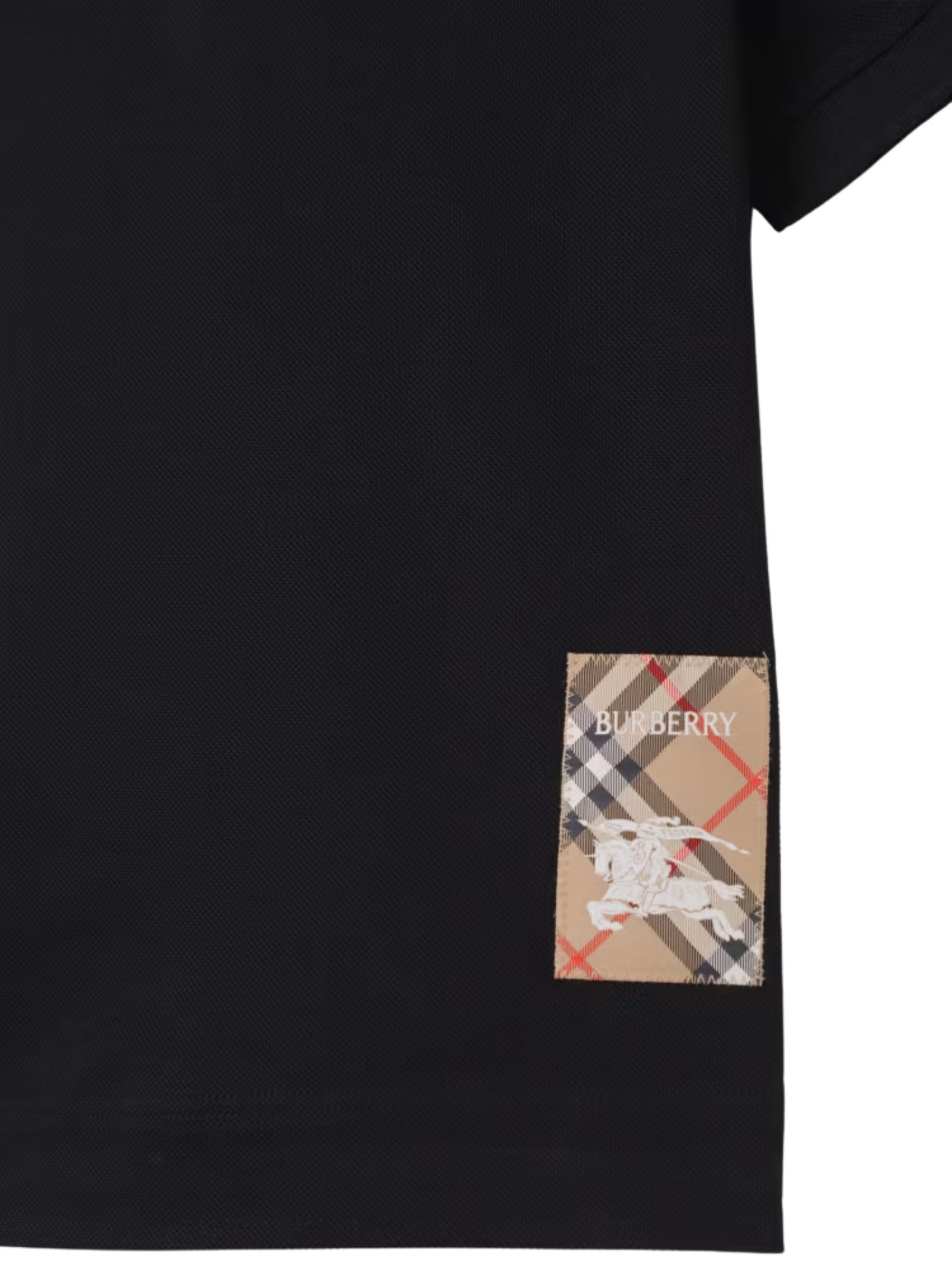 Burberry Kids polo di colore nero, realizzata in cotone piquet, maniche corte, patch caratteristico motivo Equestrian Knight applicato su un lato, spacchetti laterali, orlo dritto con dettaglio retro più lungo. Composizione: 100% cotone