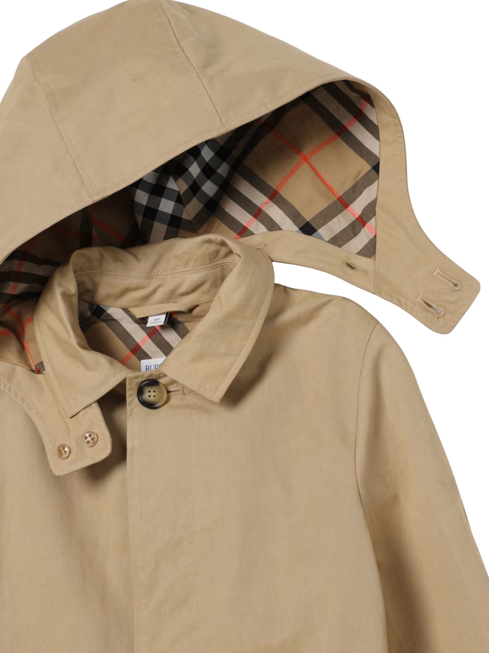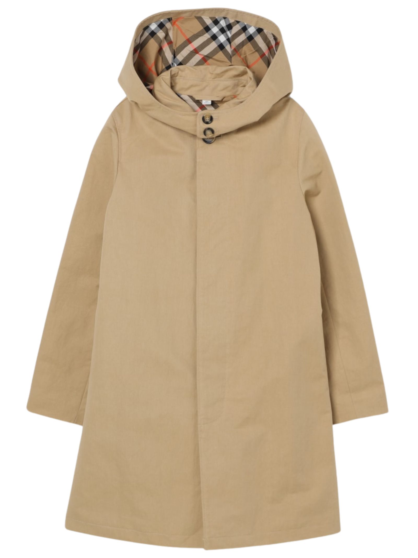 Burberry Kids trench reversibile di colore beige/vintage check, design lungo, impermeabile, maniche lunghe, abbottonatura frontale nascosta, cappuccio rimovibile. Composizione: 53% poliestere 47% cotone