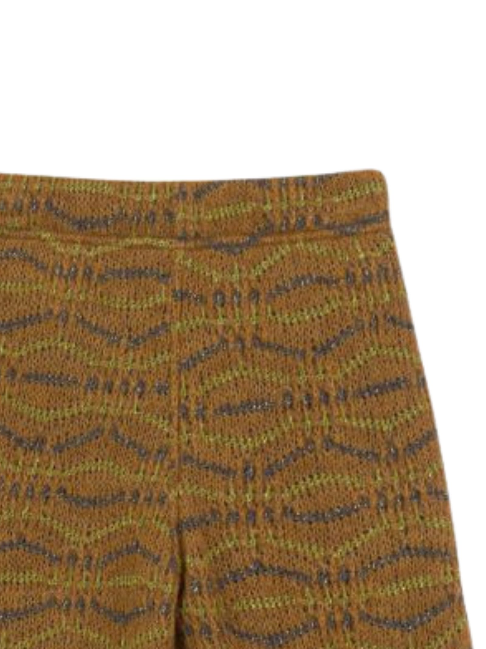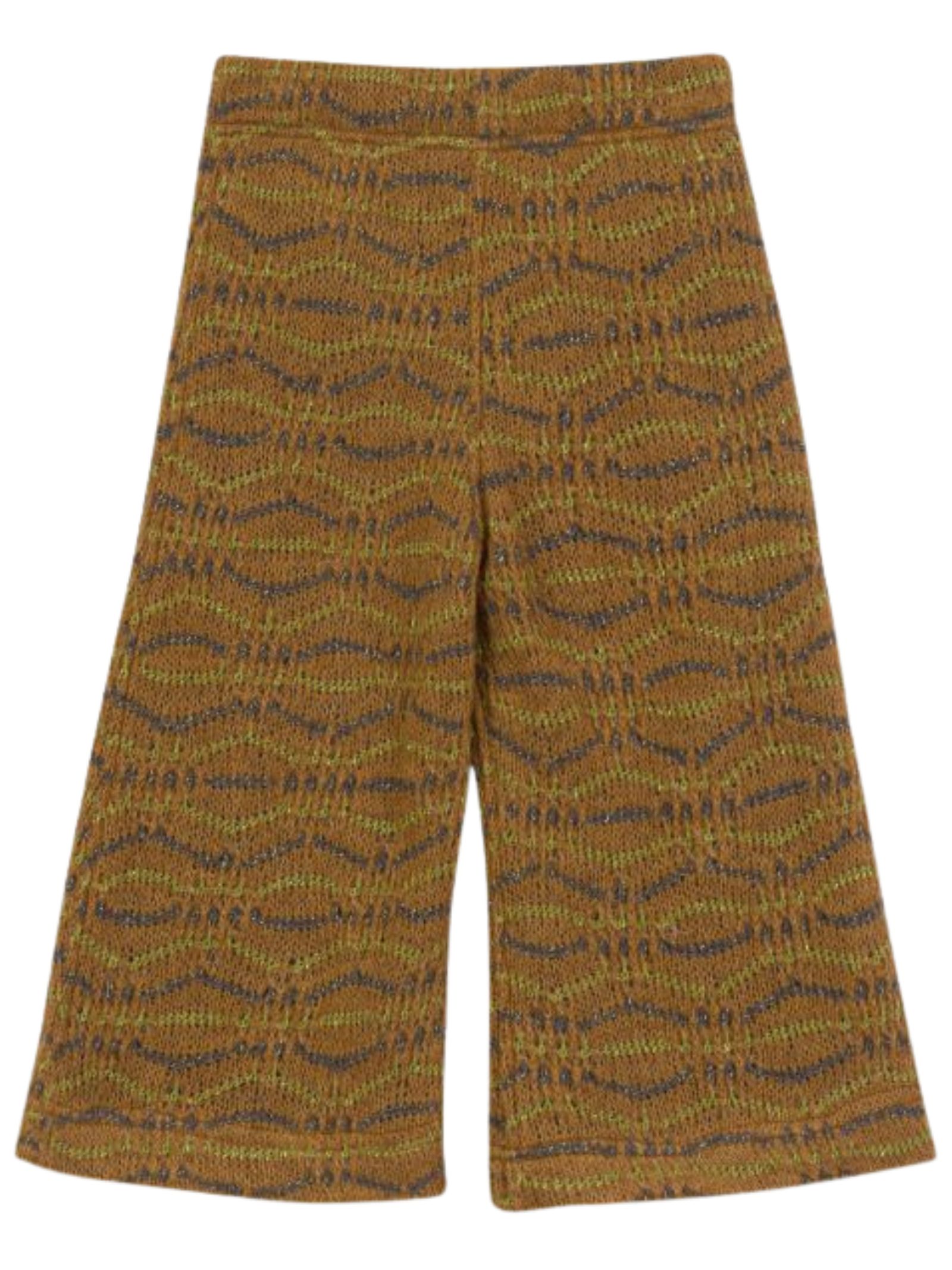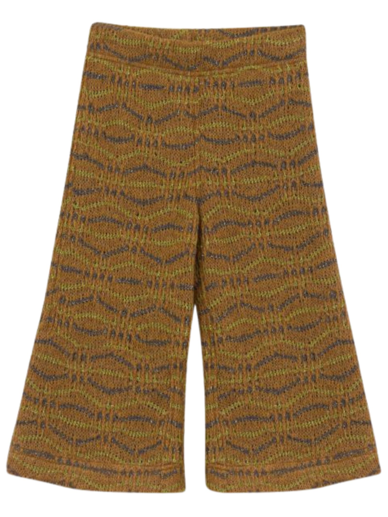 Caffè d'Orzo Kids pantalone di colore beige in fantasia a contrasto grigio/giallo con dettaglio lurex, modello slip-on con elastico in vita, design svasato con gamba ampia. Composizione: 38% Cotone 33% poliestere 17% poliammide 4% poliestere metallizzato 4% lana 4% viscosa. Made in Italy