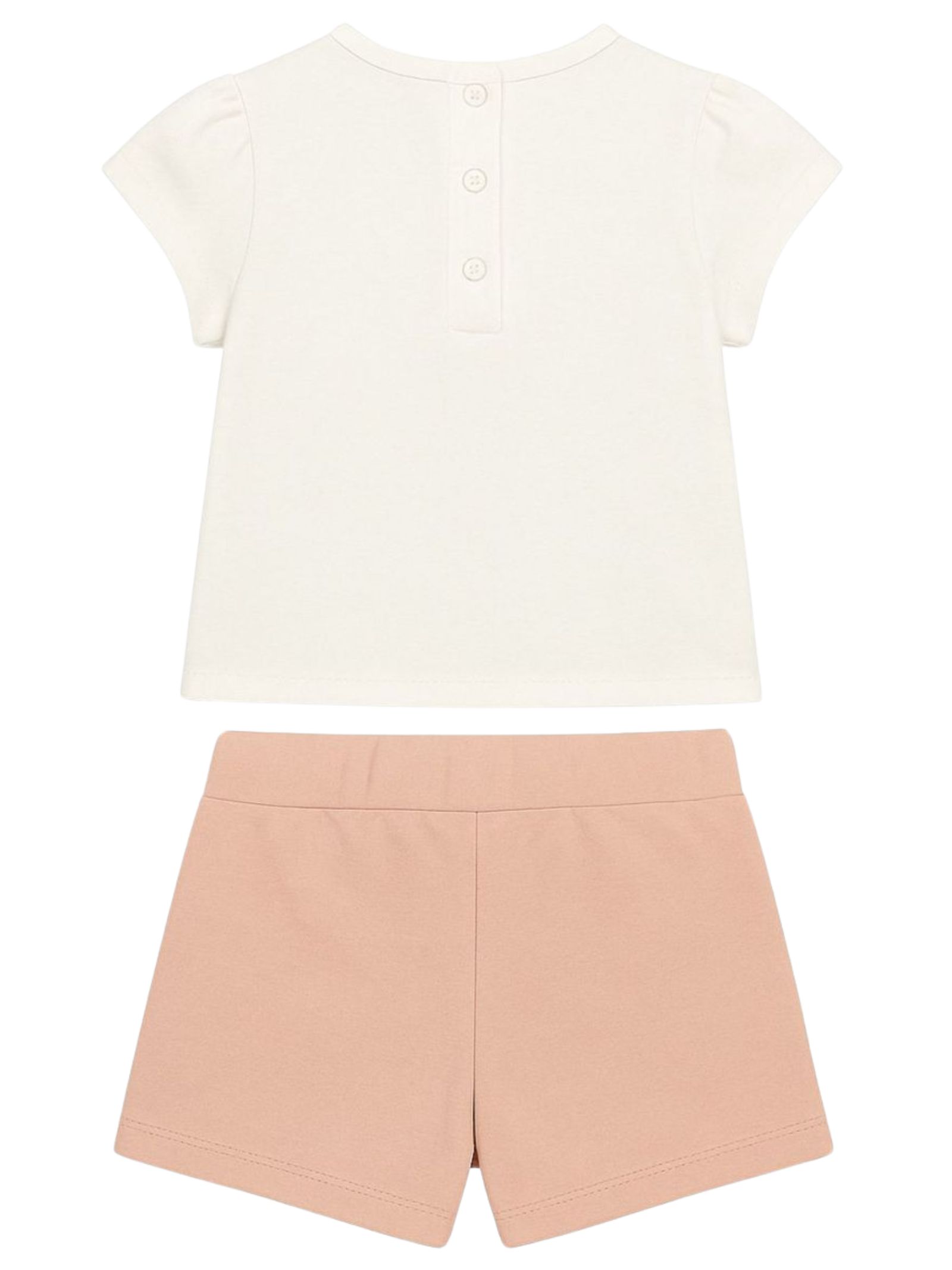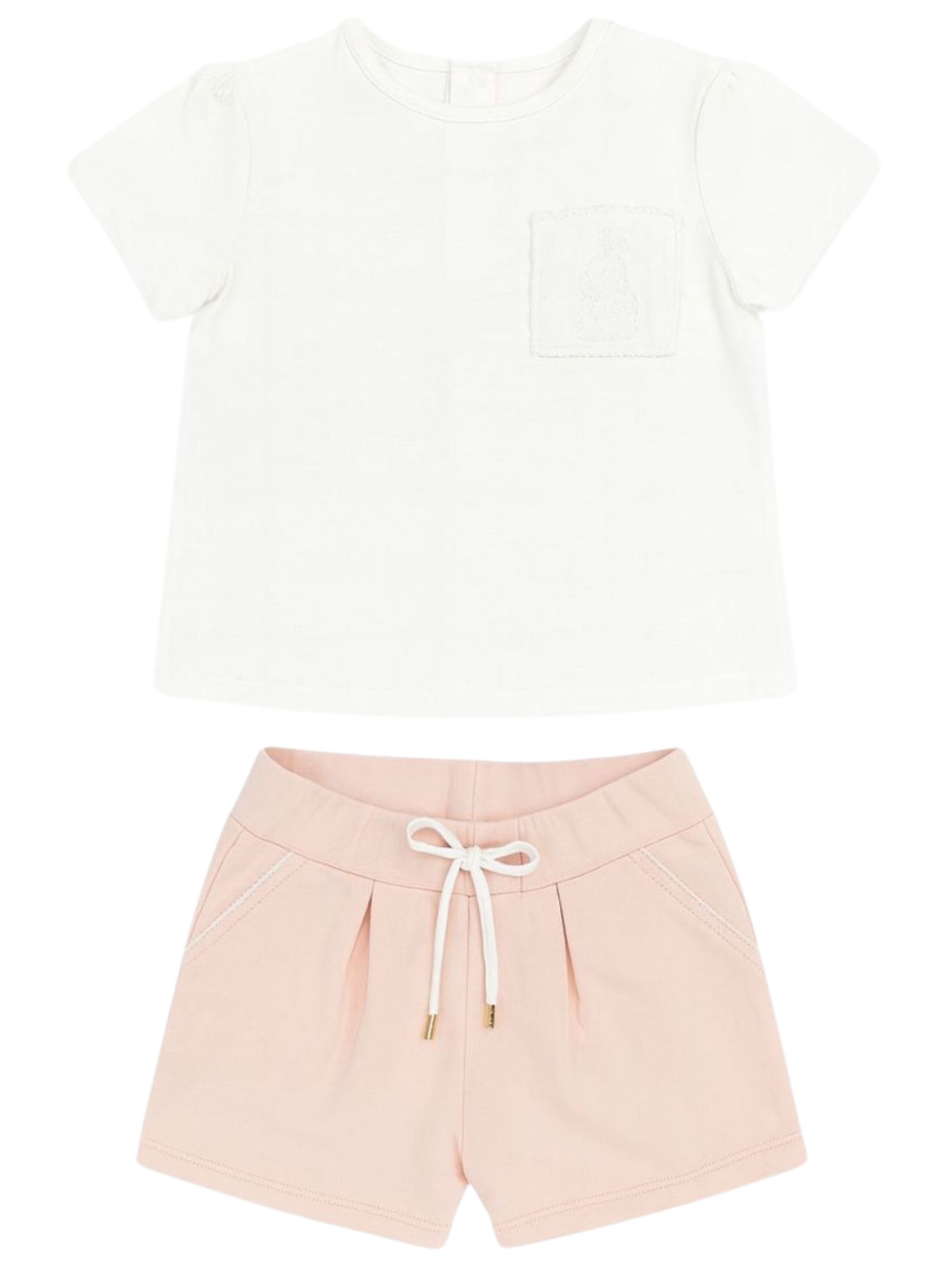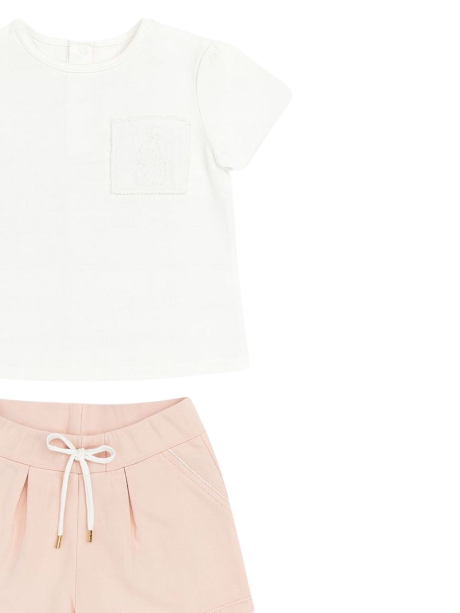 Chloè Kids completo composto da t-shirt di colore bianco, modello girocollo, mezza manica, taschino sul petto con ricamo logo, apertura con bottoni a clip sul retro; shorts abbinati di colore rosa, vita elastica con coulisse, vestibilità regolare. Composizione: 100% cotone